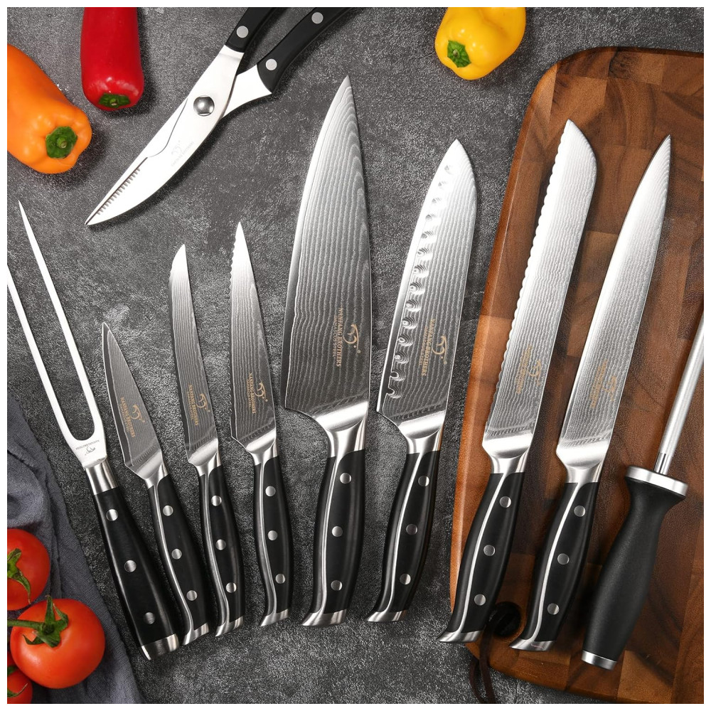CONJUNTO COMPLETO TUDO EM UM O conjunto profissional de facas de Damasco para cozinha inclui faca de chef de 20 centímetros, faca de corte de 20 centímetros, faca de pão de 20 centímetros, faca Santoku de 18 centímetros, faca utilitária de 14 centímetros, faca de aparar de 9 centímetros, 6 facas de bife, garfo para carne de 15 centímetros, tesoura de cozinha, afiador de facas para ficar afiado e bloco de madeira natural. Nada é mais essencial para um cozinheiro do que um bom conjunto de facas.
