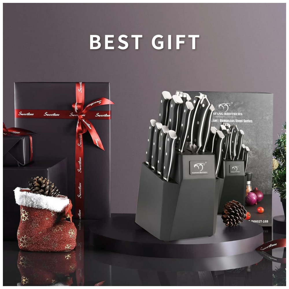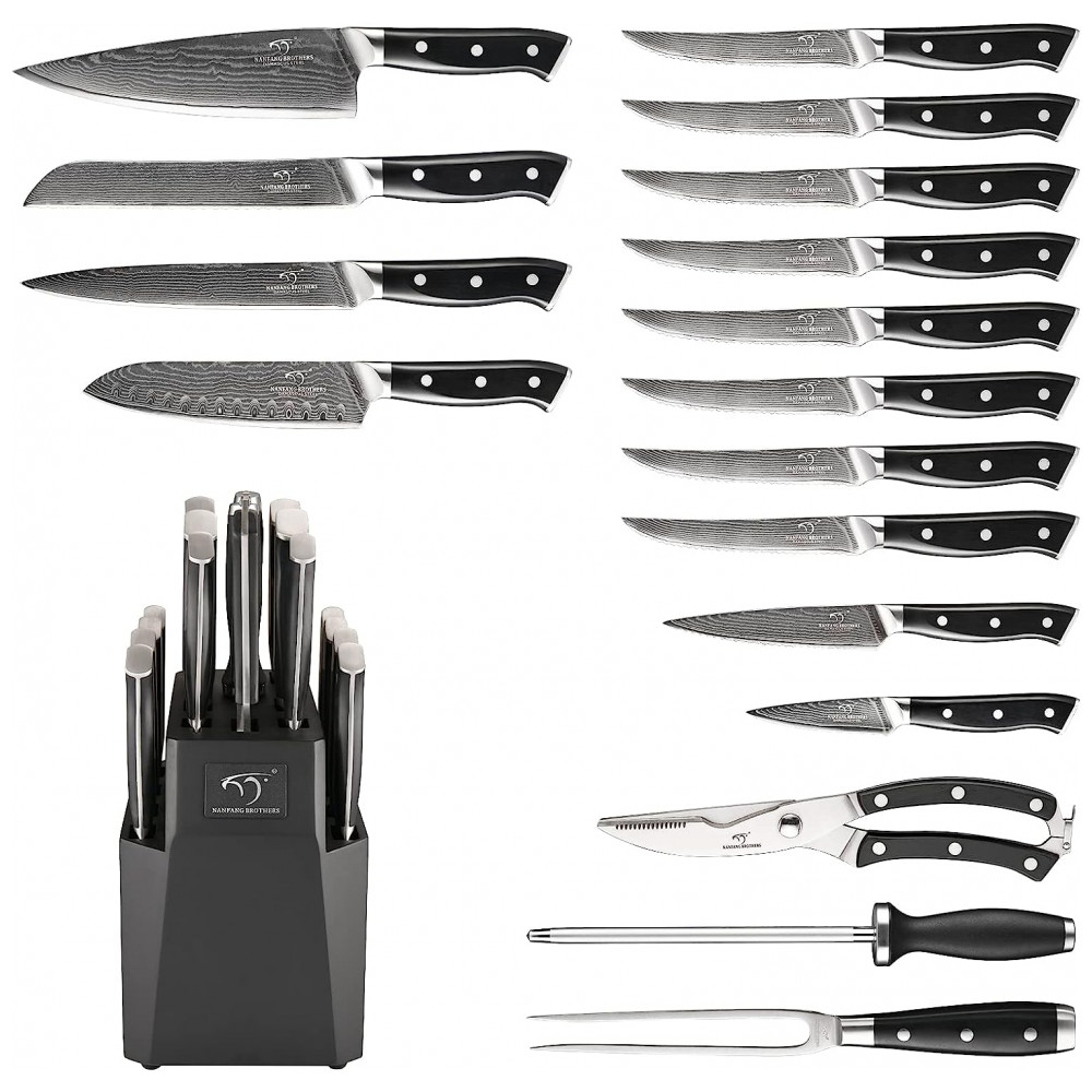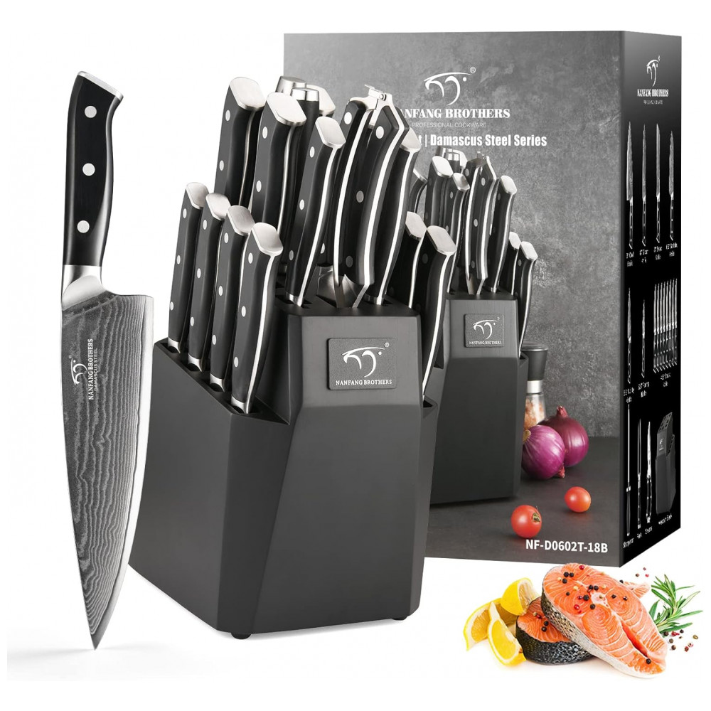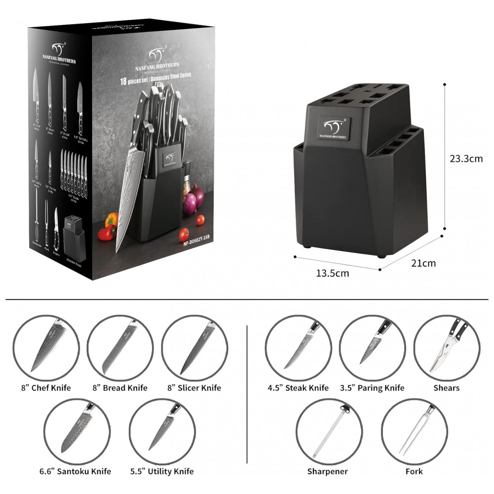Conjunto de Facas em Aço Damasco VG10 com Bloco de Bancada e Cabo Ergonômico 18 Peças NANFANG BROTHERS Preto