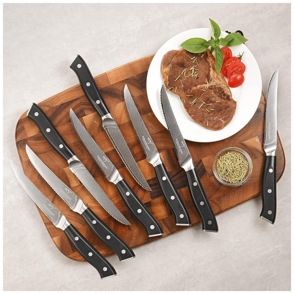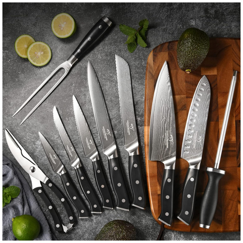 CONJUNTO COMPLETO TUDO EM UM O conjunto profissional de facas Damasco inclui faca de chef de , faca de fatiar de , faca de pão de , faca Santoku de , faca utilitária de , faca de descascar de , faca de bife de 8 peças de , Tesoura de cozinha, garfo de trinchar, afiador de facas para ficar afiado e bloco de madeira.