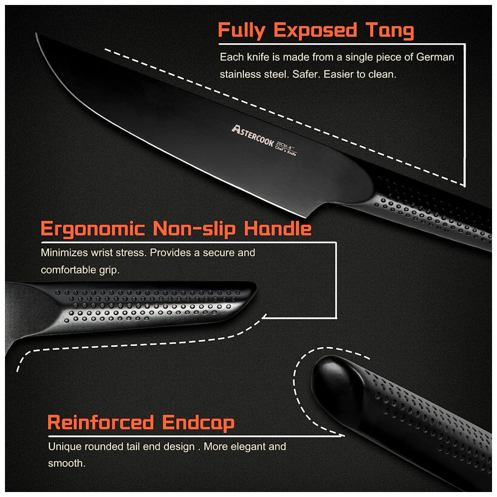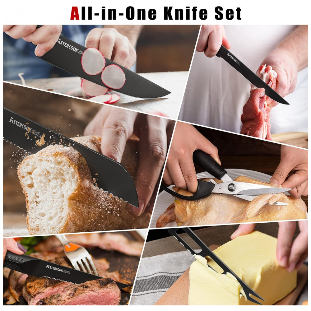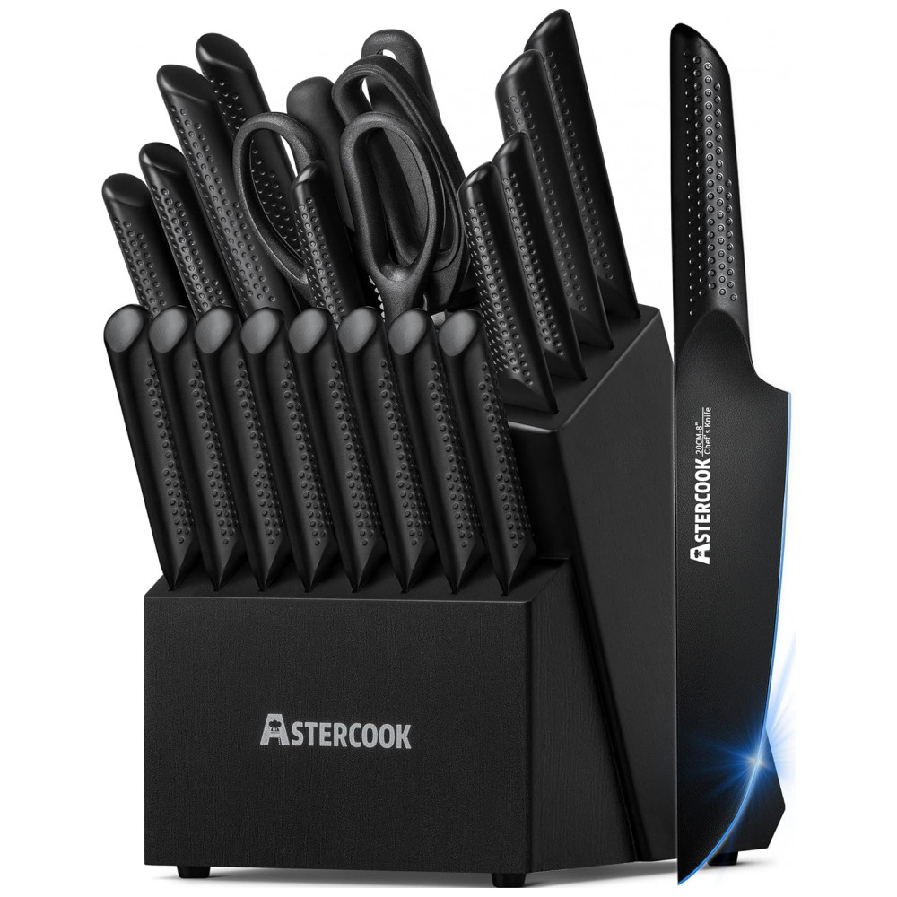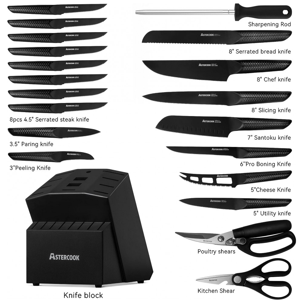 Conjunto de Facas em Aço Inoxidável Alemão com Bloco de Bancada 21 Peças Astercook Preto