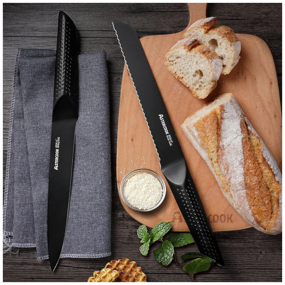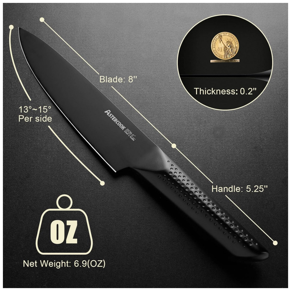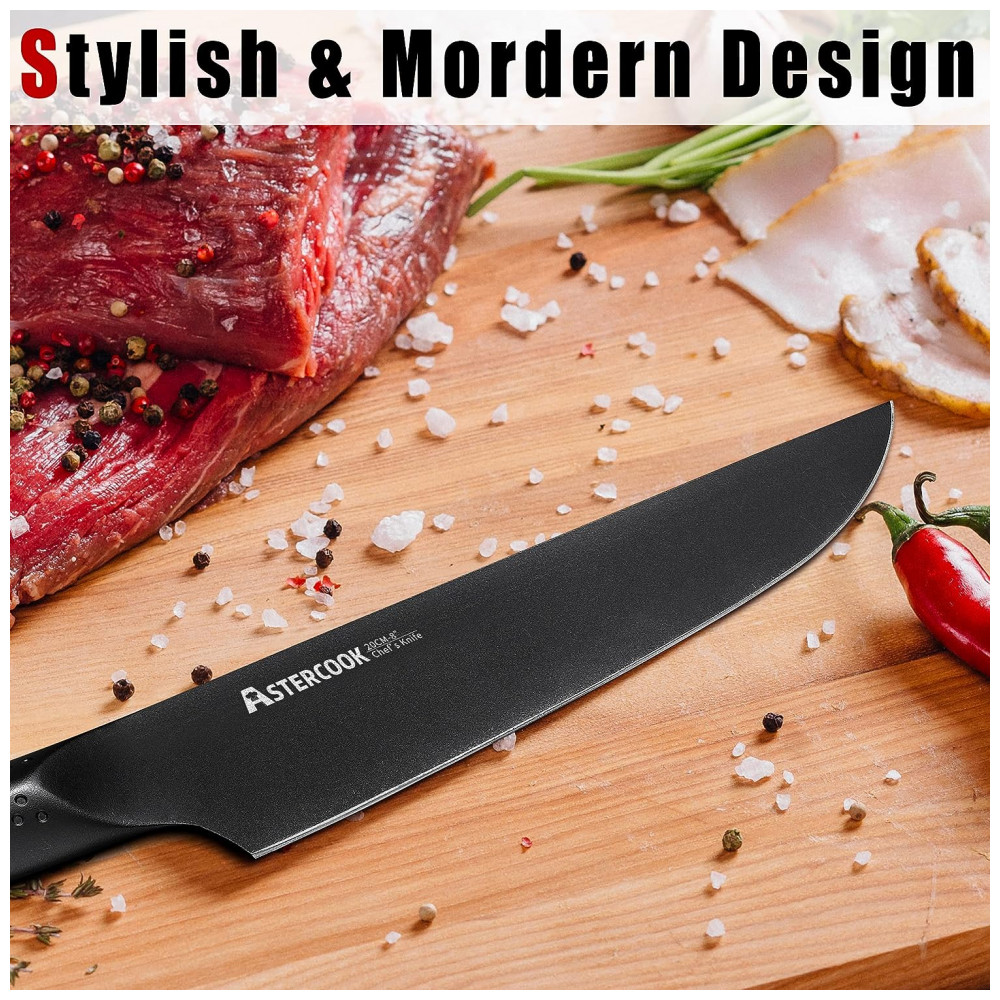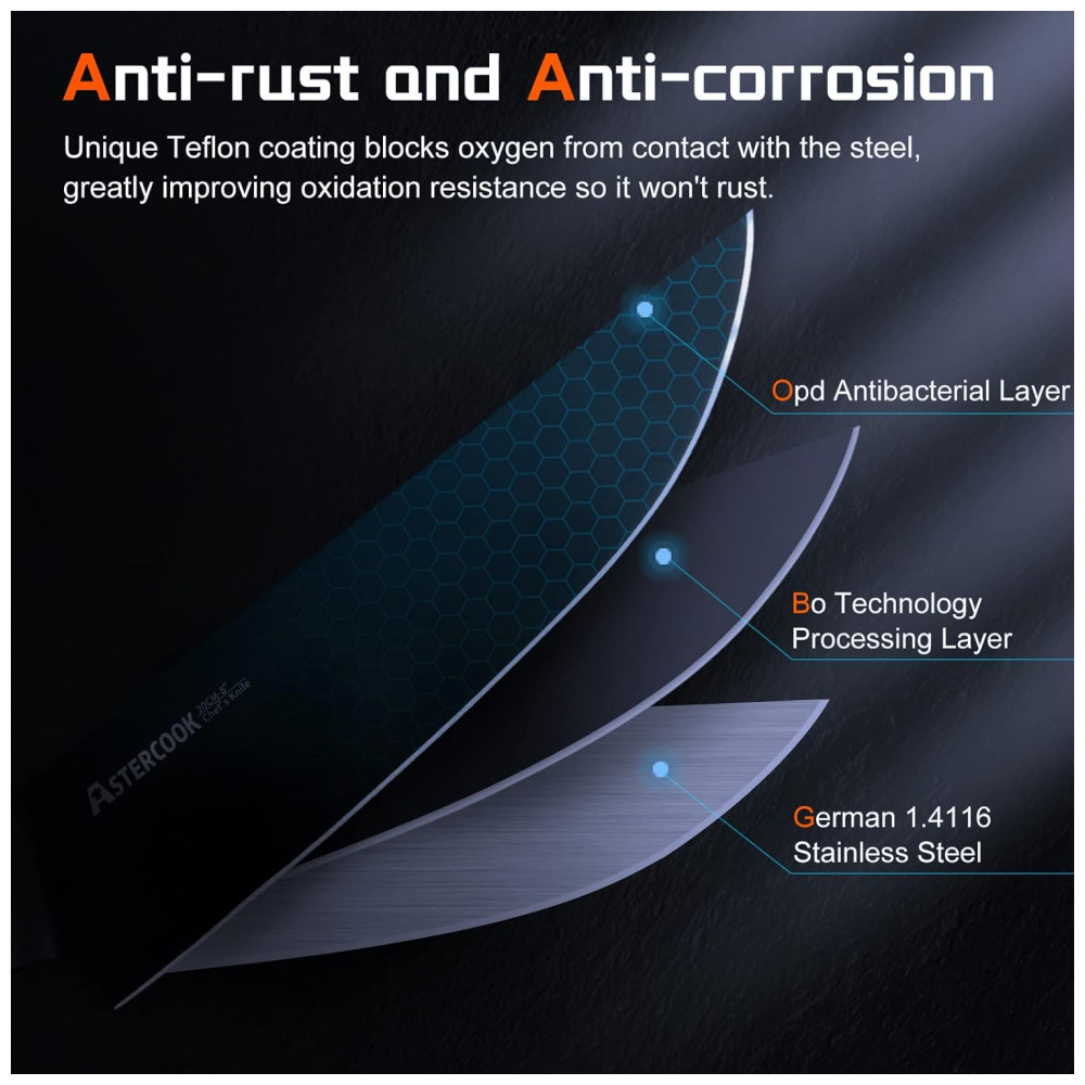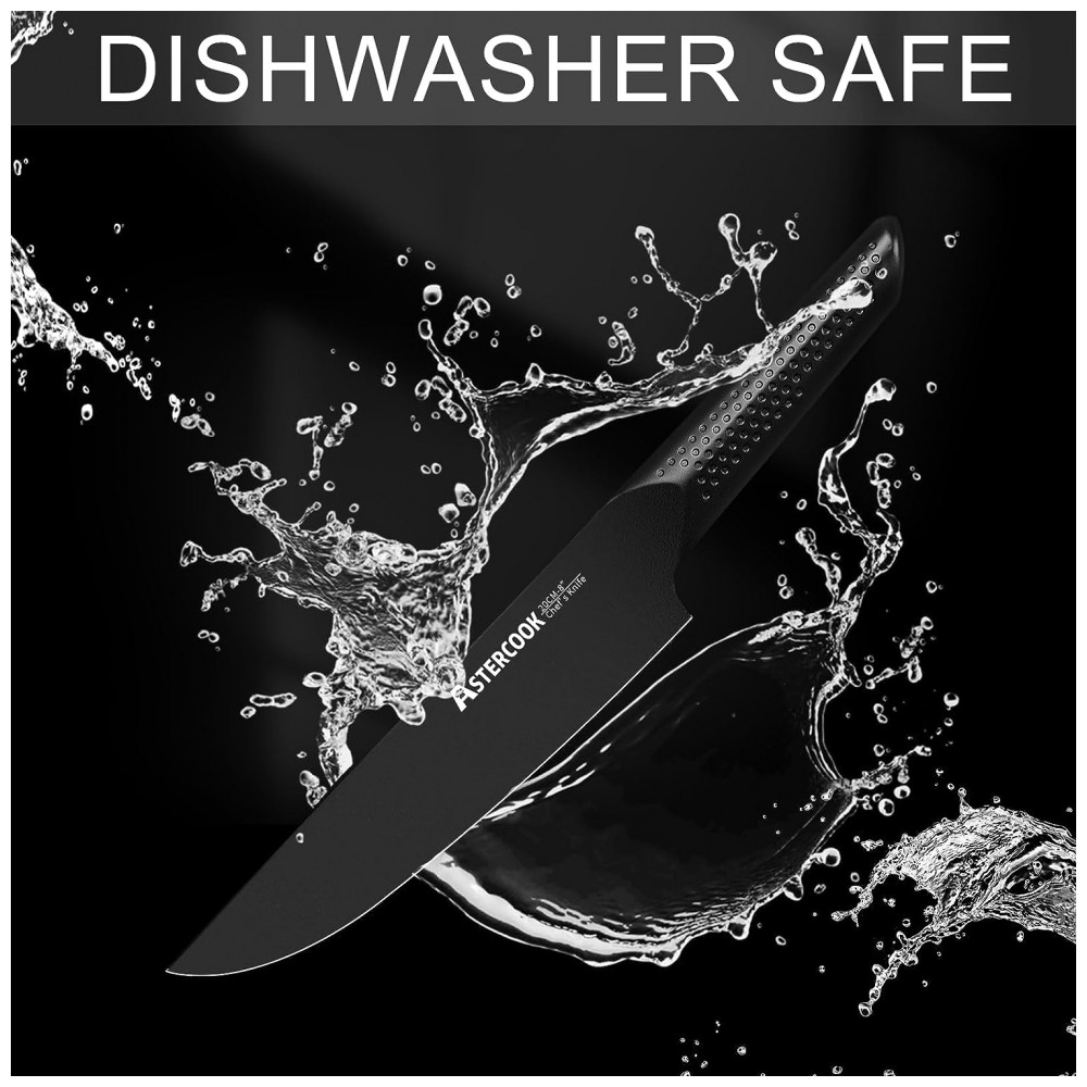 Afiado, antiaderente e resistente à ferrugem O conjunto de facas de cozinha pretas usa um revestimento exclusivo de Teflon antiferrugem, antiaderente e antioxidante, para que a lâmina esteja sempre nas melhores condições, extremamente fácil de limpar, estendendo se bastante a vida da faca.
