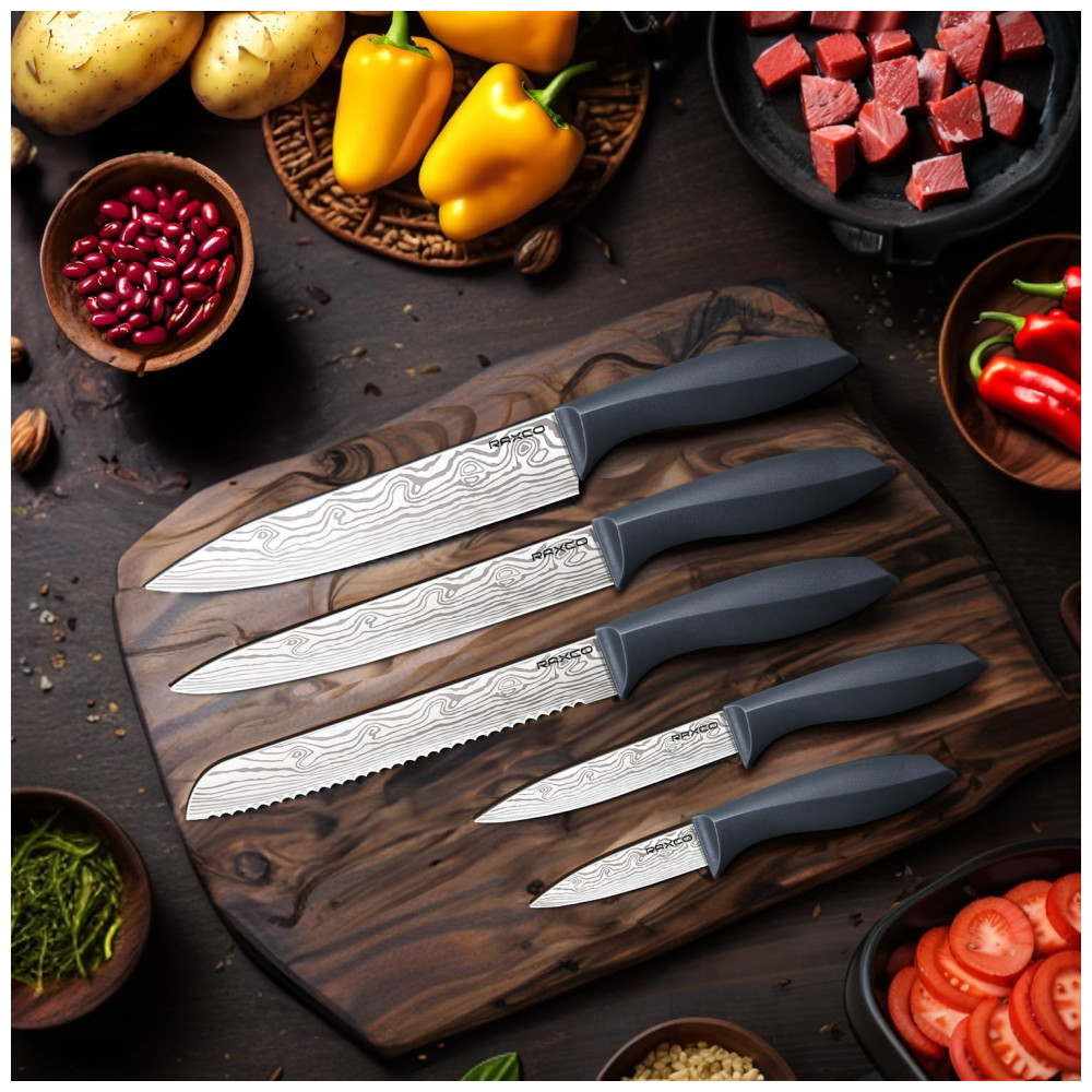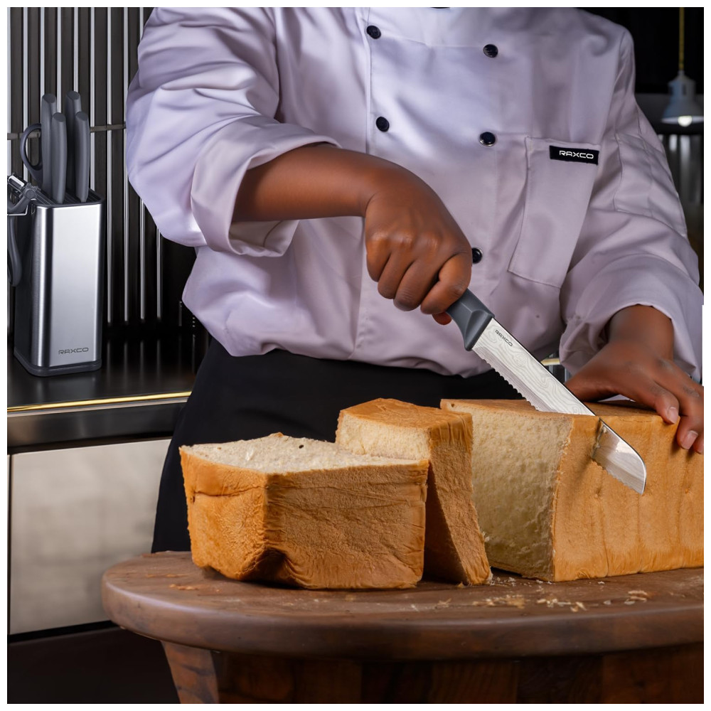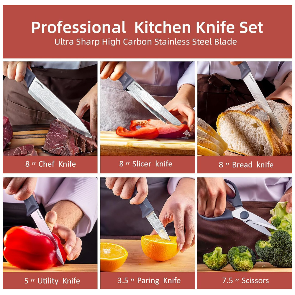 Conjunto de facas de cozinha incluindo faca de chef de , faca de aparar de , faca de pão de , faca de fatiar de , faca utilitária de , porta faca de aço inoxidável zenamento conveniente de facas de cozinha.