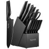 O conjunto inclui: faca de chef, faca de fatiar, faca Santoku, faca utilitária, faca de descascar, facas para bife 4, aço para afiar, tesoura doméstica, bloco