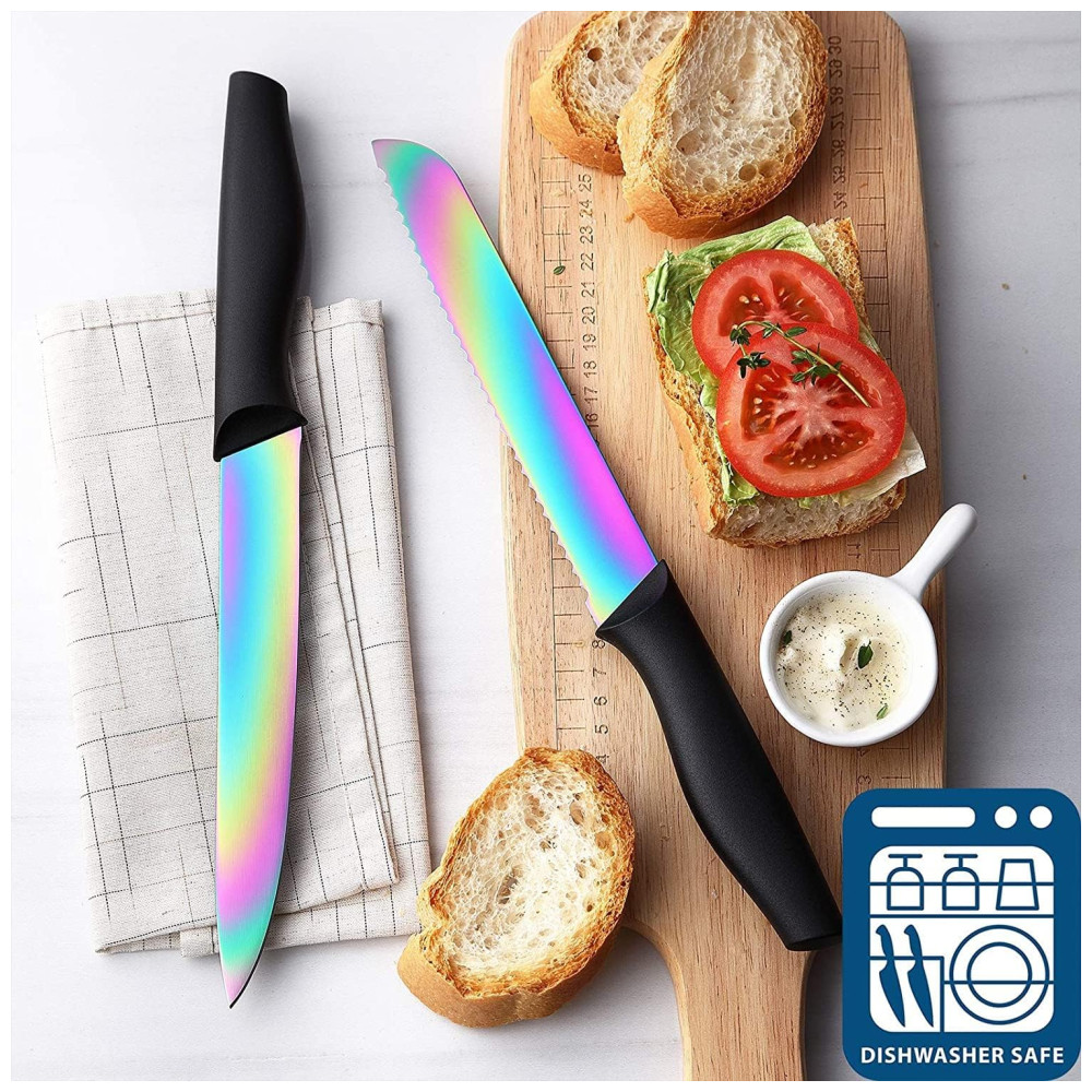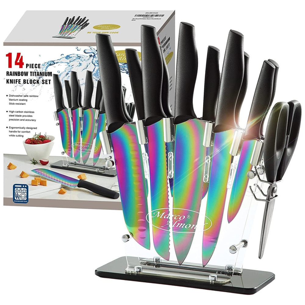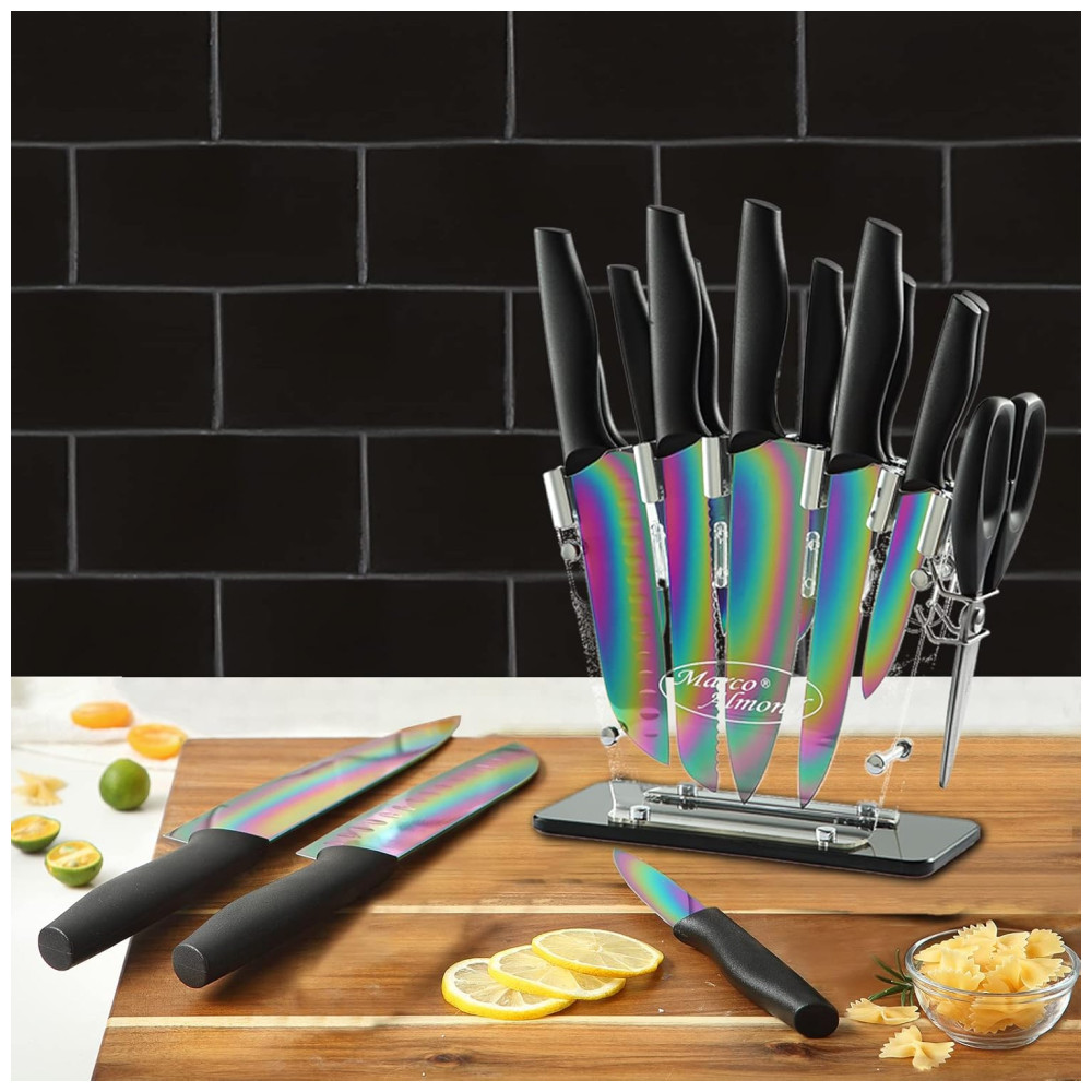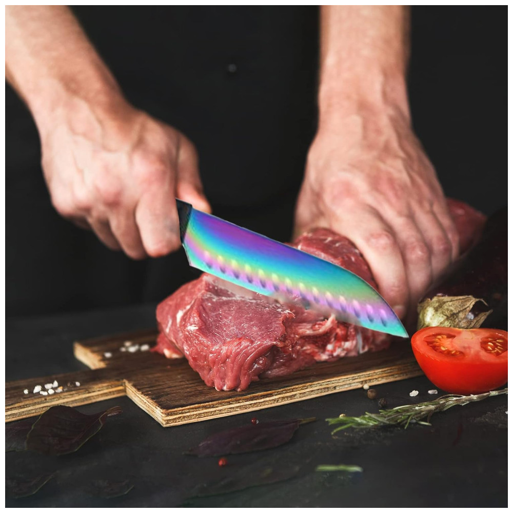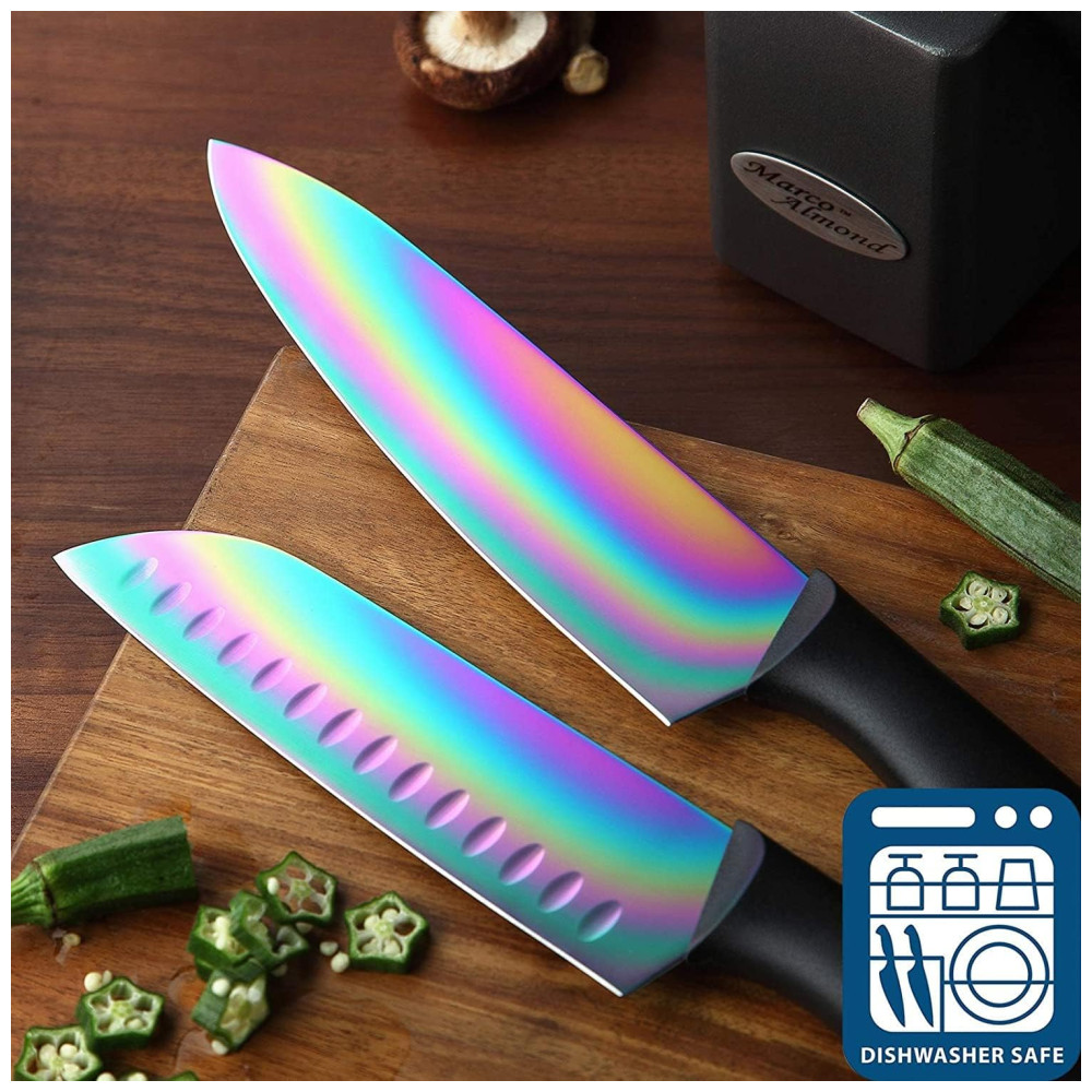 Conjunto de facas Rainbow Catching Os conjuntos de facas Marco Almond são feitos de aço inoxidável de qualidade premium para torná los duráveis e duradouros. Cada faca é revestida com titânio que cria um efeito de cor do arco íris muito suave. O material de aço inoxidável adiciona qualidade e o revestimento de titânio proporciona uma aparência e decoração muito bonitas como se fossem peças de arte.