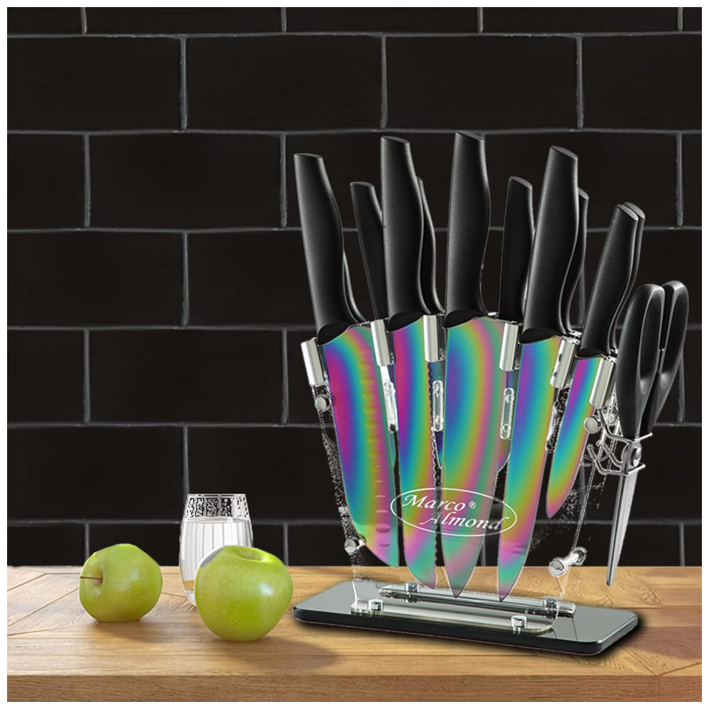 Suporte de acrílico moderno e prático Faca de amêndoa Marco O conjunto de facas de talheres de titânio Rainbow é composto por 8 tipos diferentes de facas para atender a todos os tipos de necessidade de corte em casa ou na cozinha de um restaurante. Todas as facas são seguradas em um suporte de acrílico transparente, essas facas de design inovador são simplesmente únicas. Cada um dos elementos dessas facas adiciona elegância e prova que essas facas não são apenas dispositivos na cozinha, mas podem adicionar a decoração de qualquer cozinha.