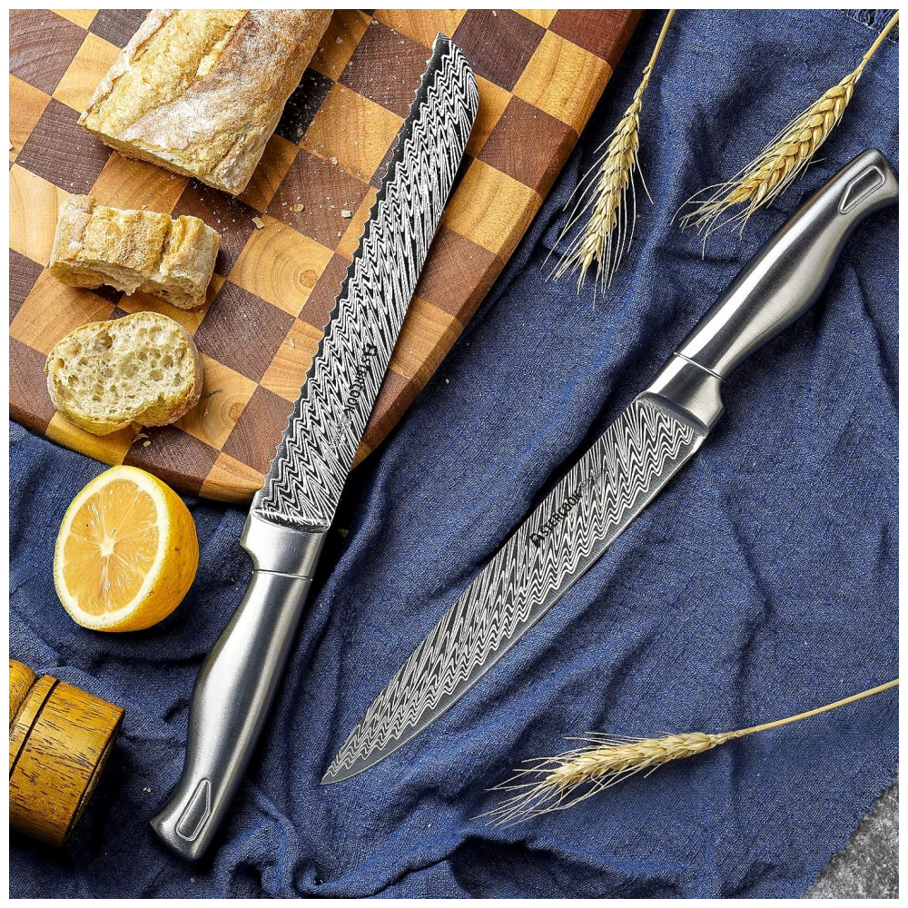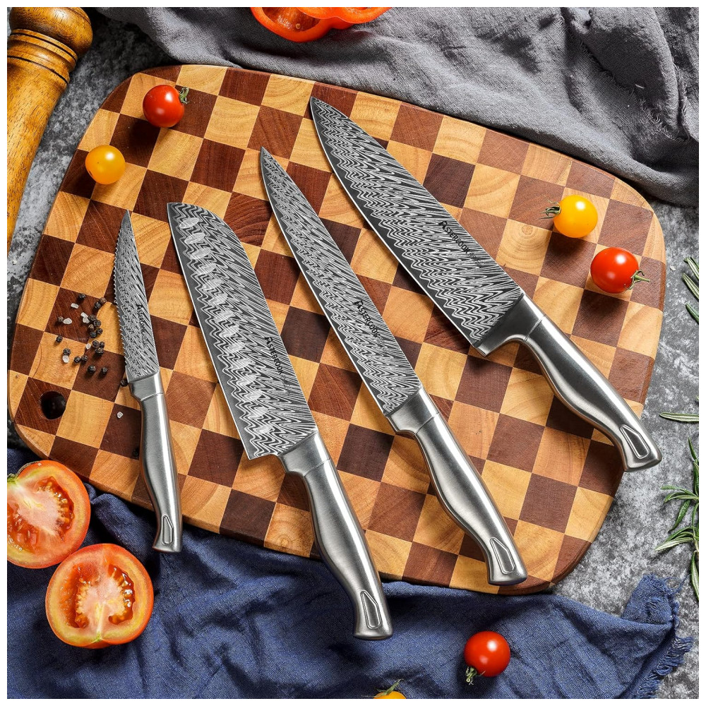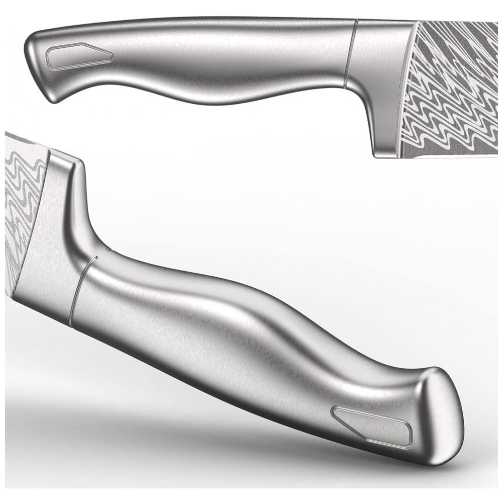 2 Feito inteiramente de aço inoxidável de alto carbono, este conjunto de facas de cozinha é preso por três rebites para maior durabilidade. As alças ergonomicamente projetadas proporcionam uma pegada confortável e as alças nunca se soltam ou caem.