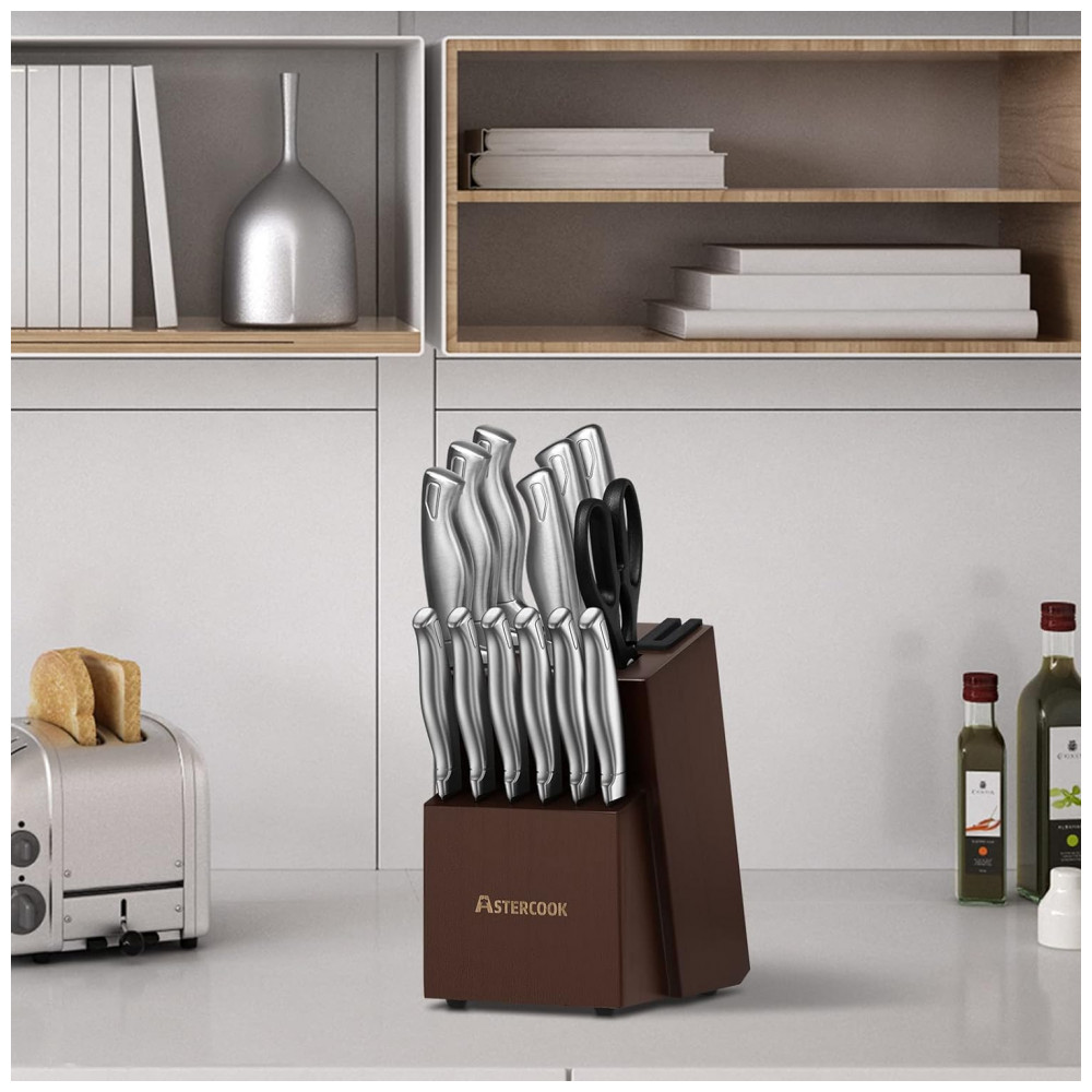 Conjunto de Facas em Aço Inoxidável com Bloco de Bancada 15 Peças Astercook Prata