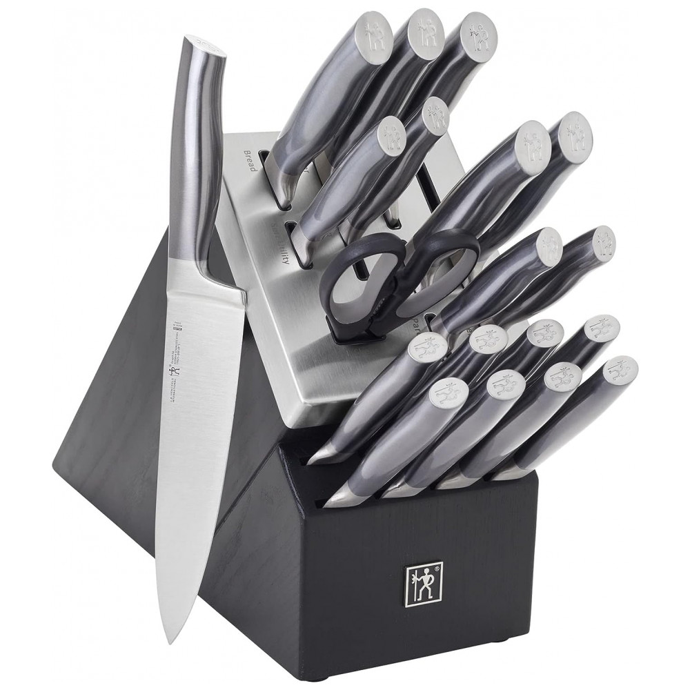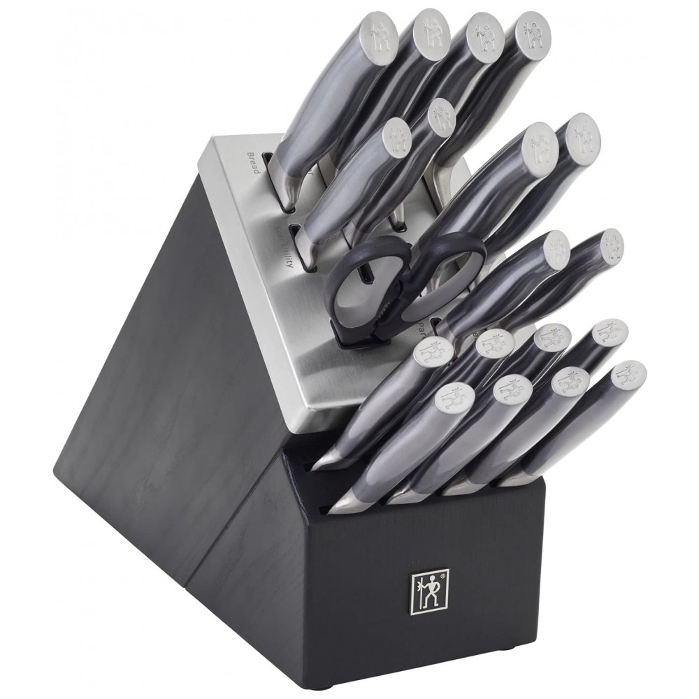 O conjunto de facas com bloco inclui: facas de aparar de 7,62 e 10,16 centímetros, utilidade serrilhada de 12,7 centímetros, preparação de 13,97 centímetros, utilidade de 15,24 centímetros, desossa de 13,97 centímetros, santoku de 17,78 centímetros, faca de chef de 20,32 centímetros, escultura de 20,32 centímetros, faca de pão de 20,32 centímetros, facas de carne de 20,32 x 11,43 centímetros, tesoura de cozinha e bloco autoafiável