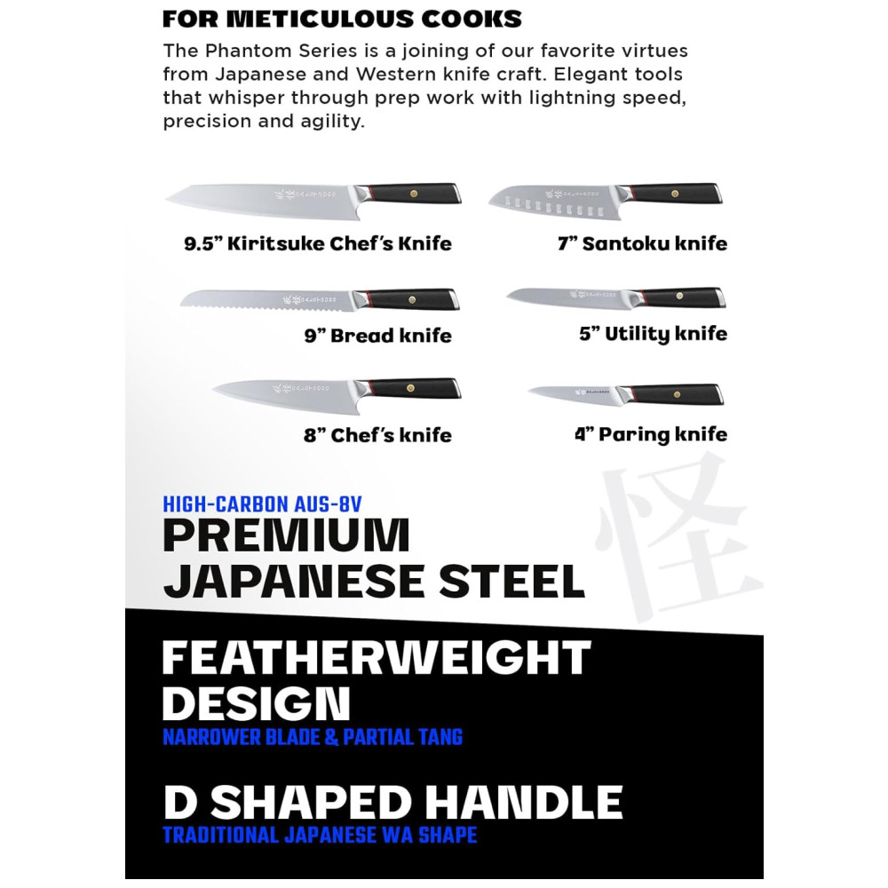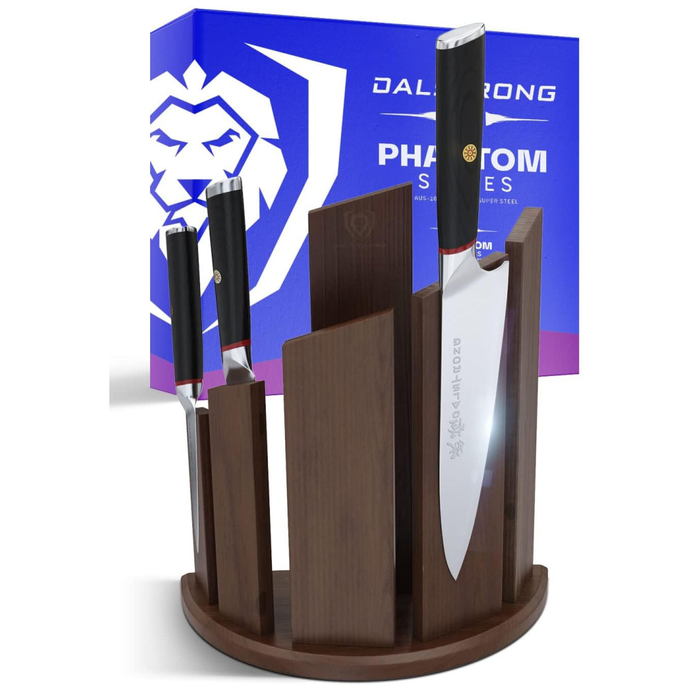 O Dalstrong Touch Espigão total e precisão forjada a partir de uma única peça de aço AUS 8 japonês temperado com gelo de alto carbono com dureza Rockwell 58, a Série Phantom apresenta nitidez, retenção de borda, resistência e durabilidade excepcionais. Lindamente gravada, a lâmina apresenta ainda uma lombada polida à mão e formato de reforço ergonômico para um aperto de aperto natural e suave