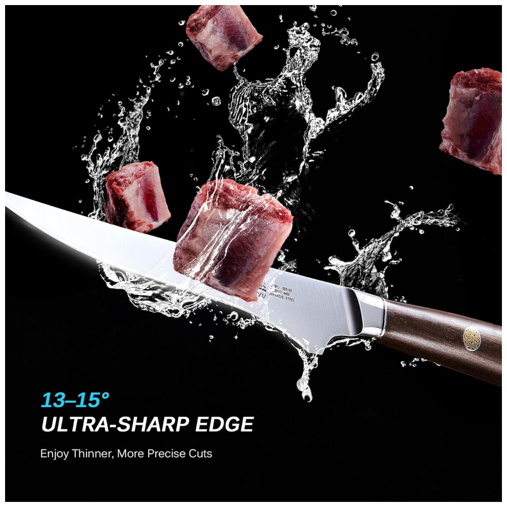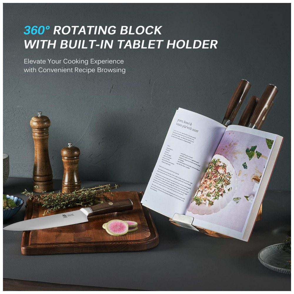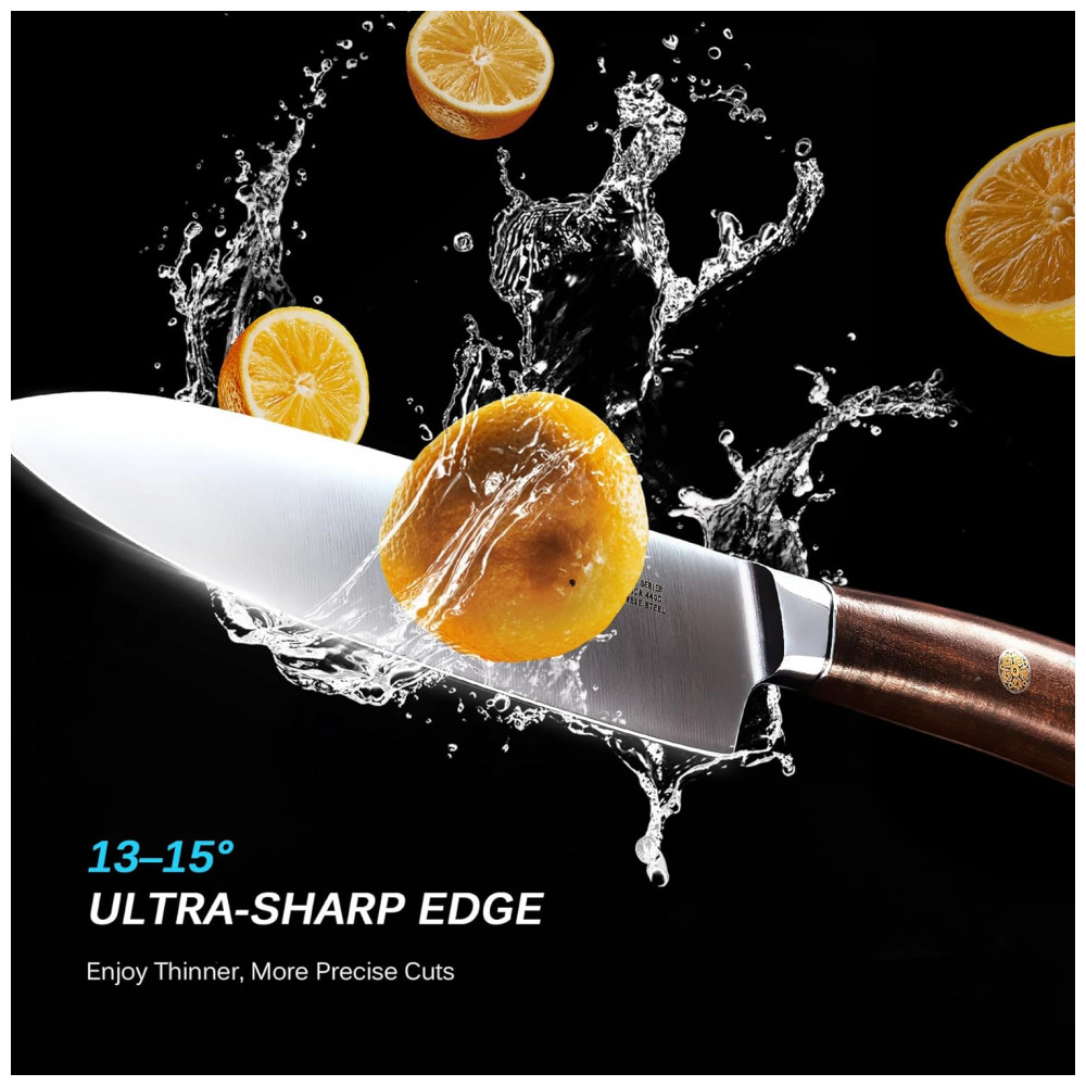 LÂMINAS ULTRA AFIADAS Afiadas em bordas de 13 a 15 graus, as facas deste conjunto de facas de cozinha com bloco oferecem cortes extremamente precisos em carne, frutas e vegetais a resistência HRC 59 60 do aço inoxidável oferece desempenho incomparável, resistência superior à corrosão e retenção excepcional da borda.
