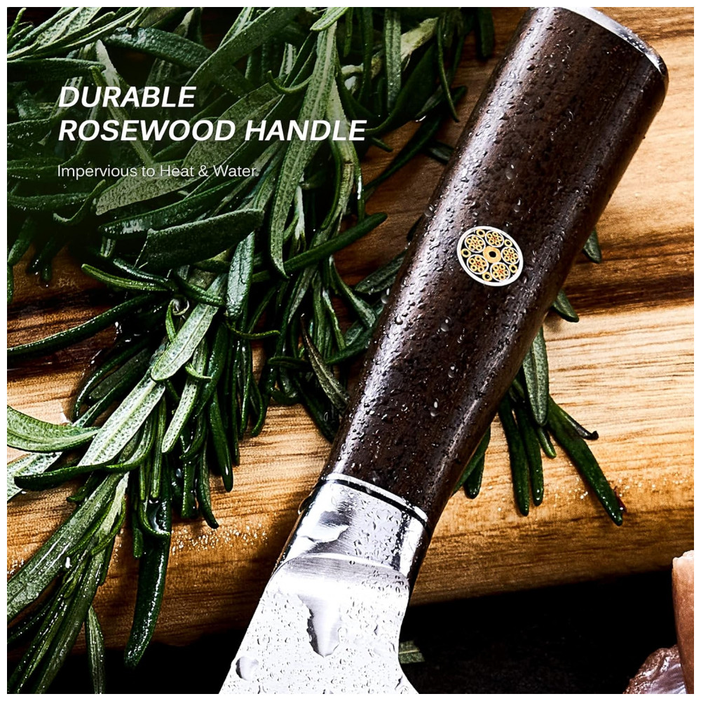 CAIXA E CABO DE ROSEWOOD O cabo de jacarandá cuidadosamente construído com seu pino de mosaico exclusivo resiste ao frio, calor, corrosão e umidade a bainha e o estojo fornecidos permitem que você preserve e guarde sua faca com a limpeza e o cuidado que ela merece.