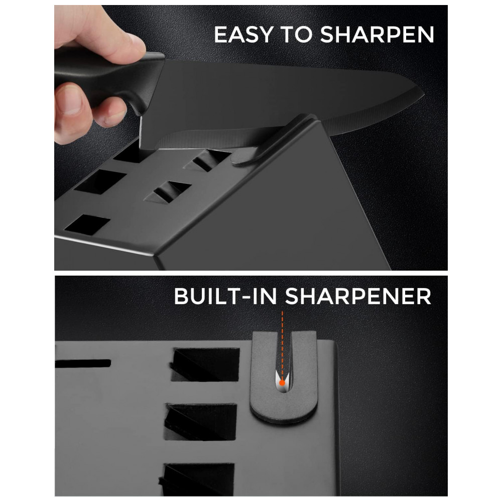 Apontador embutido exclusivo: este conjunto de facas de cozinha vem com um apontador embutido que é um bônus útil. Evita o incômodo de afiar lâminas em um aço de afiar.