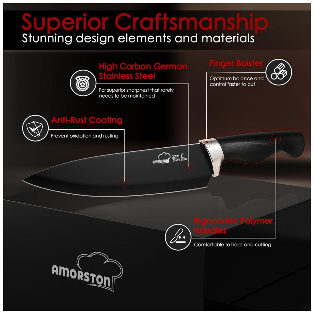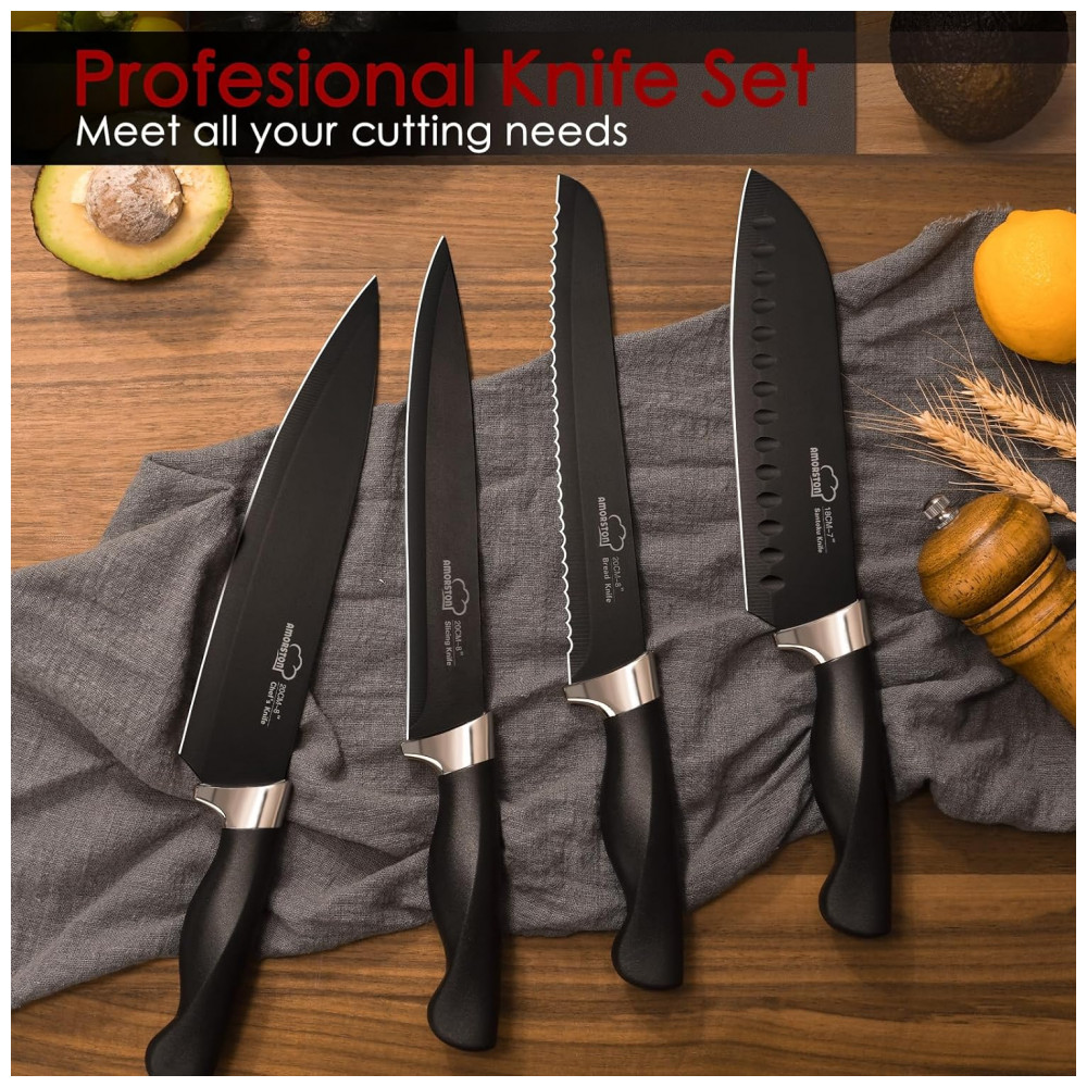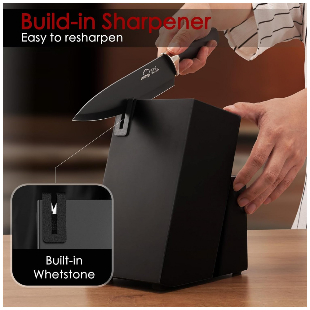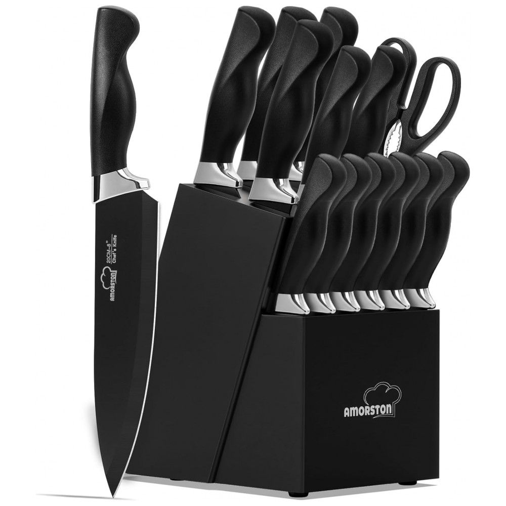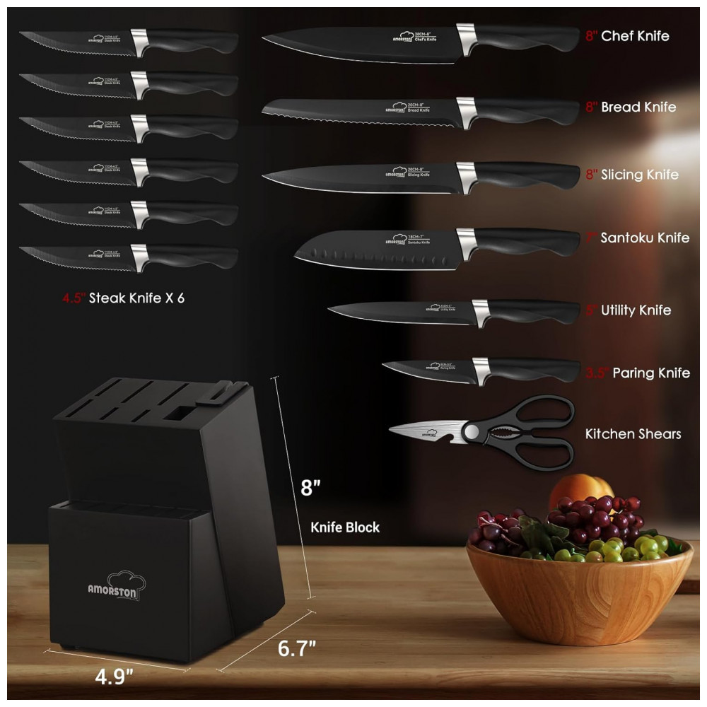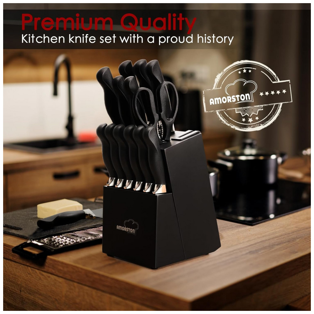Conjunto de Facas em Aço Inoxidável com Bloco de Bancada e Afiador Embutido 15 Peças Amorston Preto