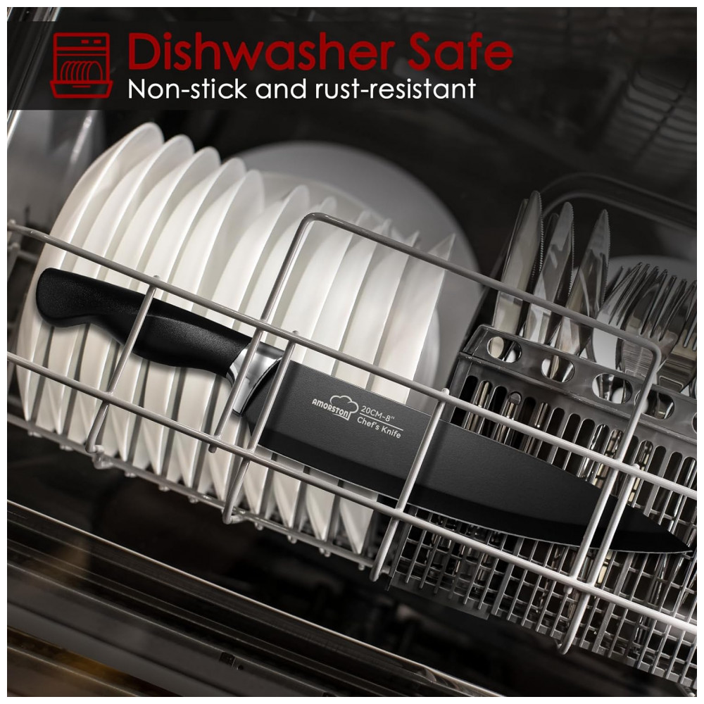 2 O revestimento preto na superfície do aço inoxidável faz um bom trabalho evitando que as facas oxidem em contato com o oxigênio do ar, de modo que o conjunto de facas de cozinha permanecerá antiaderente e à prova de ferrugem nos próximos anos.