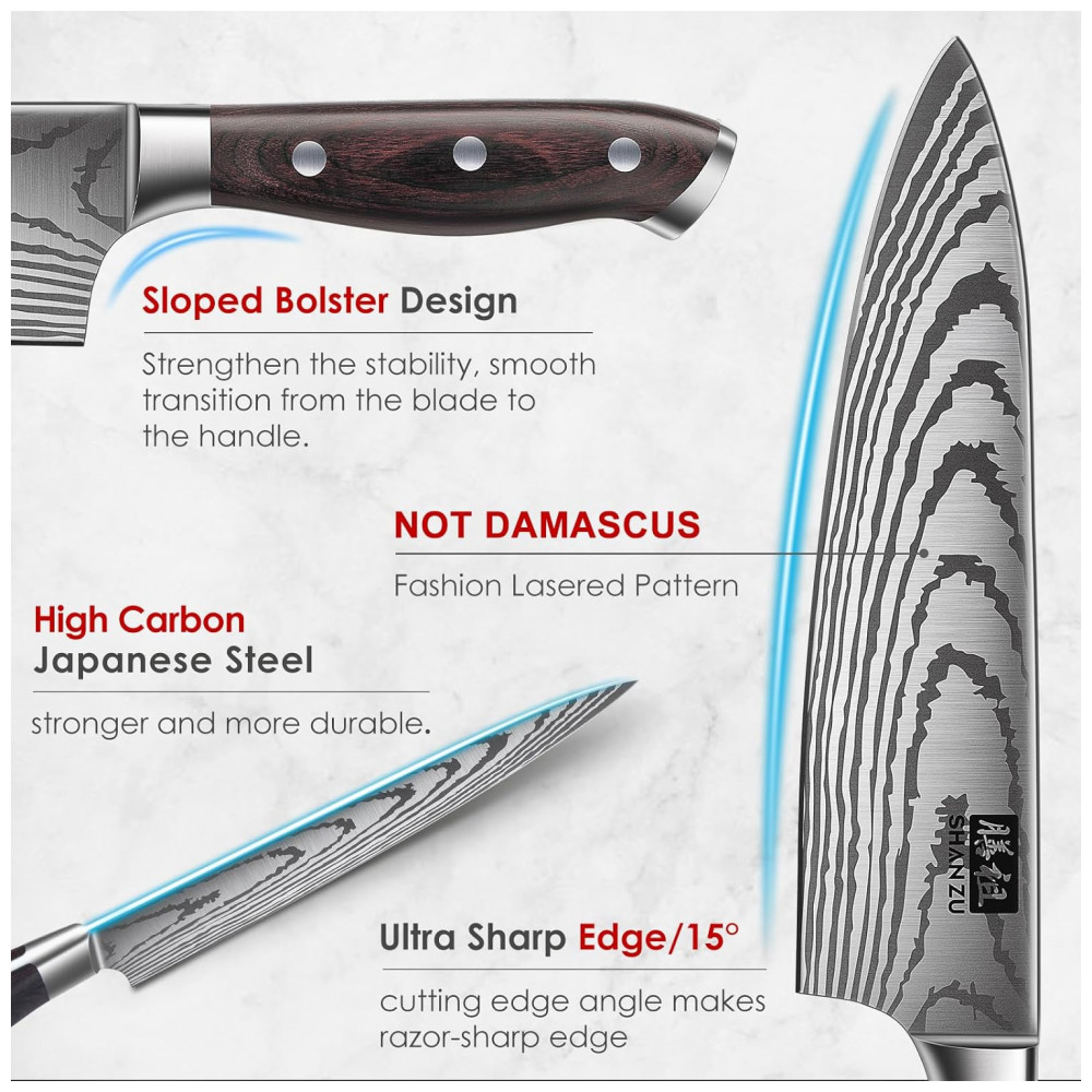 Cabo de madeira ergonômico clássico, confortável de segurar: O conjunto de facas de cozinha SHAN ZU adota o design de cabo com rebites triplos mais clássico e pakkawood de alta qualidade, combinado com o design Tang completo, o que lhes confere excelente durabilidade. A alça ergonômica fornece uma pegada flexível para um controle confortável. Minimize a fadiga enquanto maximiza a precisão do corte