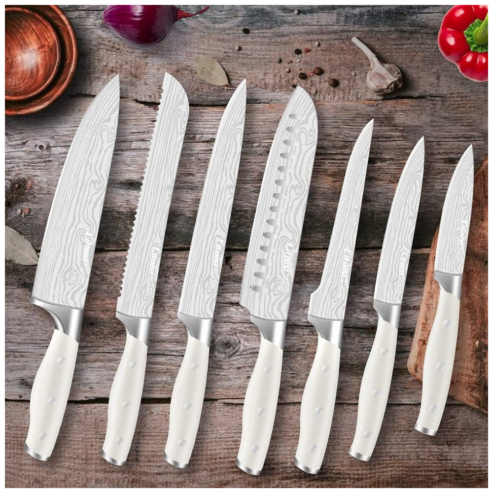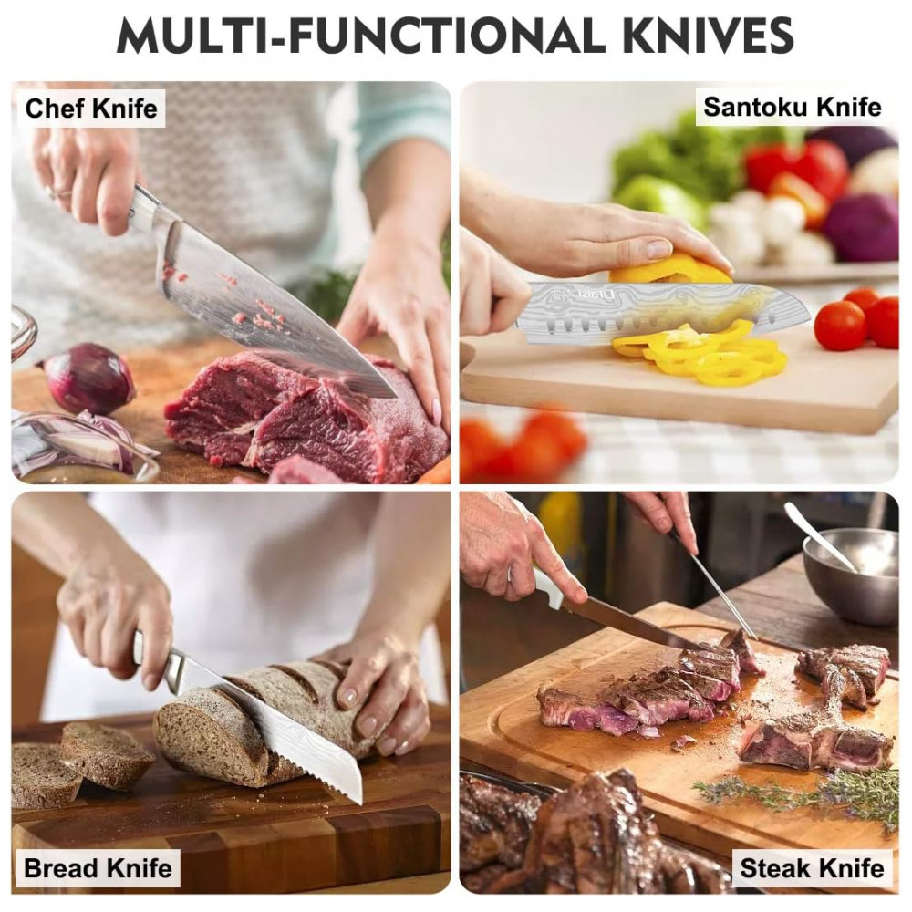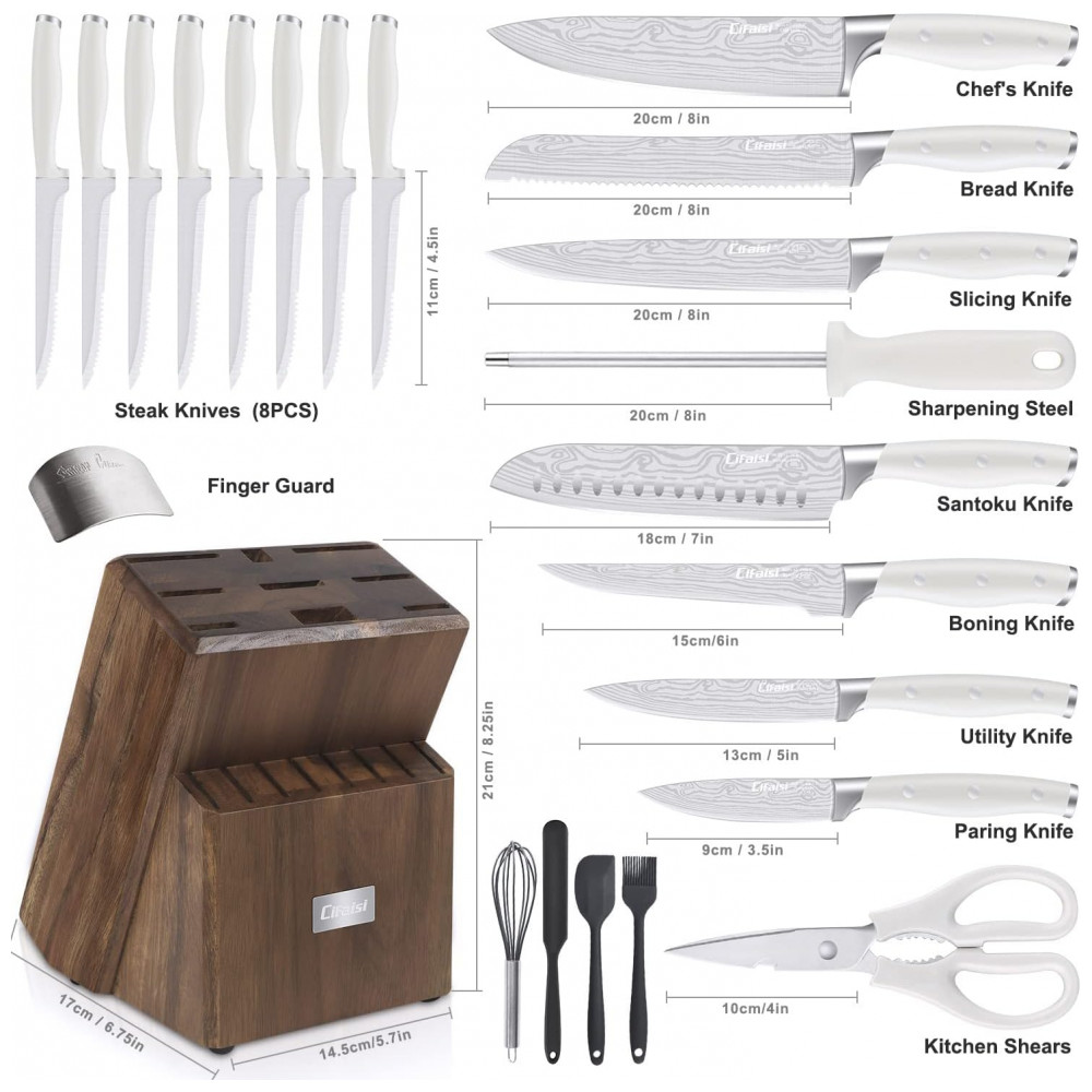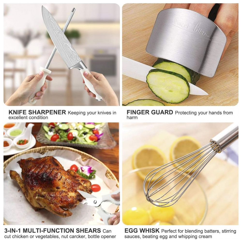 Conjunto de facas de cozinha multifuncional profissional Nosso conjunto de facas inclui faca de chef, faca de pão, faca de fatiar, faca santoku, faca de desossar, faca utilitária, faca de descascar, facas de bife de 8 peças, afiador de facas, tesoura de cozinha, dedo guarda, bloco de madeira de acácia e outros acessórios. Todas essas facas são adequadas para todos os tipos de necessidades em sua cozinha.