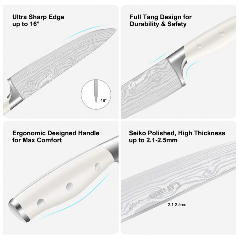 Material de alta qualidade e afiação superior Todas as lâminas das facas são forjadas em aço inoxidável de alto carbono alemão X50Cr15 com excepcional resistência à corrosão e resistência à oxidação. Almofada forte e durável para perfeita estabilidade e controle. Cada borda da faca é polida à mão a 16 18 de cada lado, tornando as facas extra afiadas, resistentes e práticas.
