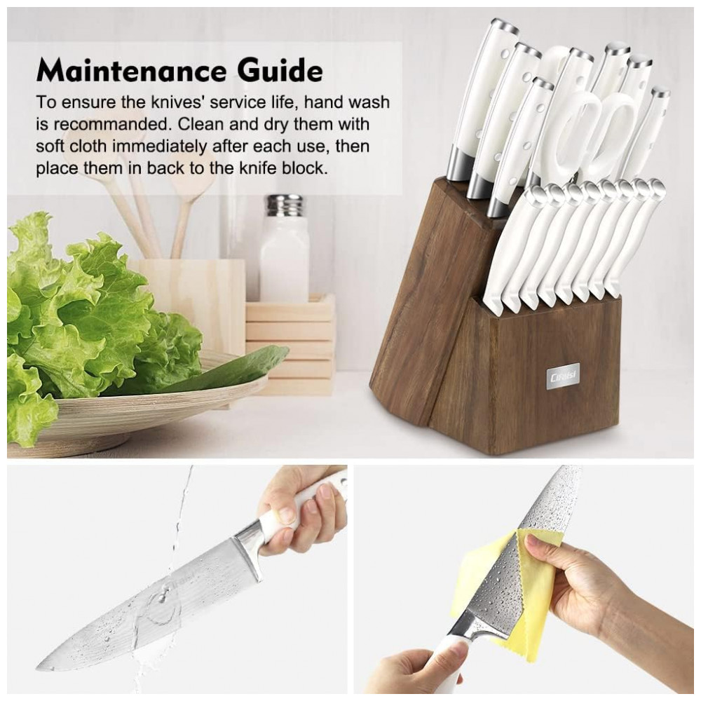 Fácil de cuidar e zenar Todas as facas são bem organizadas em um lindo bloco de madeira de acácia, que pode ser uma decoração de cozinha perfeita, reduzindo o risco de ferrugem. Lave as à mão e seque as com um pano macio imediatamente após cada uso ajudará para manter a nitidez e prolongar a vida útil. Máquina de lavar louça não é recomendada