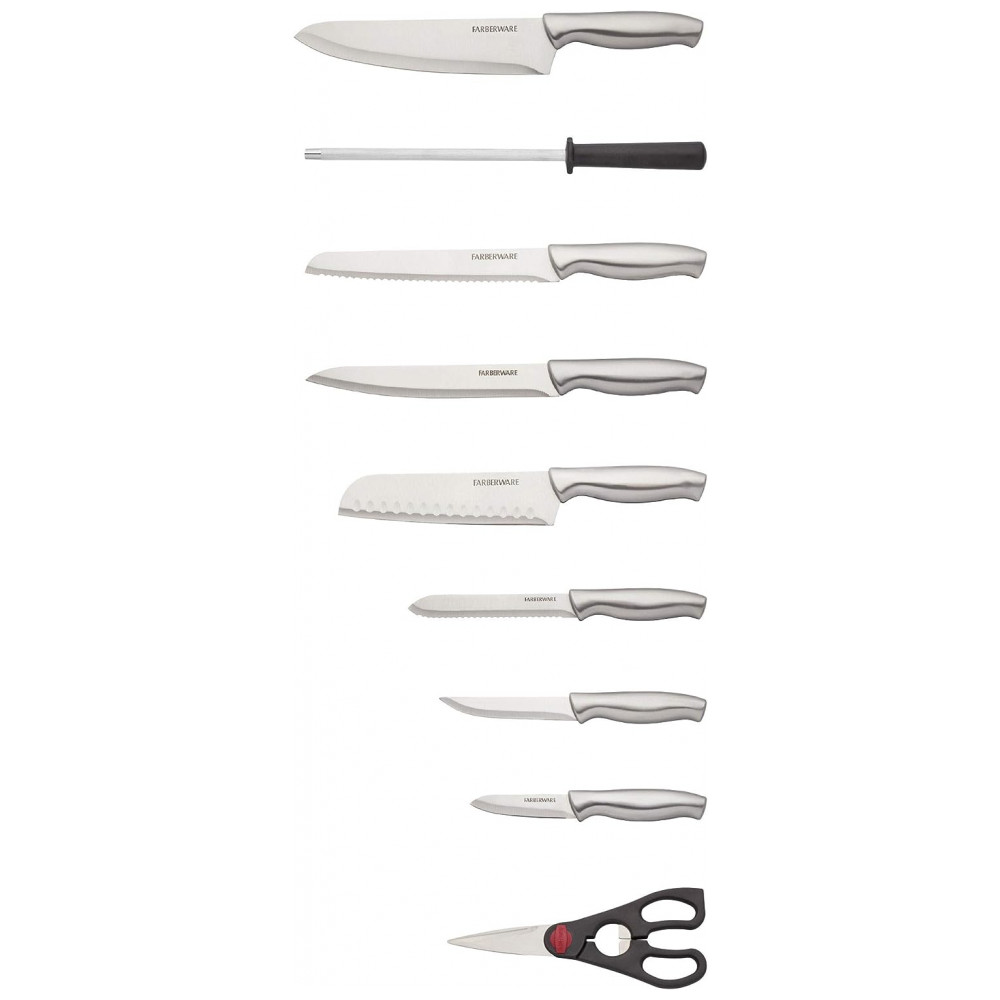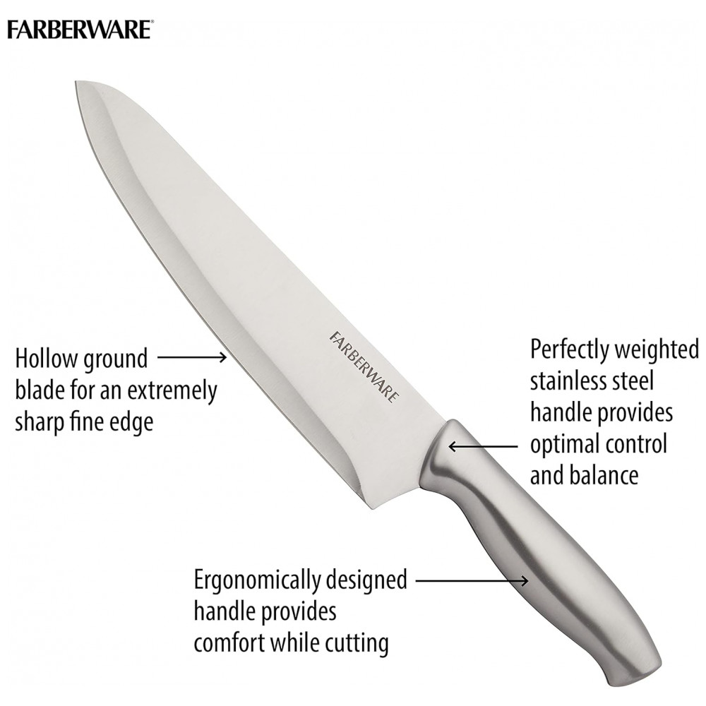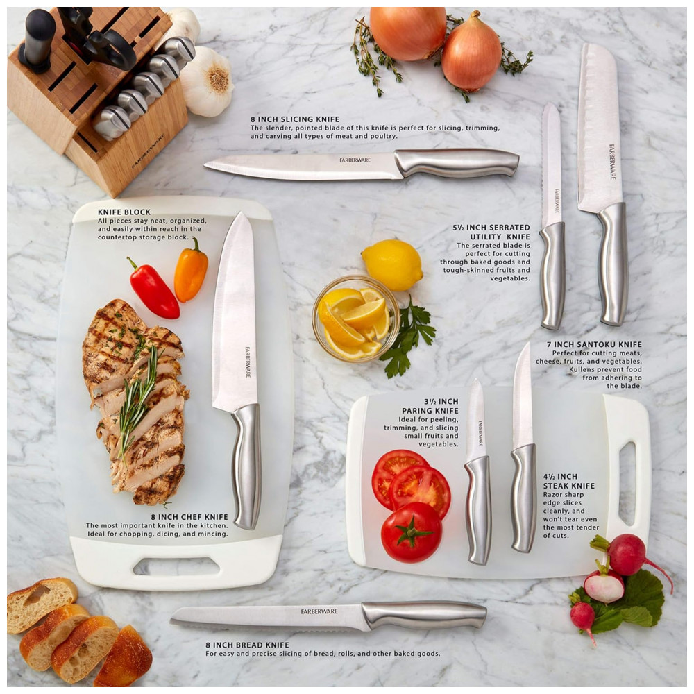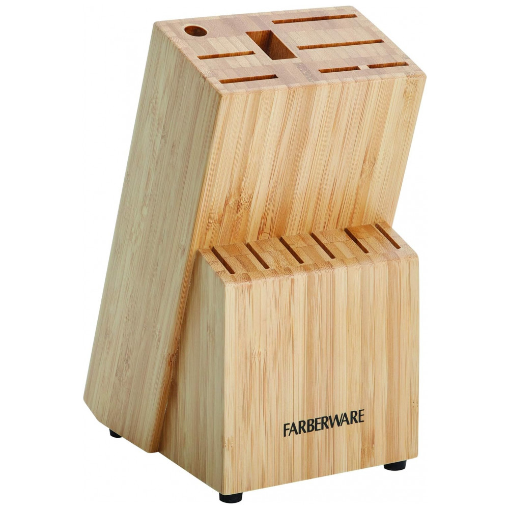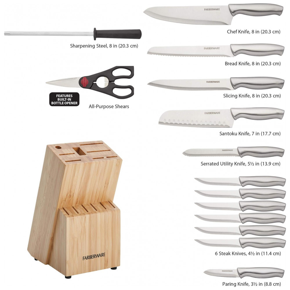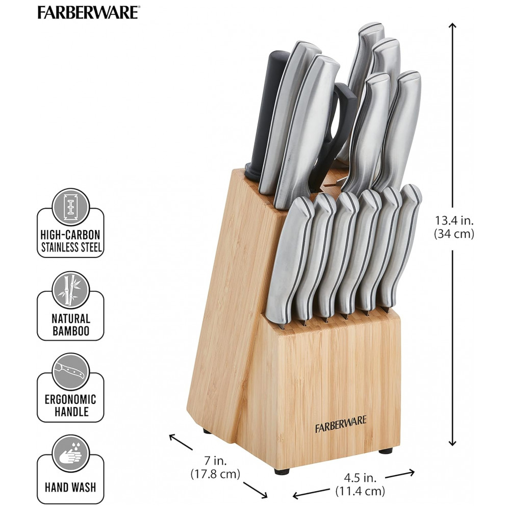 Conjunto de Facas em Aço Inoxidável com Bloco de Bancada e Cabo Ergonômico 15 Peças Farberware Prata e Marrom Claro