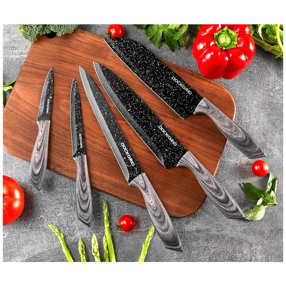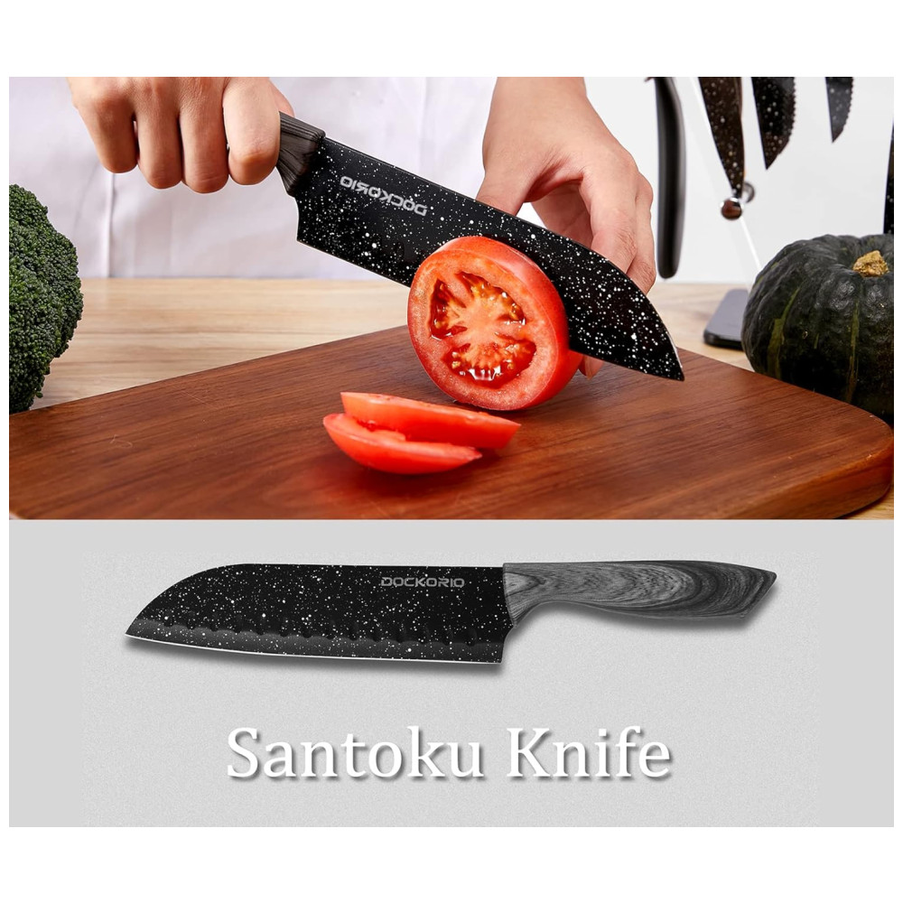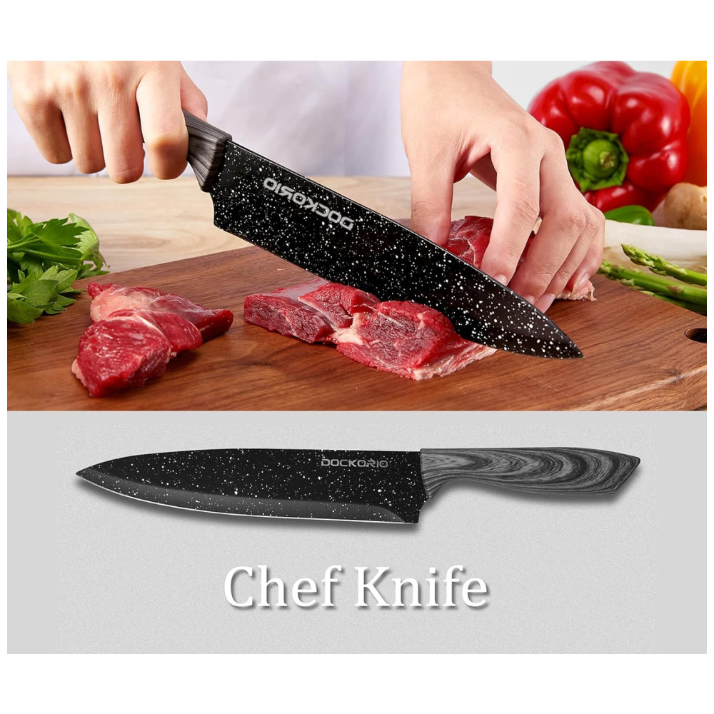 Aparência e design engenhosos O conjunto de facas de cozinha tem uma aparência única em comparação com outros conjuntos de facas comuns. As lâminas revestidas de cerâmica dura preta legal e o design das alças de estilo de grão de madeira parecem mais delicadas e elegantes. Pode fazer com que cozinhar simples se torne uma criação de beleza. O Bloco de Faca é fácil de guardar, economiza espaço e mostra a moda no uso da faca
