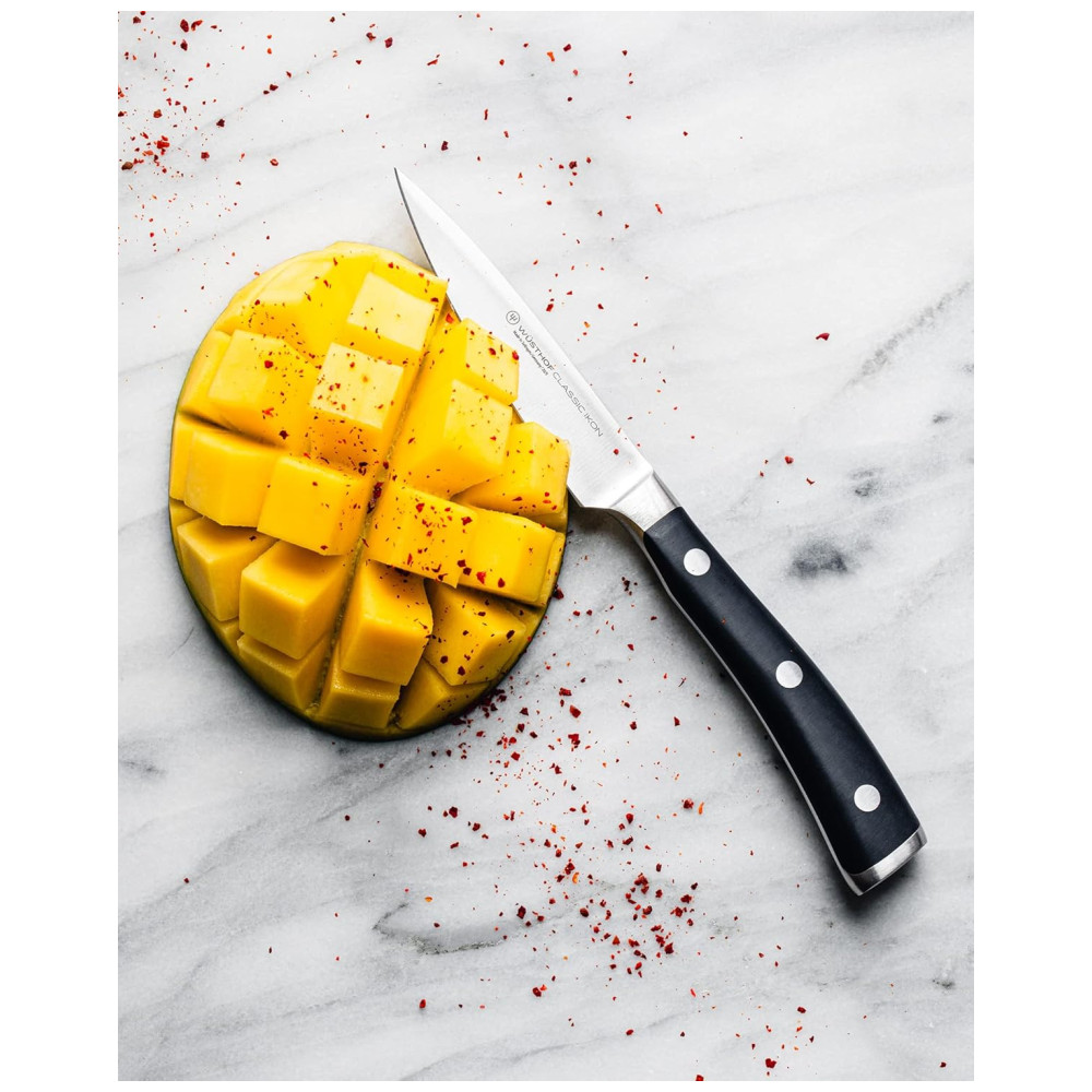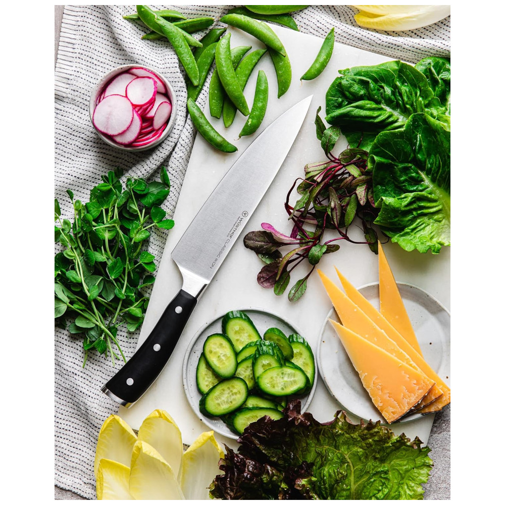 SÉRIE WSTHOF CLASSIC IKON Possui um elegante e sofisticado cabo preto com reforço duplo, proporcionando equilíbrio, beleza excepcional e a melhor experiência de corte. A série Classic IKON da WSTHOF aprimora o design, a ergonomia e a qualidade.