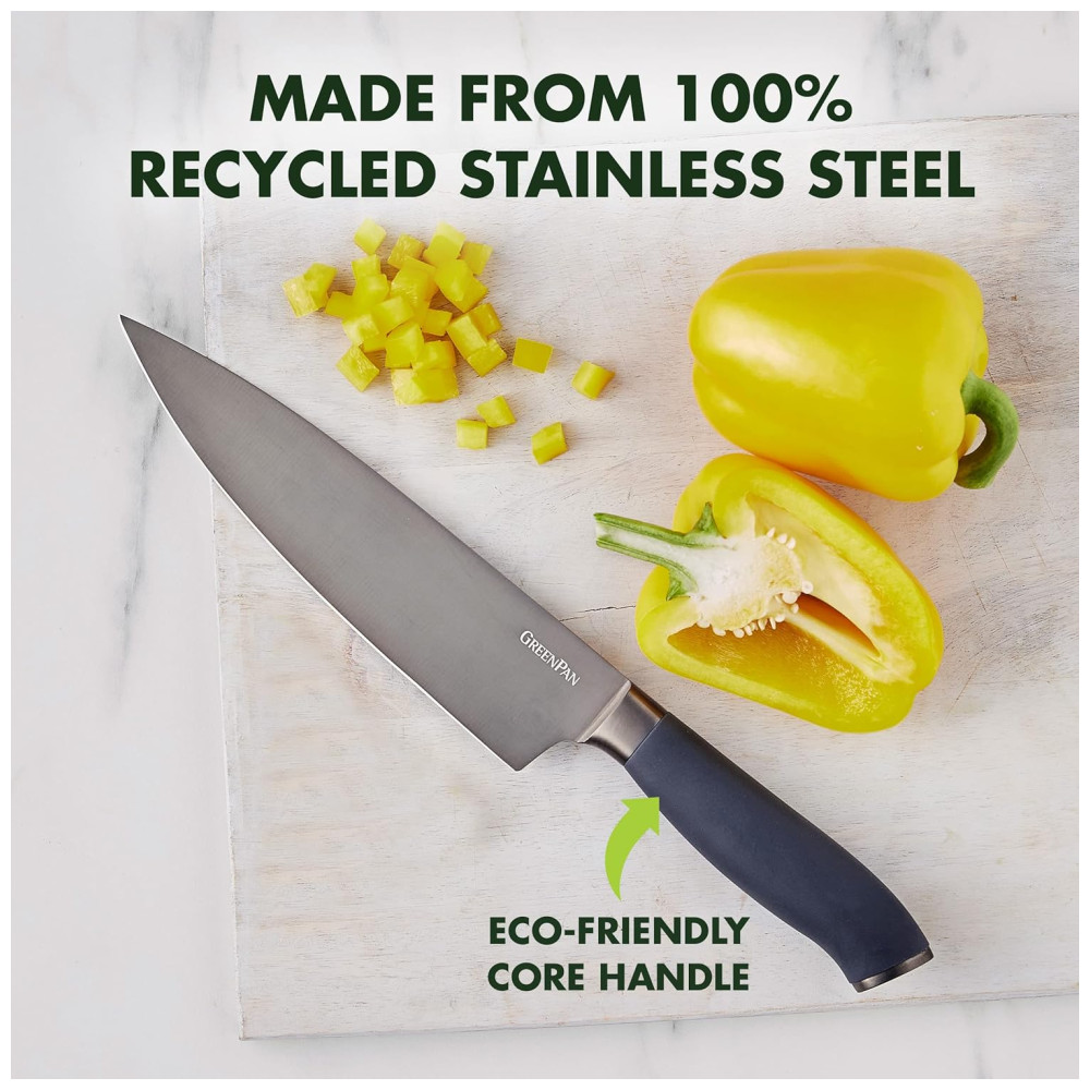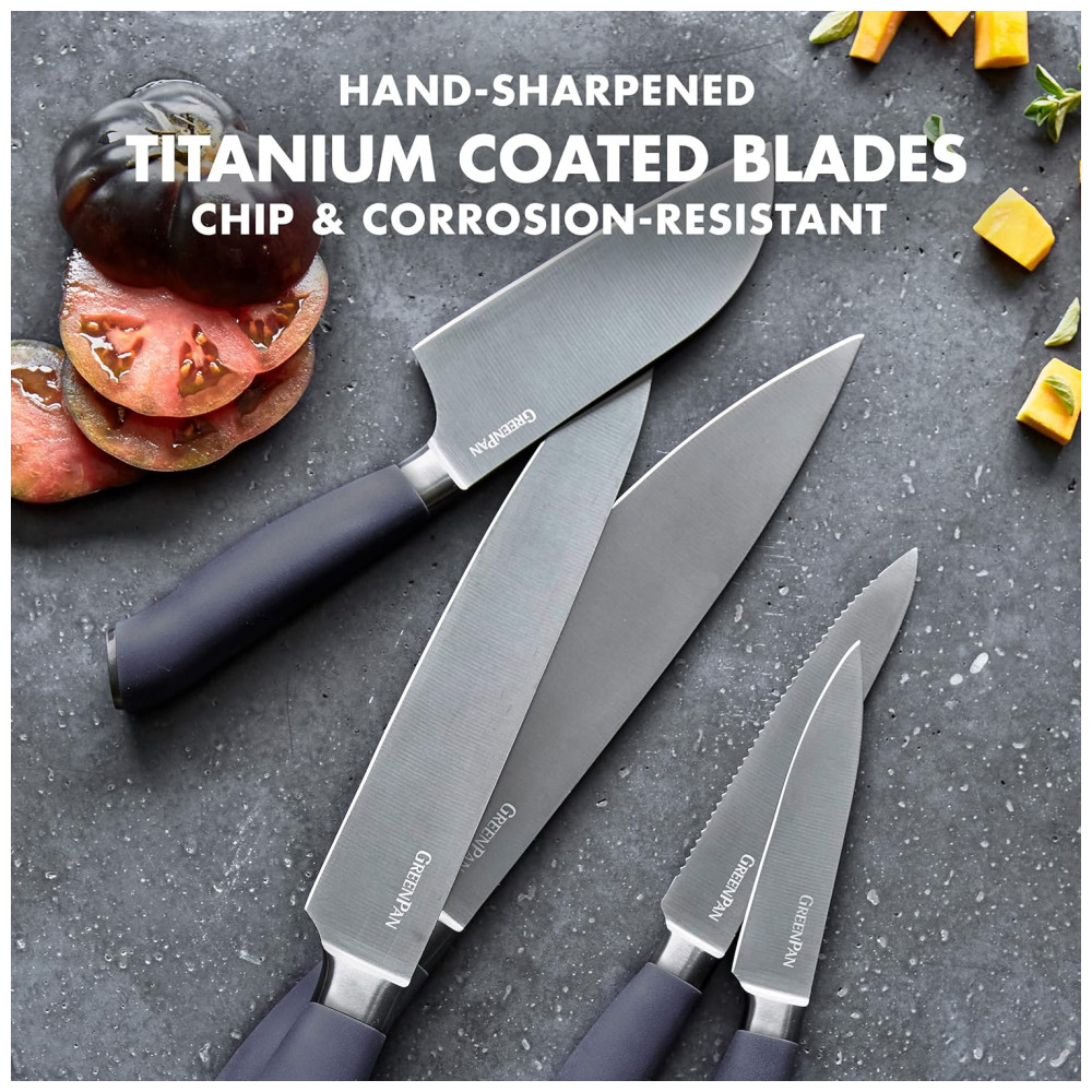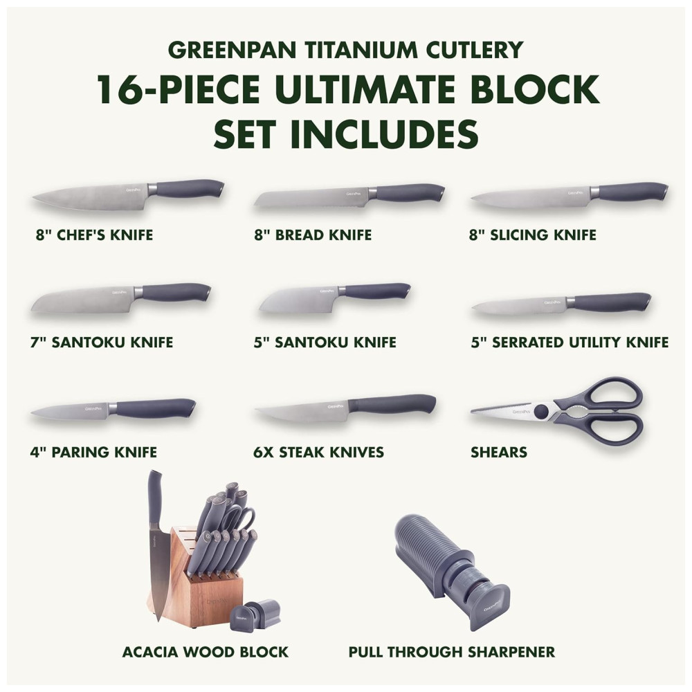 Conjunto de Facas em Aço Inoxidável Revestido de Titânio com Bloco de Bancada e Cabo Ergonômico 16 Peças GreenPan Cinza