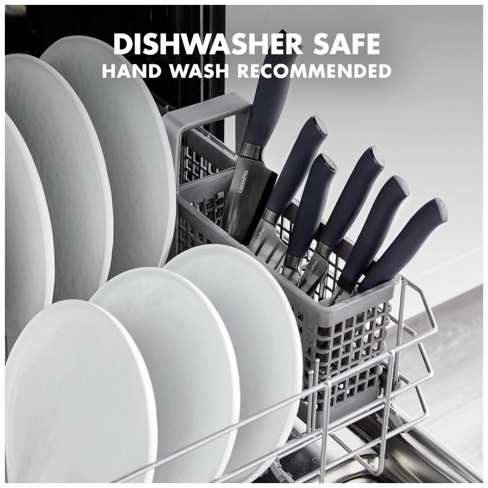 O conjunto de talheres inclui: faca de aparar de 10,16 centímetros, faca serrilhada de 12,7 centímetros, faca Santoku pequena de 12,7 centímetros, faca Santoku grande de 17,78 centímetros, faca de pão serrilhada de 20,32 centímetros, faca de fatiar de 20,32 centímetros, faca de chef de 20,32 centímetros, 6 facas para bife de 10,16 centímetros, tesoura multifuncional, apontador pull through e bloco de faca de acácia.