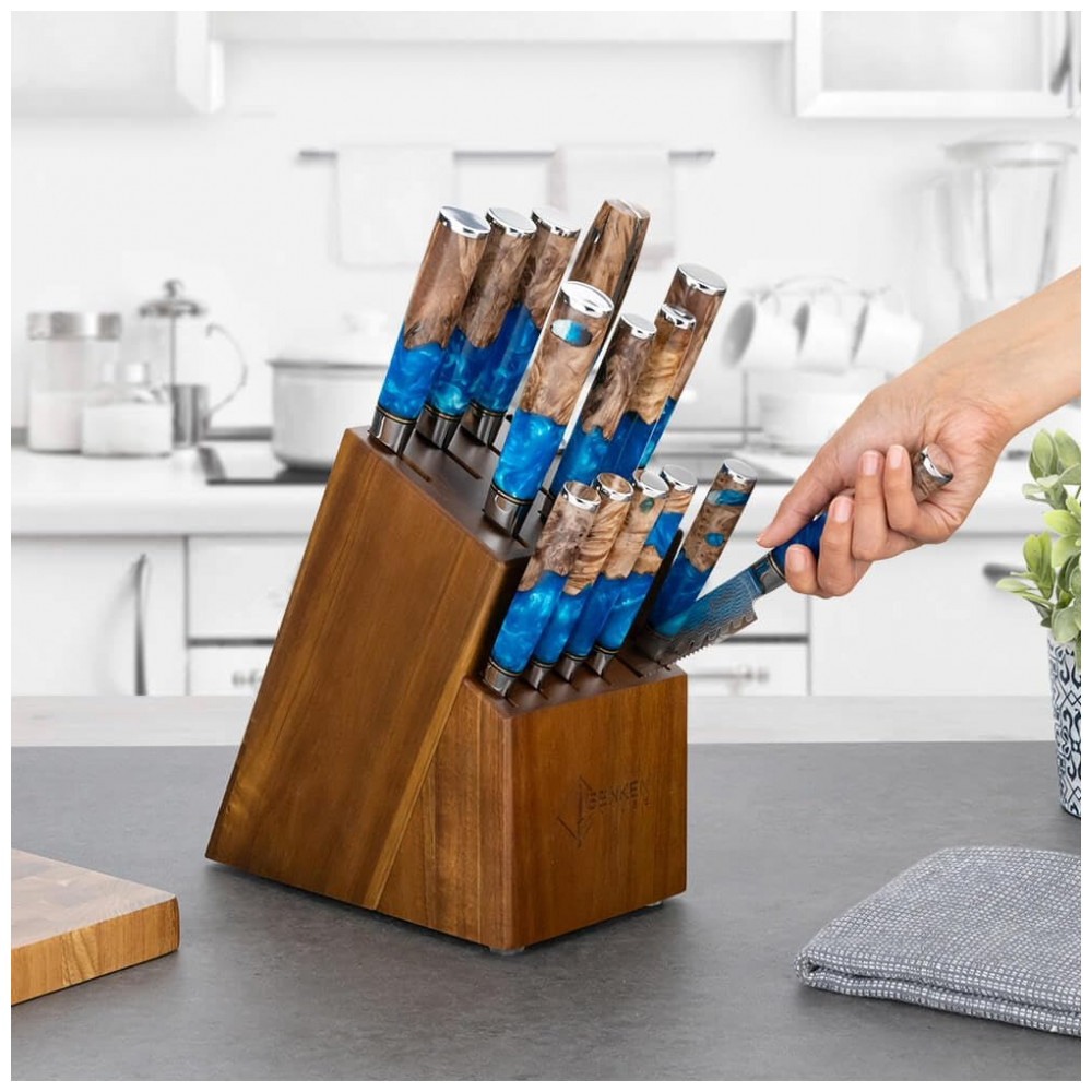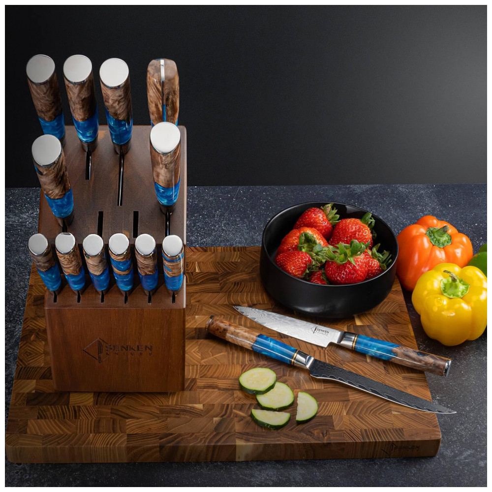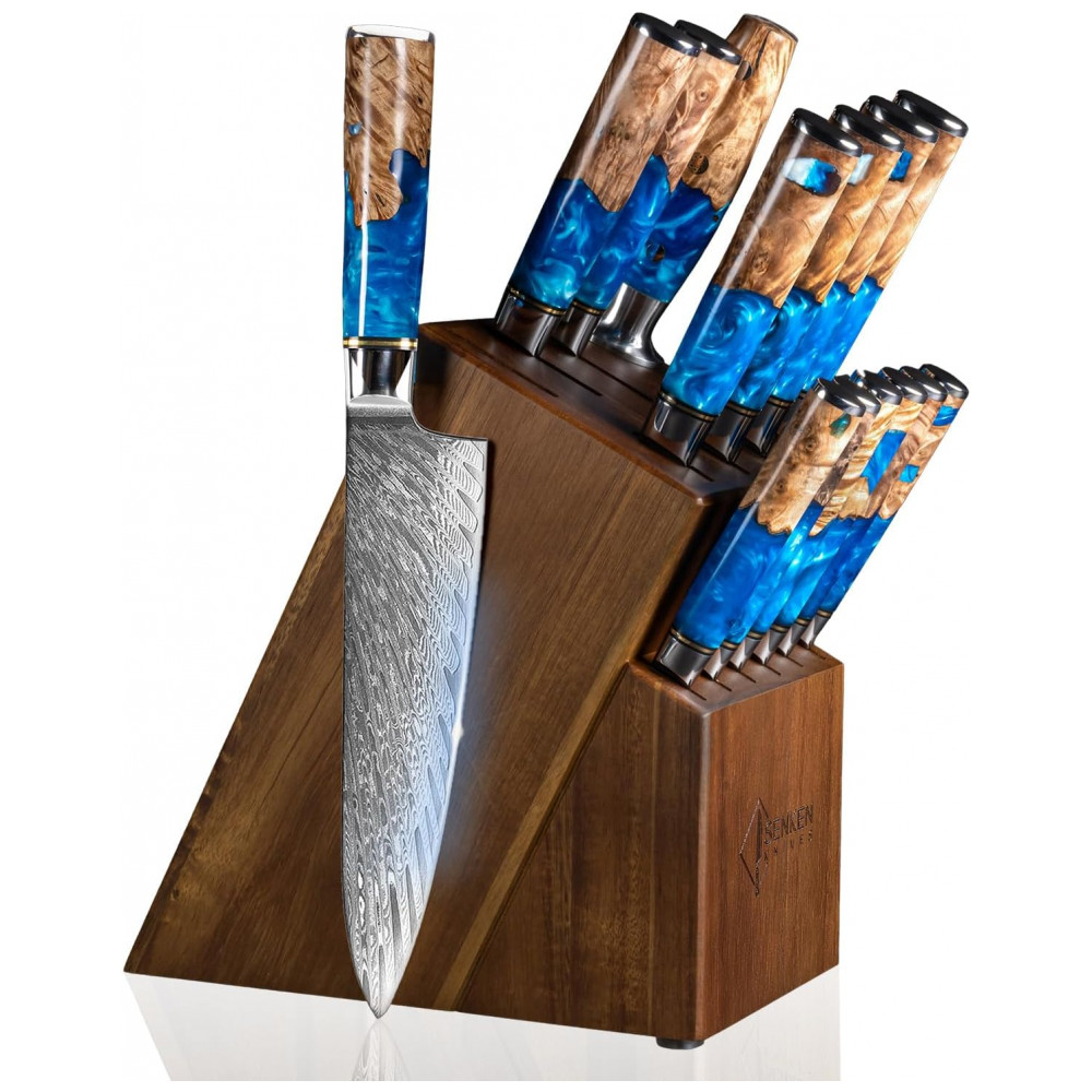 Conjunto de Facas em Aço Japonês VG10 Damasco com Bloco de Bancada 15 Peças Senken Knives Azul