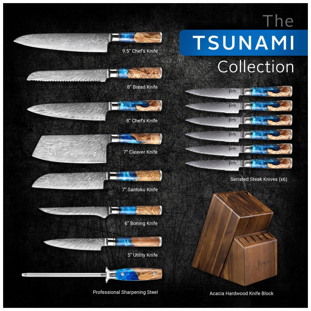 Coleção completa de 15 peças O conjunto de blocos de facas Tsunami Damasco contém todas as facas usadas por chefs profissionais e tem tudo que você precisa na cozinha incluindo 2 facas de chef, cutelo, faca de pão, utilitário, Santoku, faca de descascar, 6 facas de carne correspondentes e aço de amolar correspondente.