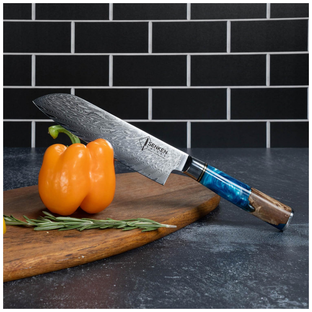 Aço Damasco de 67 camadas Forjado com maestria em aço VG 10 japonês premium em Damasco dobrado de 67 camadas para extrema robustez e corte nítido. A coleção Tsunami de 7 peças Damasco foi construída para durar, para que você nunca mais precise de outro conjunto de facas.