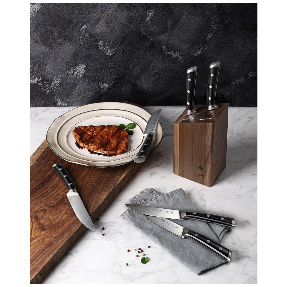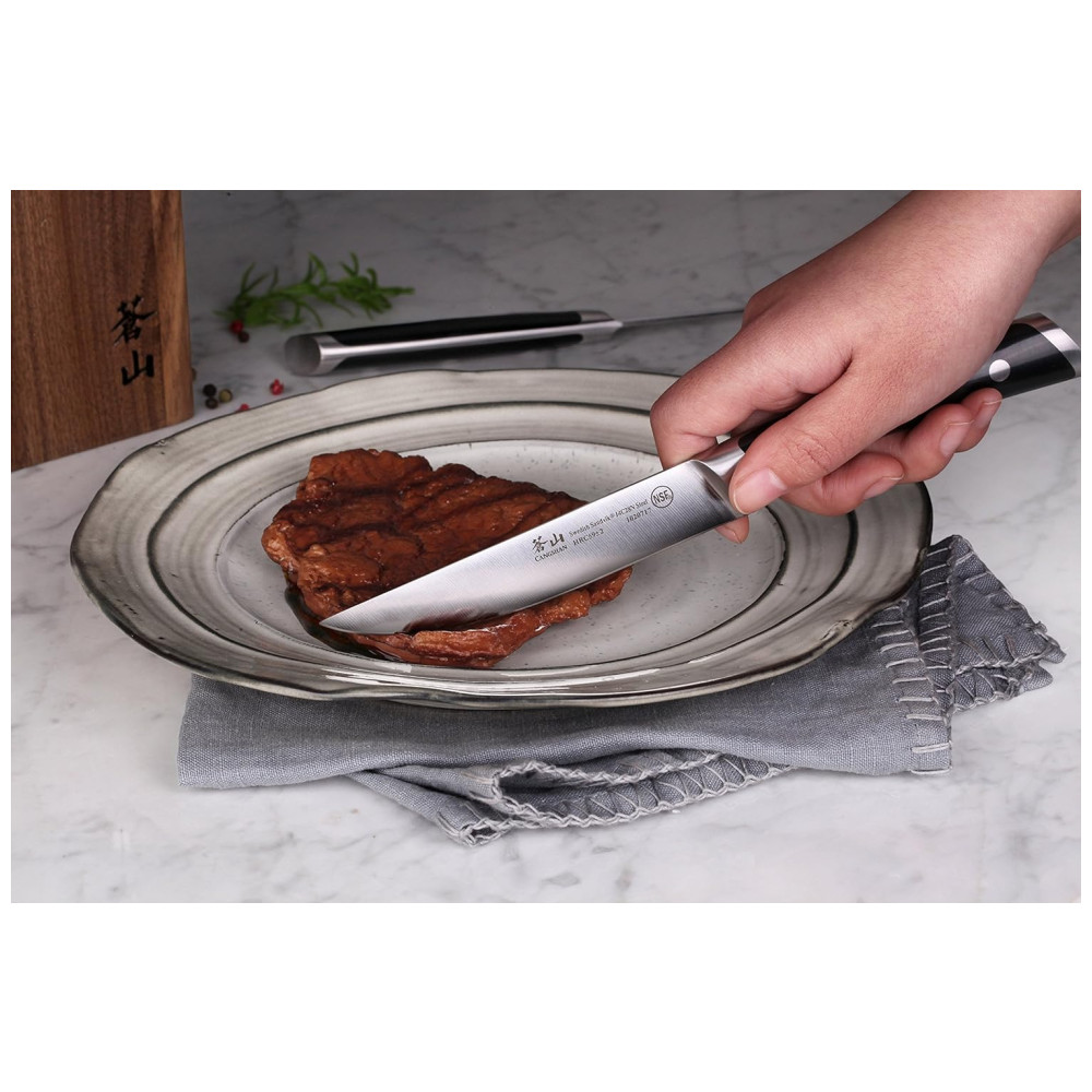 Bordas Finas Retas Especiais de Cangshan com Lâmina Precisamente Cônica: O conjunto de facas para bife oferece uma apresentação impressionante para carnes grelhadas, cortando tudo sem esforço, desde o tenro filé mignon até as costeletas mais grossas.