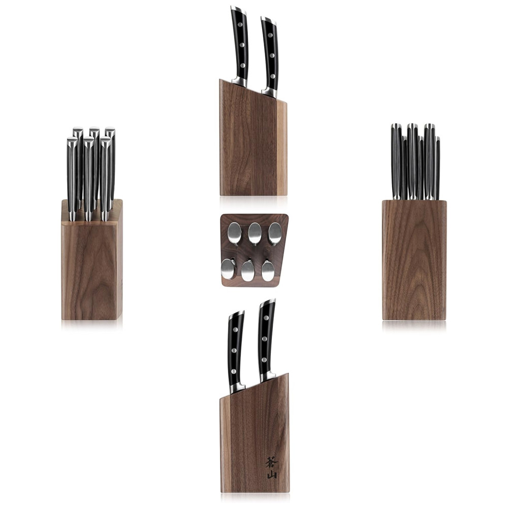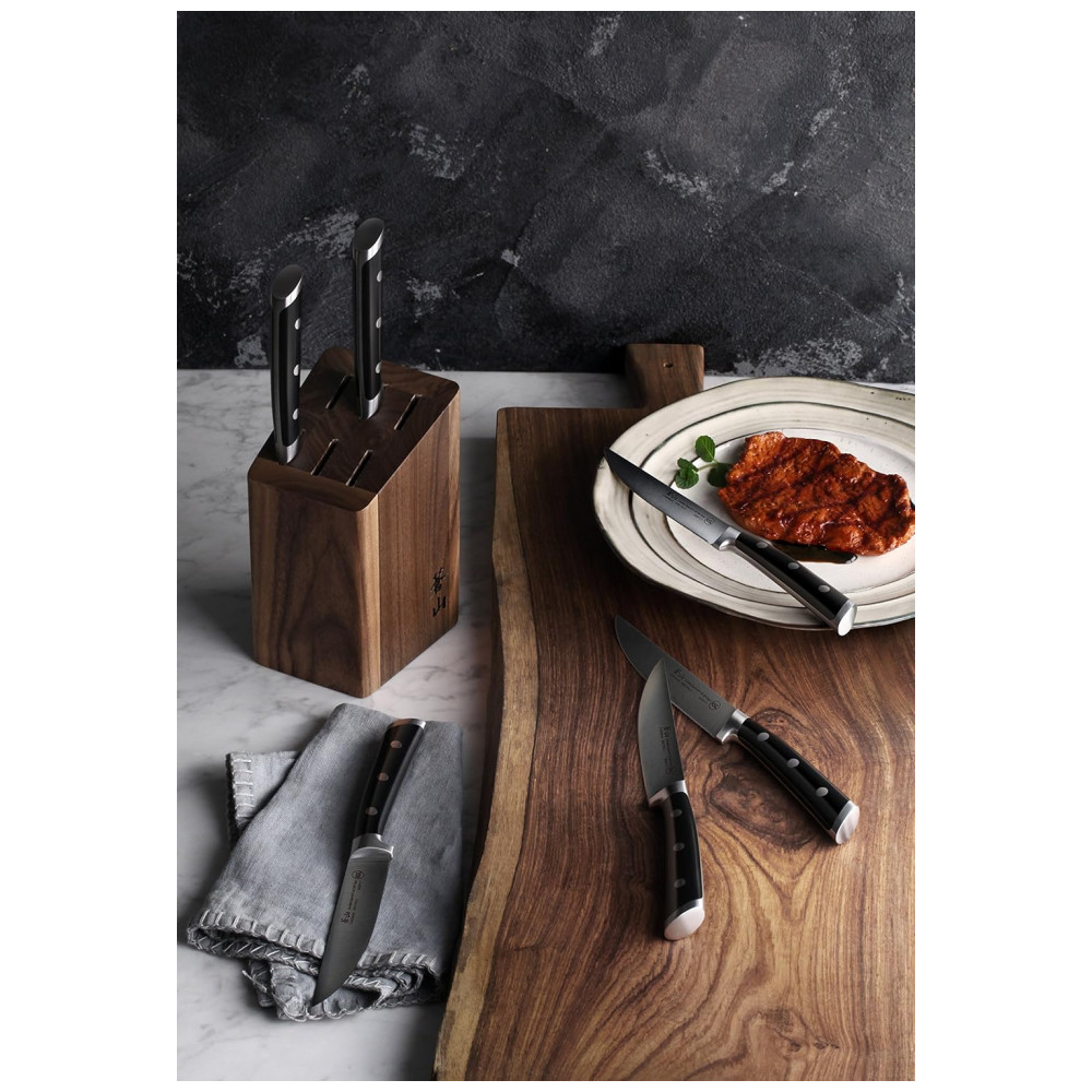 O Conjunto Inclui: 6 facas de bife com lâmina reta de 12,7 centímetros e um bloco de nogueira sólida. O cabo tem cerca de 13,97 centímetros de comprimento e a lâmina tem cerca de 12,7 centímetros de comprimento. A classificação na escala de dureza é HRC 59 , 2.