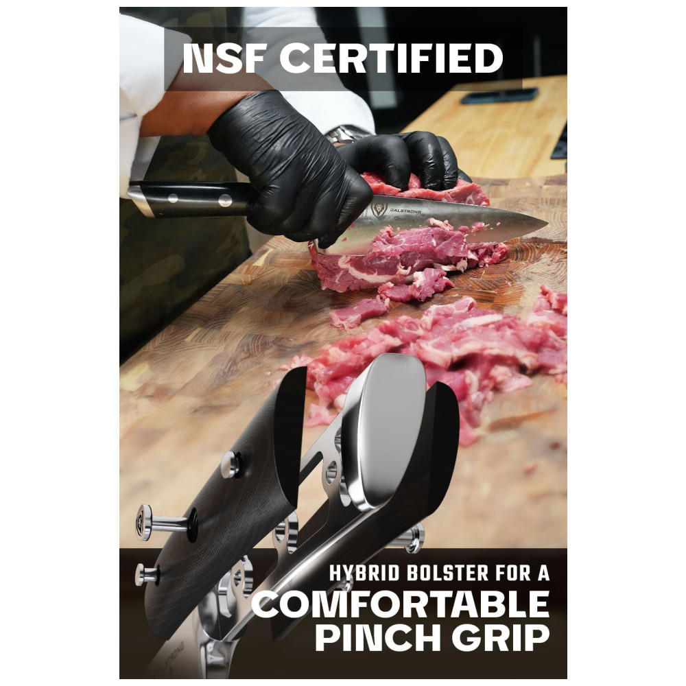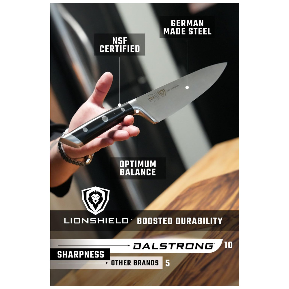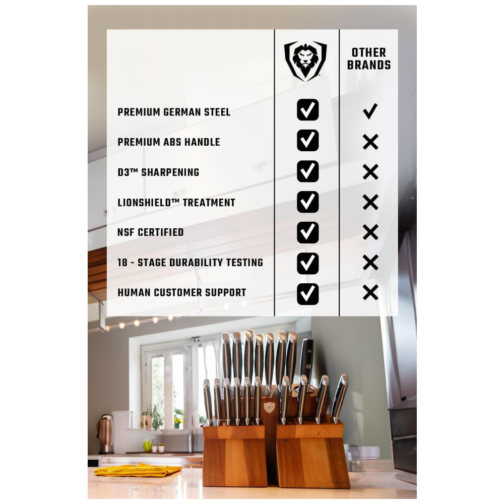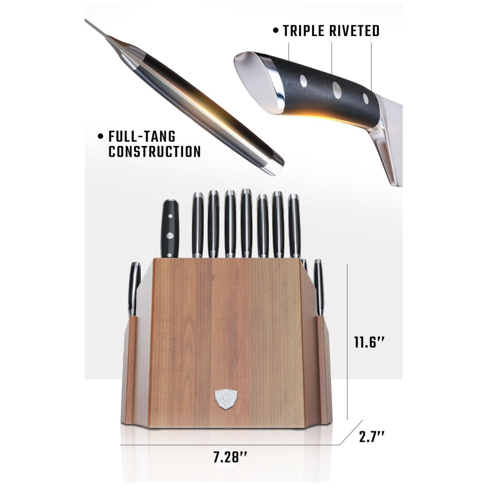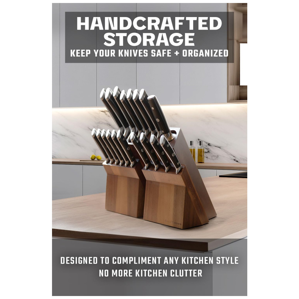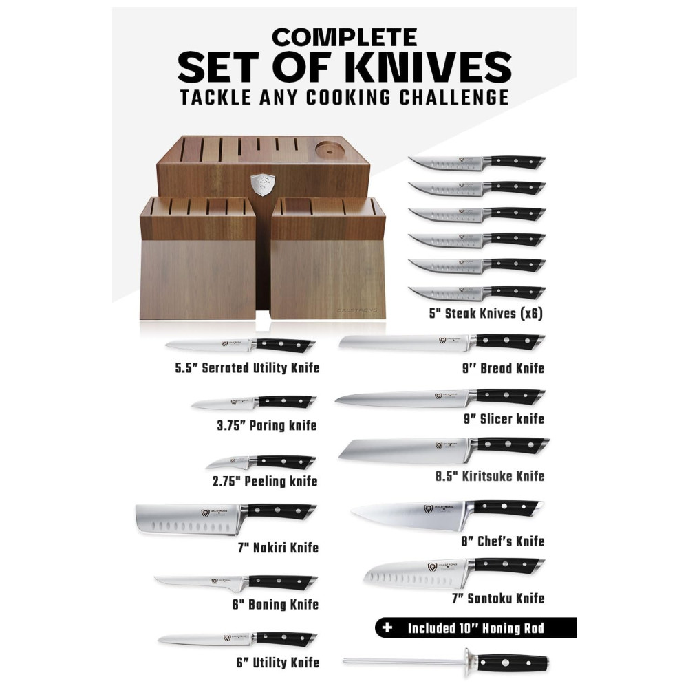 Excelente artesanato, tecnologia de ponta, elementos de design impressionantes e materiais premium. O desempenho máximo nunca foi tão bom a esse preço. Aço alemão de alto carbono importado, incrivelmente nítido e com nitidez nítida, com uma borda polida à mão de 14 a 16 graus por lado. Temperado com precisão e resistente a manchas. Este conjunto durará uma vida. Design famoso, com peso satisfatório, materiais premium e sensação de qualidade. As alças pretas de luxo importadas da pakkawood têm rebites triplos com uma alça que garante conforto e manobrabilidade. Laminado e polido para uma construção sanitária, perfeito para cozinhas movimentadas Projetado com perfeição na dureza 56 Rockwell e polido à mão para um acabamento acetinado. Cuidadosamente afunilado para maior dureza, flexibilidade e resistência mínima ao corte. Todas as facas essenciais para qualquer chef, completas em um impressionante bloco de madeira de nogueira artesanal. Inclui faca do chef, kiritsuke, santoku, talhar, cortar, pão, desossar, filé, utilidade, utilidade serrilhada, aparar, bico de pássaro e 6 facas para bife e afiar aço