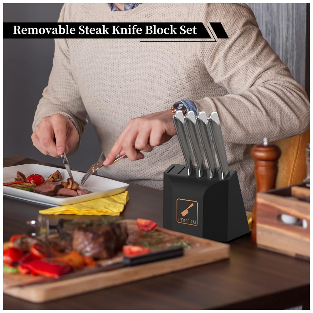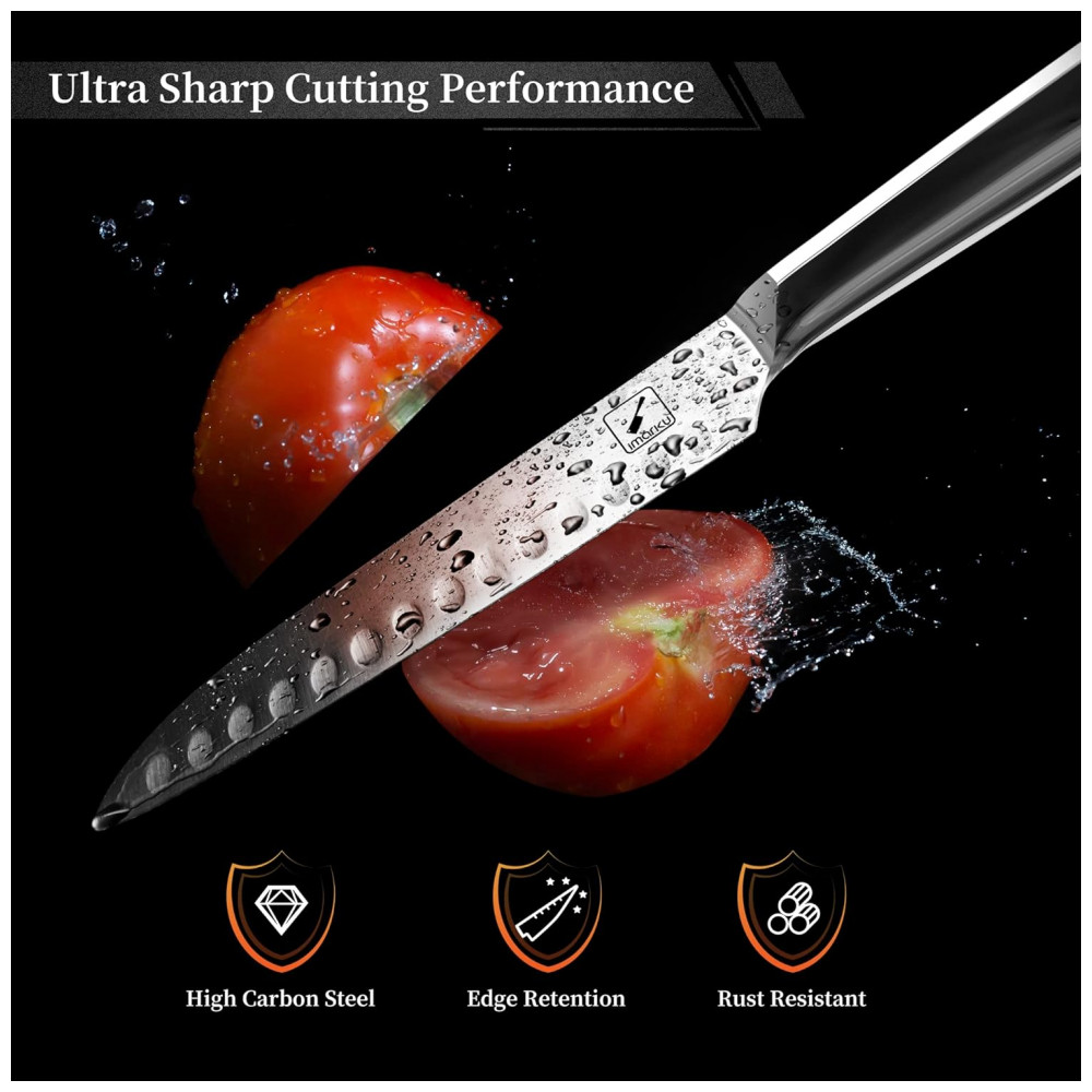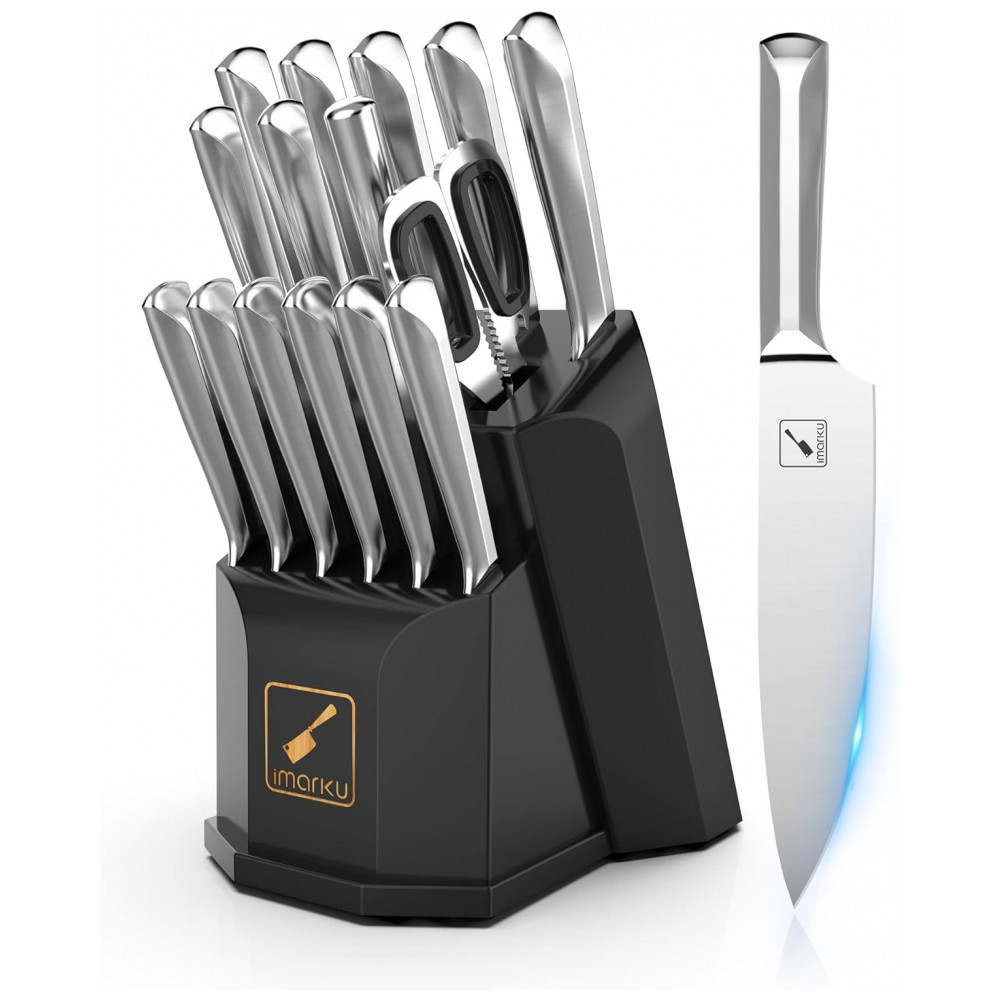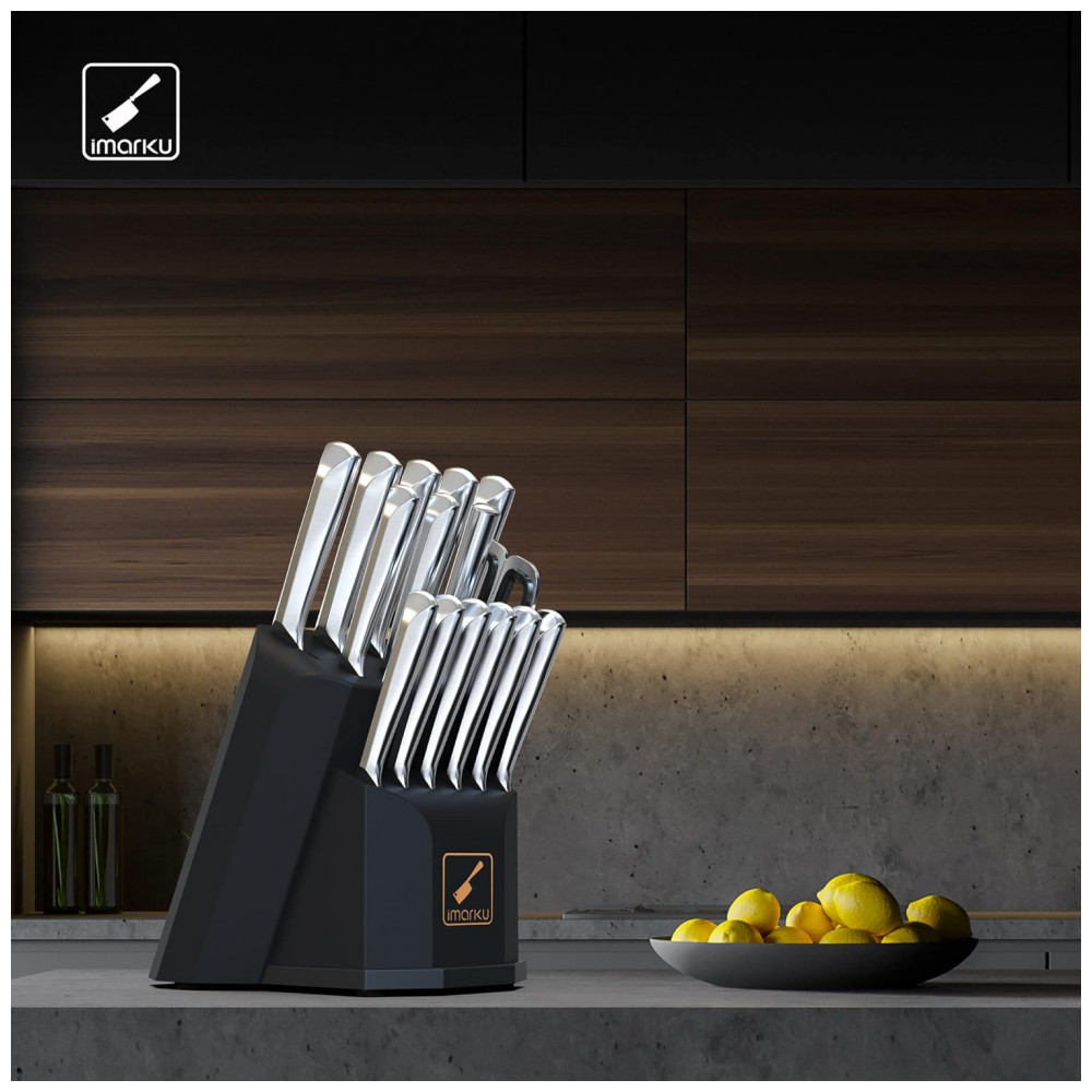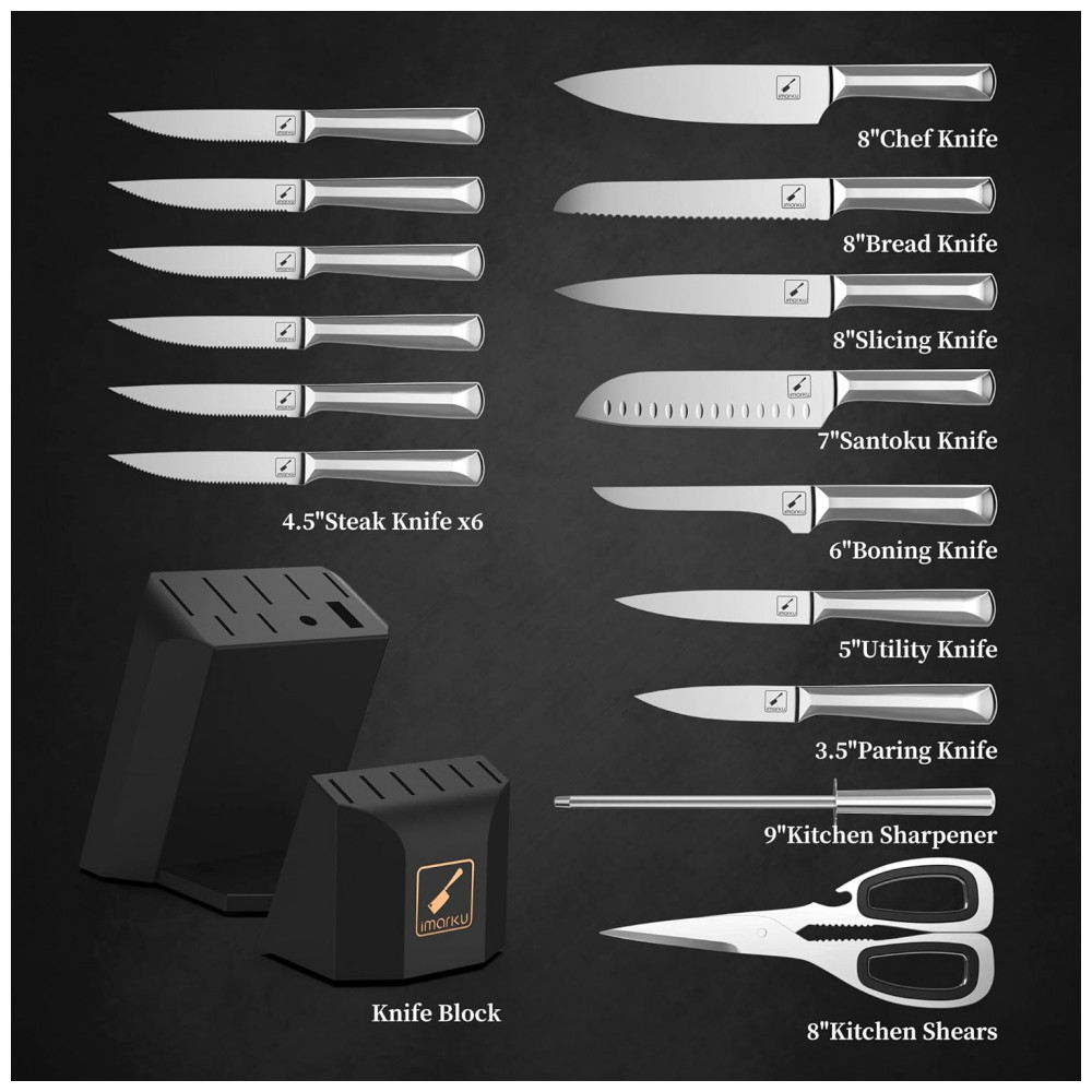 Excepcional e ultra afiada O conjunto de facas de cozinha imarku com bloco é feito de aço inoxidável de alto carbono premium com uma borda polida à mão a 13 graus de cada lado, o que dá às lâminas uma borda mais afiada. Cada faca é resistente à ferrugem, manchas, corrosão e odor graças ao seu design de peça única. Nosso aço premium e design inovador resultam em uma lâmina afiada que minimiza a fadiga.
