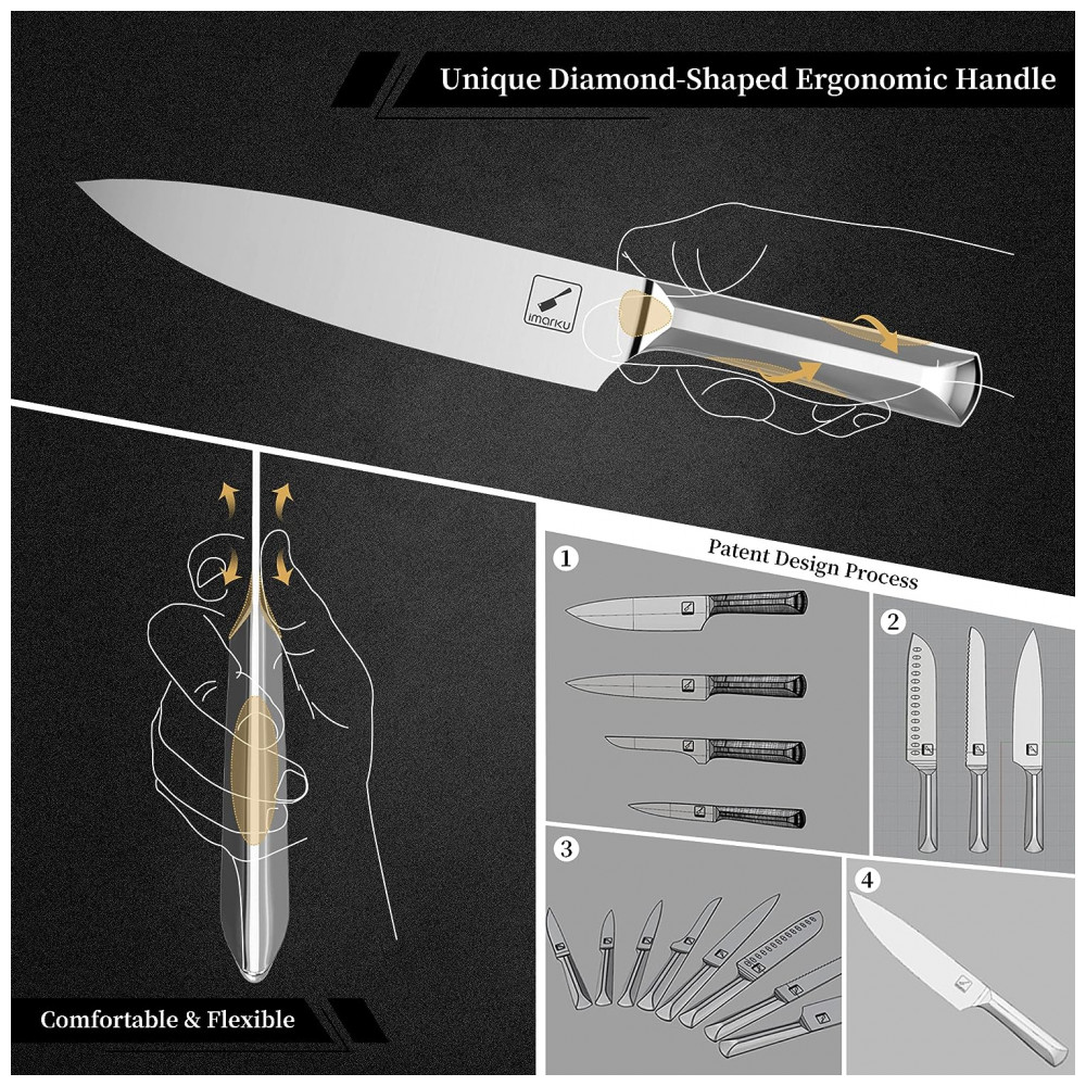 Presentes de Natal e garantia vitalícia Os conjuntos de facas profissionais imarku são os presentes perfeitos para homens, mulheres para presentes de Natal, casamentos, aniversários, boas vindas e presentes de Ação de Graças. A imarku se concentra em fazer facas de alta qualidade e se dedica a aprimorar sua experiência culinária. Se houver algum problema com o conjunto de facas, não hesite em contactar nos. Forneceremos troca ou devolução gratuita por toda a vida
