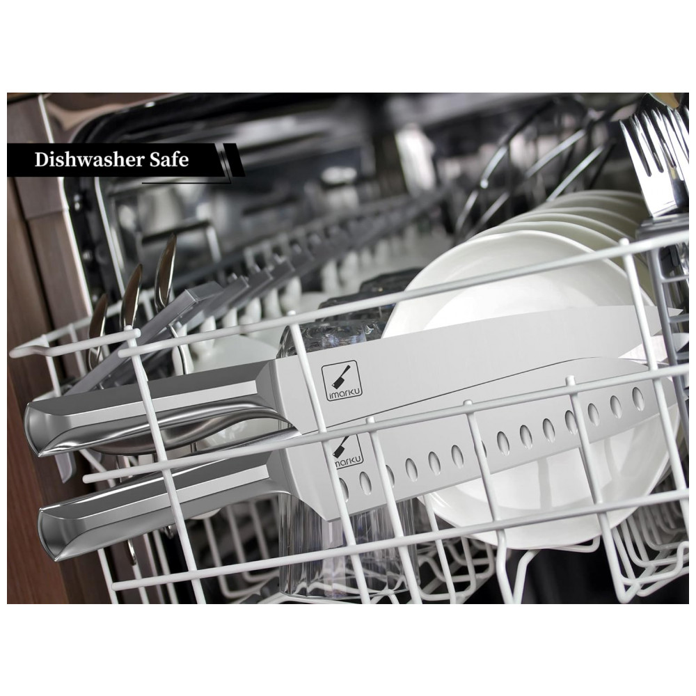 Pode ser lavado na lava louças e fácil de guardar Este conjunto de facas para cozinha com bloco é fácil de cuidar. Perfeito para lava louças ou lavar à mão e secar com um pano macio imediatamente após cada lavagem. Coloque o com segurança de volta no bloco de facas enquanto reduz a desordem do balcão para ajudar a mantê lo afiado e durar mais tempo.