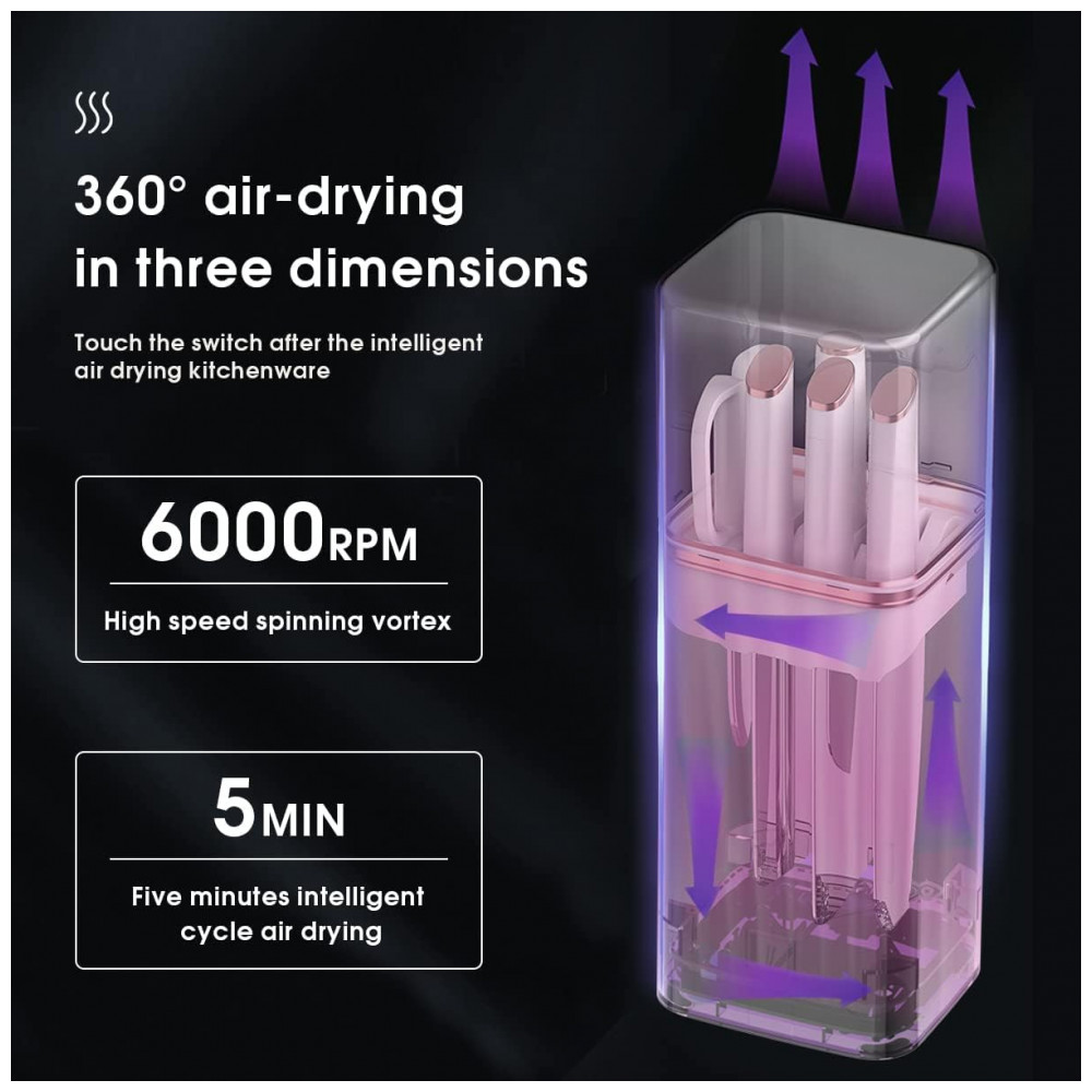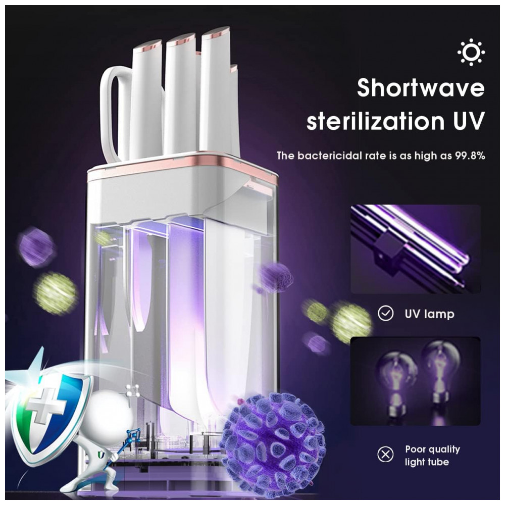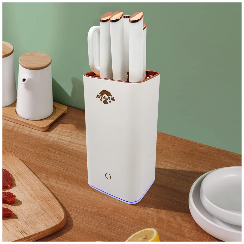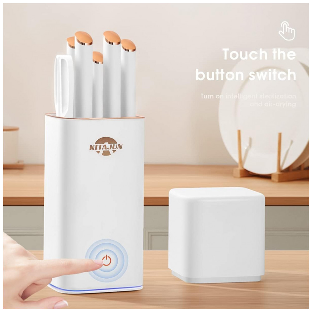 Limpeza Inteligente: O interior do porta faca possui função de limpeza e secagem, à prova dágua e à prova de ferrugem. Lave a faca e coloque a de volta no porta faca e aperte o botão, a base acenderá a luz de respiração e começará a trabalhar. A luz apaga se após cinco minutos, após quinze minutos o trabalho de limpeza termina. As facas ficarão limpas e secas.