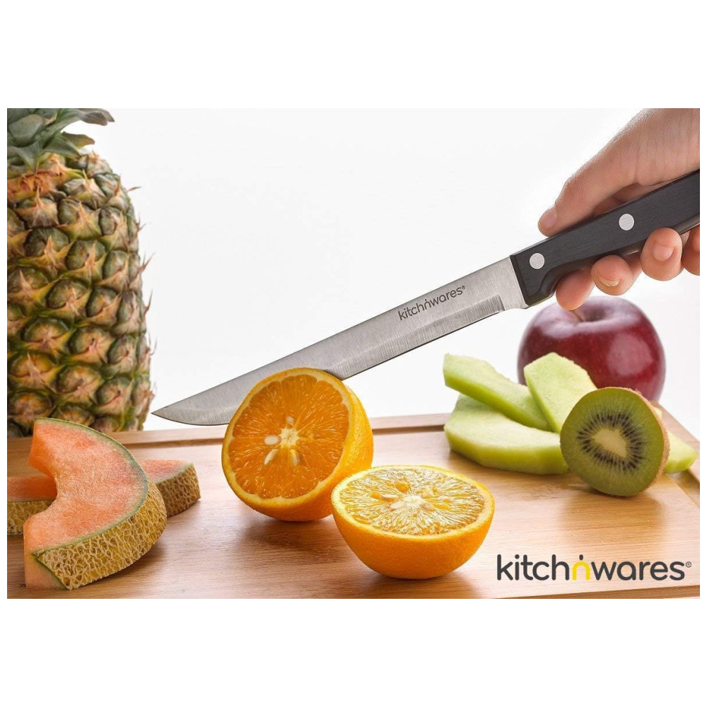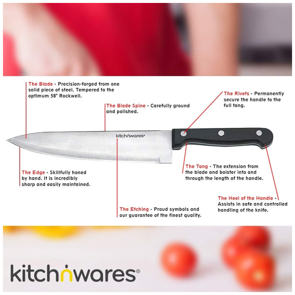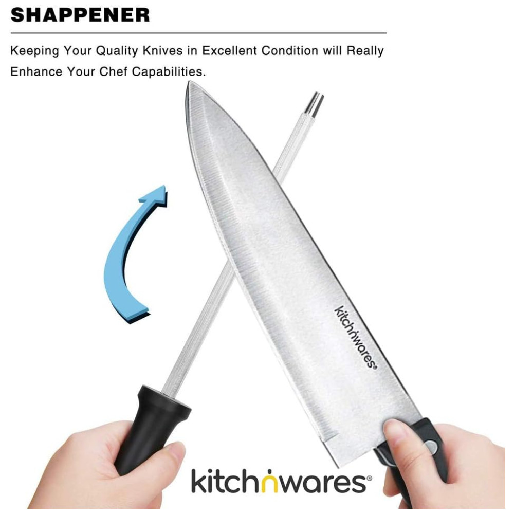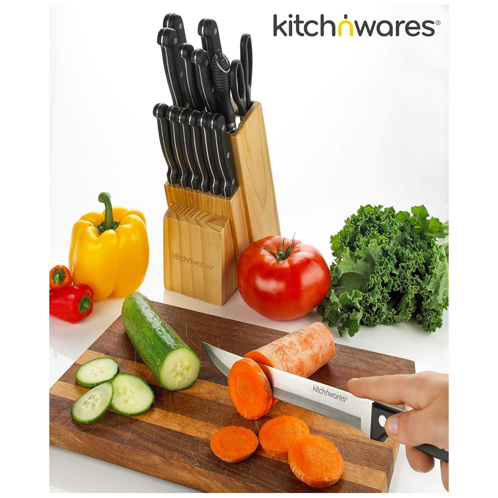 CONJUNTO COMPLETO TUDO EM UM Faca de Chef, Faca de Pão, Faca de Entalhe, Faca Utilitária, Faca de Desbaste, Faca de Desossar, Afiador, um par de Tesouras de Cozinha e 6 peças faca de bife. Tudo em um bloco de açougueiro para zenamento conveniente das facas. Portanto, esteja pronto para nunca mais comprar uma única faca AÇO INOX PESADO Feito de aço inoxidável de qualidade 3Cr14 420 de qualidade premium, comprovado e testado por sua durabilidade e funcionalidade. Não tóxico e insípido, à prova de corrosão e resistente ao calor. Resistente a manchas e ferrugem Não use a máquina de lavar louça APARÊNCIA À MODA E FÁCIL DE LIMPAR Superfície polida, alças alargadas, dente bem proporcionado. Você vai adorar o excelente peso, design de elite e sensação de mão maravilhosa, tudo isso com uma qualidade decente. Sua superfície lisa, perfeitamente polida, facilita a limpeza das mãos. Seque imediatamente, não deixe de molho em água por um longo período de tempo. Achamos que você vai adorar esse conjunto de facas tanto quanto nós Não importa a tarefa que você realiza na cozinha, este conjunto de facas Kitch o ajudará em tudo o que você faz. Adquira o seu agora e veja como é ótimo para você. Rolar para baixo Para saber mais, sobre como usá lo e por que você vai adorar ter um para si Conjunto de facas com bloco de madeira conjunto de 15 peças inclui faca de chef, faca de pão, faca de escultura, faca, faca de aparar, faca de bife, faca de desossar, tesoura e afiador de facas