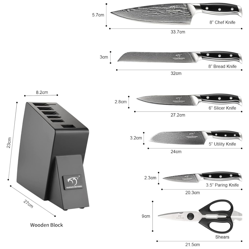 DESIGN COMPLETO Os conjuntos de facas profissionais NANFANG BROTHERS com estrutura requintada tornam o cabo resistente o suficiente e forte o suficiente para suportar a força. Mesmo o corte pesado não levará à flexão e fratura da lâmina.