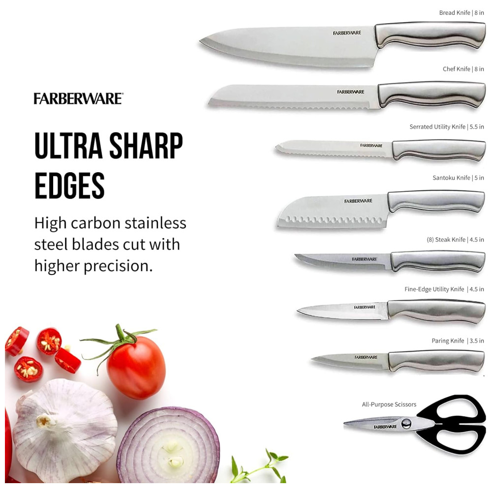 CONJUNTO DE BLOCO DE FACA DE 16 PEÇAS Este conjunto inclui uma faca de chef de 8 polegadas, faca de pão de 8 polegadas, faca serrilhada de 5,5 polegadas, faca Santoku de 5 polegadas, faca de corte fino de 4,5 polegadas, faca de 3,5 polegadas, 8 facas de bife de 4,5 polegadas , tesouras multifuncionais e um bloco de zenamento com afiador de facas integrado.