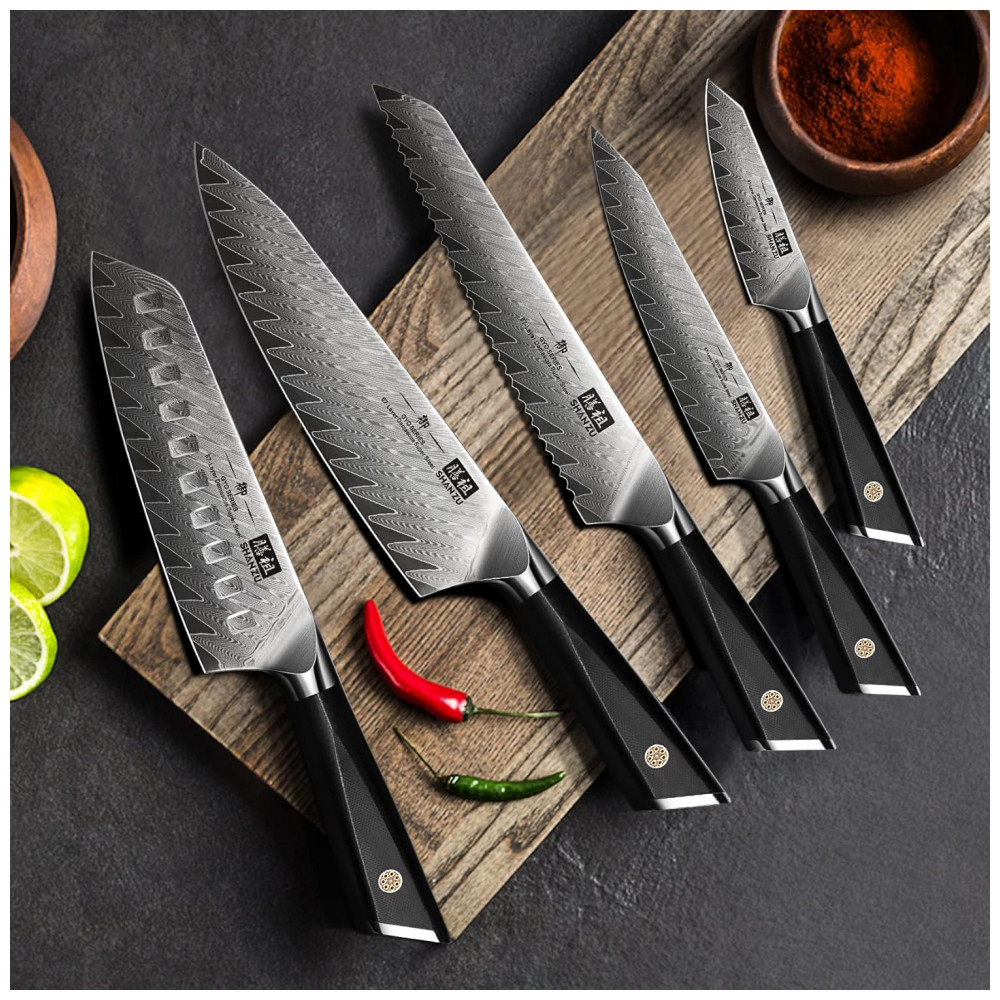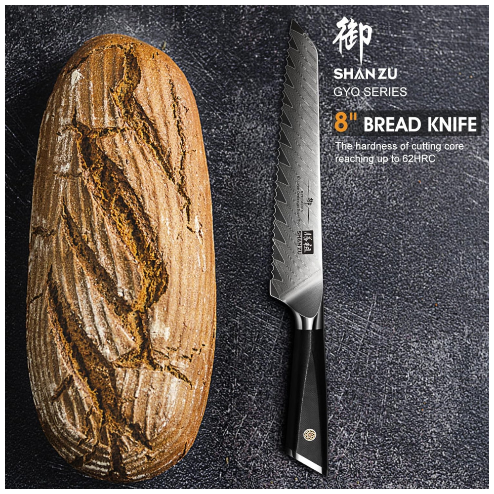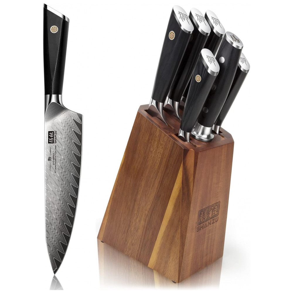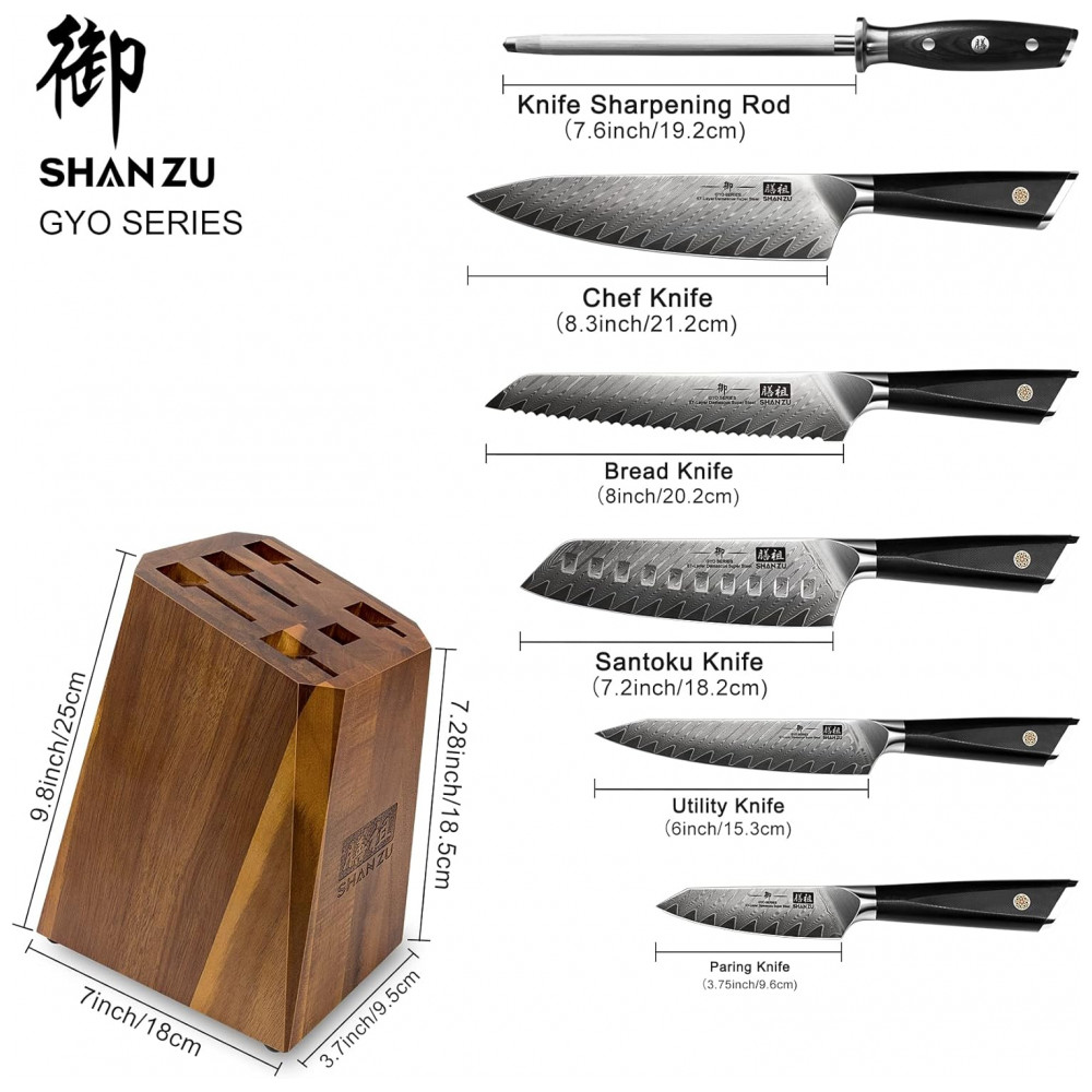 CONJUNTO DE FACAS DE COZINHA DAMASCO: O conjunto de facas SHAN ZU de 7 peças com bloco inclui: faca de chef de 21,, faca santoku de 18,, faca de pão de 20,, faca utilitária de 15,, faca de aparar de 9,, haste de afiar faca e bloco de faca de madeira. Todas as lâminas os núcleos são facas de aço Damasco puro, conjuntos de cozinha preparados para chefs profissionais e também para uso doméstico.