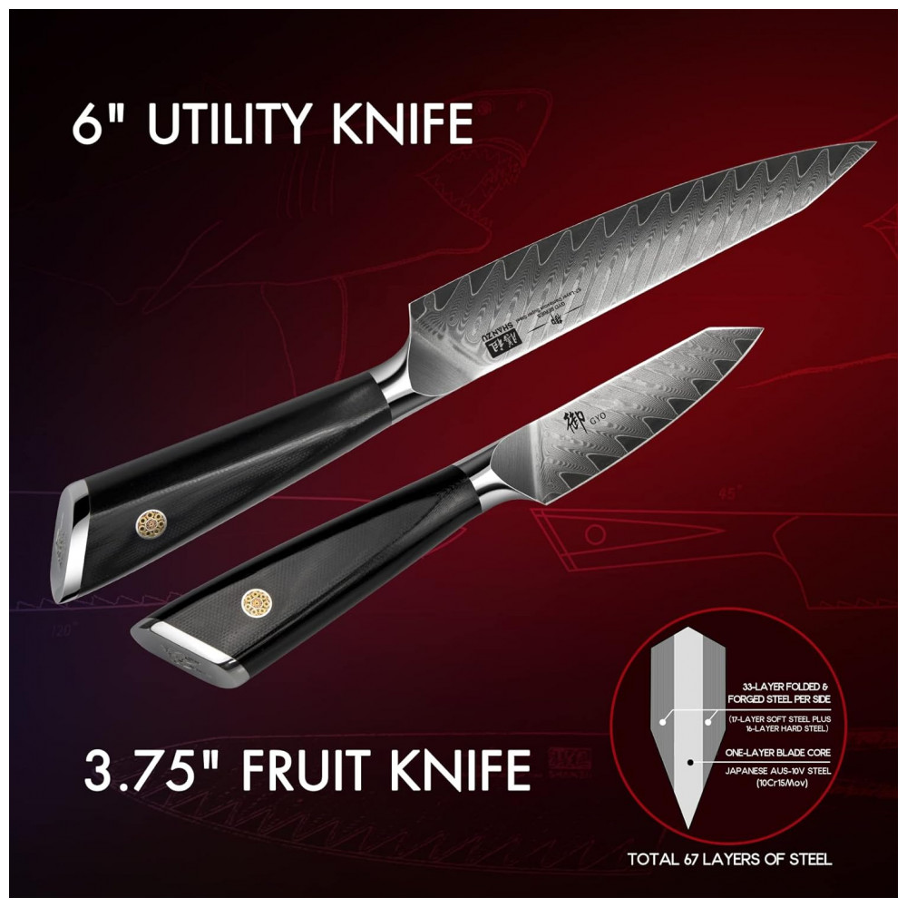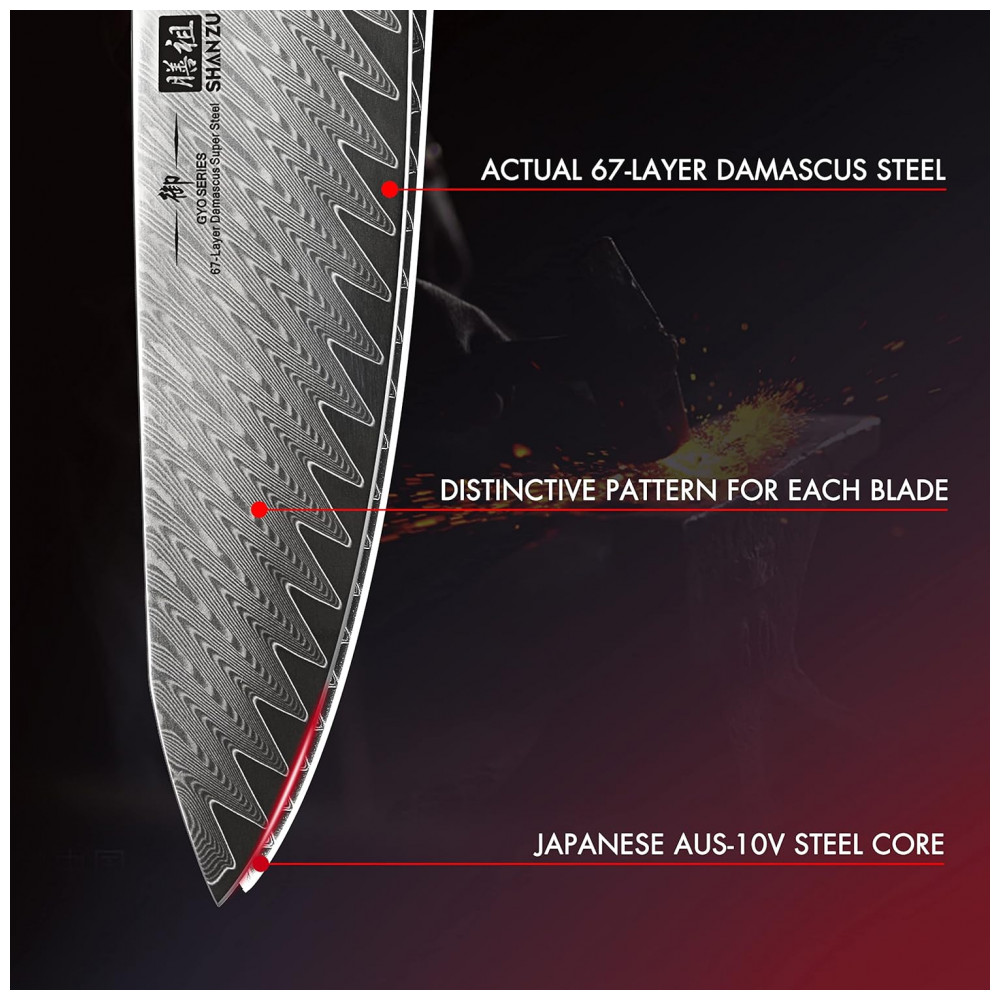 Afiação incomparável: este conjunto de facas afiadas se beneficia de seu material Damasco de 67 camadas, reunindo um núcleo de super aço japonês AUS 10V com 33 camadas externas de aço inoxidável AÇO MACIO DE 17 CAMADAS MAIS AÇO DURO DE 16 CAMADAS em cada lado. O indispensável processo de fabricação de 32 etapas e os melhores materiais criam este conjunto de facas inspirador.