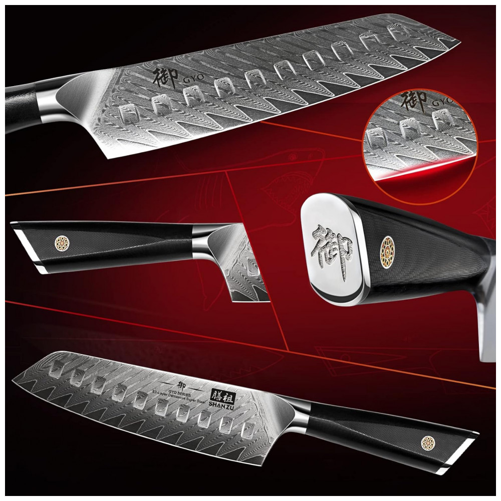 Significado de GYO: Há um gravado na tampa do conjunto de facas da série GYO. GYO significa Honra em japonês, SHAN ZU leva esse nome para buscar os mais altos padrões profissionais, pessoais e éticos. Honramos nossos clientes como o grupo que consegue distinguir entre materiais bons e ruins e, esperançosamente, obter seu reconhecimento