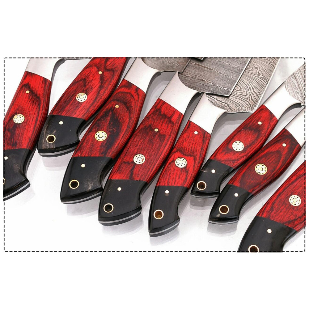 8 Pcs Damasco Steel Kitchen Oferecido por GladiatorsGuild para cozinha, Camping e Caça composta por cabo de madeira ou osso Personalizado ou feito à mão damasco aço faca de cozinha com um pedaço de chifre preto no final do punho Comprimento da lâmina para proteger o conjunto de facas de cozinha de Damasco, certifique se de limpar com um pano e aplicar ÓLEO VEGETAL após cada uso. Não deixe MOLHADO por muito tempo. zene o óleo o tempo todo. Quantidade por pacote de itens 8 Cor vermelho. Para proteger o seu conjunto de facas de cozinha de Damasco, certifique se de limpar com um pano e aplicar ÓLEO VEGETAL após cada uso. Não deixe MOLHADO por muito tempo. zene o óleo o tempo todo