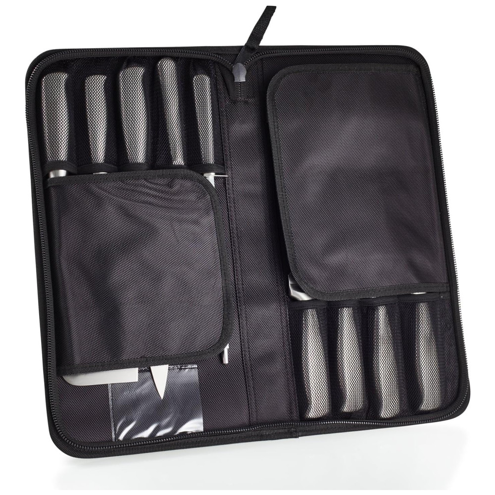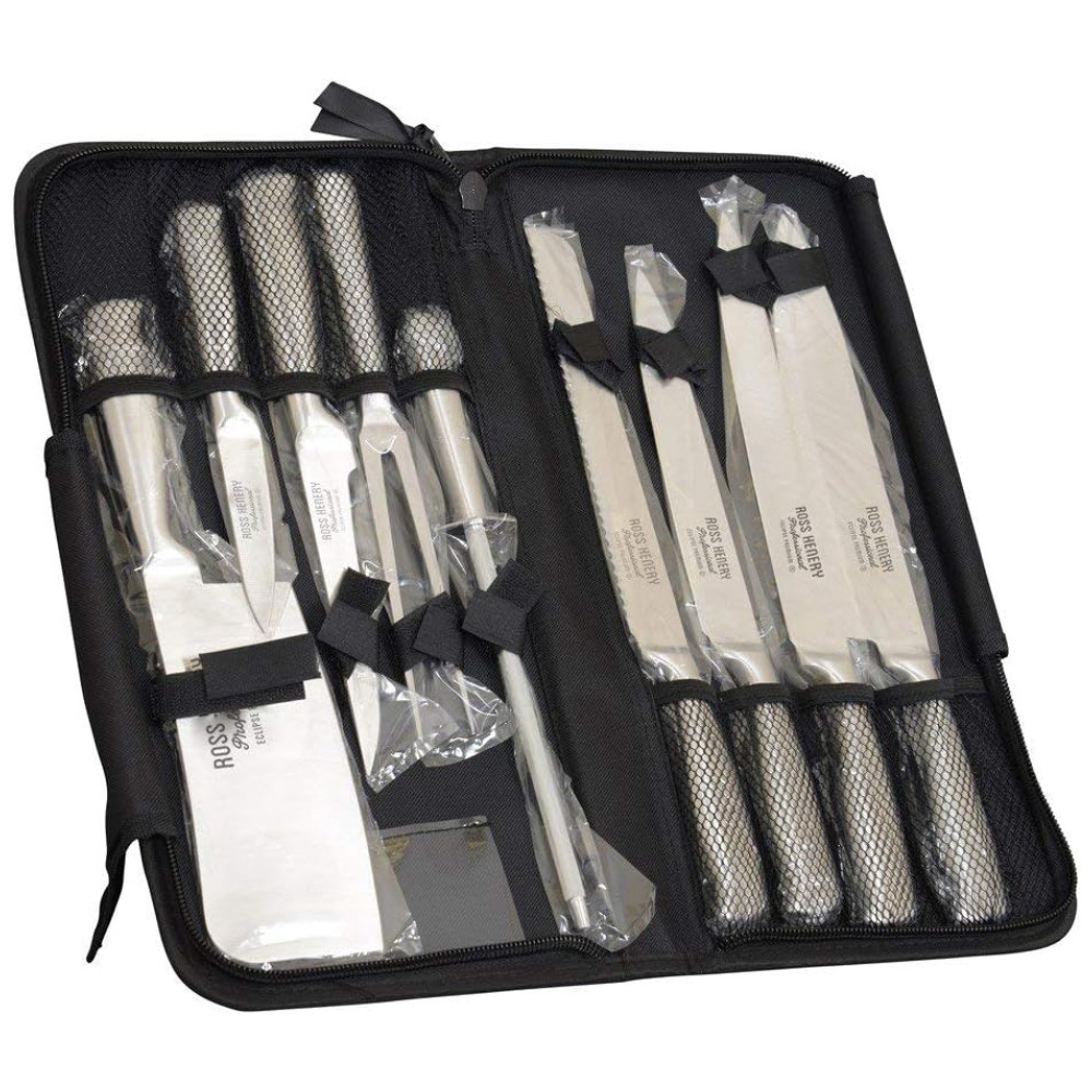 O 9 PIECE SET inclui faca de chef Faca de corte Faca de pão Canivete Faca de desossar Faca de aparar Haste de afiar cutelo de carne e garfo de trinchar em um estojo de zíper resistente. DURANTE O TRIPLO Depois de afiar as mãos na fábrica, as Facas Ross Henery Chef mantêm a nitidez da lâmina por meio de inúmeras preparações de refeições. Estes são acessórios de cozinha essenciais para qualquer chef em ascensão. O AÇO INOX CARBONO é impermeável à ferrugem e à corrosão, portanto as lâminas permanecem afiadas por mais tempo. Quando eles exigem uma nova aresta, nosso aço de afiação garante que suas habilidades de corte permaneçam no ponto. EQUILÍBRIO DE PRECISÃO com alças confortáveis formadas ergonomicamente, este conjunto de facas para chef oferece um controle incomparável para cortar, filetar e esculpir a alta gastronomia digna da Michelin em qualquer lugar. FAÇA E FAÇA EM MOVIMENTO com este conjunto de facas de viagem. As bainhas de proteção protegem cada peça, com o kit inteiro sendo protegido com segurança em uma bolsa de nylon com zíper para facilitar o transporte.