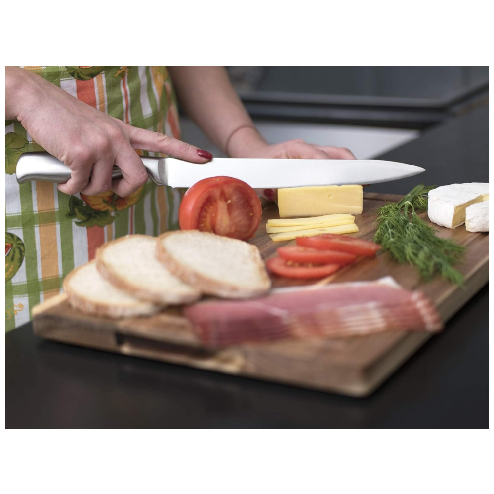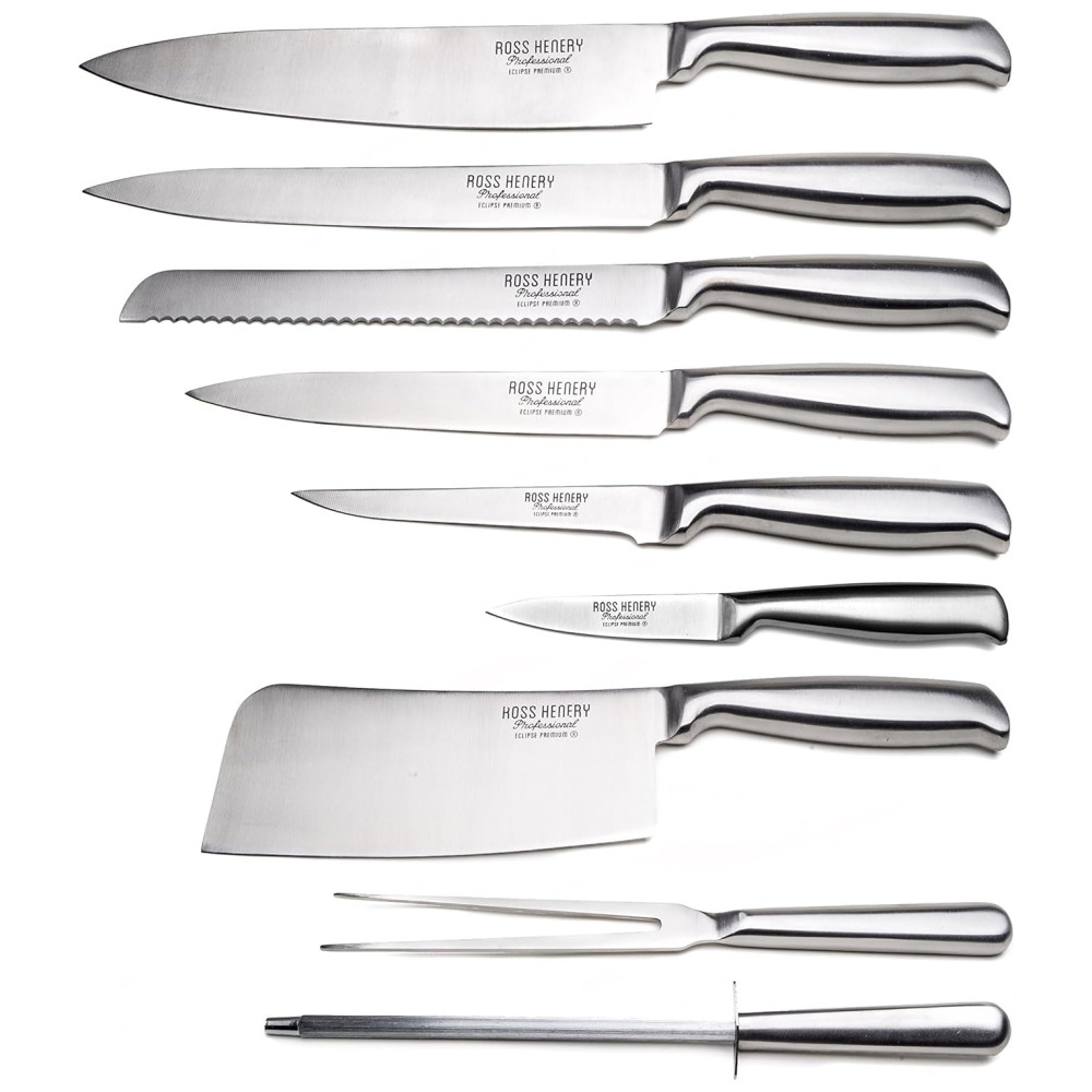 Este conjunto de facas Ross Henery Professional Eclipse Premium de 9 peças vem em um estojo de zenamento com zíper resistente, ideal para quem viaja com facas e é especialmente útil para estudantes de catering. Devido à vasta gama incluída neste conjunto e ao fato de serem forjados a partir de uma peça de aço inoxidável que elimina dilhas para alimentos e sujeira, oferecer o que há de melhor em segurança e higiene significa que são úteis para o chef profissional ou amador total, bem como para a casa doméstica ou estudante universitário. Este conjunto é feito de aço inoxidável 100, no entanto, é muito importante seguir o guia de cuidados incluído, evitar deixar as facas de molho e sempre secá las completamente antes de guardá las. As lâminas são nítidas e mantêm sua borda bem, um aço de afiação está incluído para que você possa manter as facas afiadas o tempo todo. O conjunto inclui os seguintes itens 1 x Faca de chef 1 x Faca para trinchar 1 x Faca para uso doméstico 1 x Faca para aparar 1 x Desossa para facas 1 x Faca para pão 1 x Afiação em aço 1 x Cutelo de carne 1 x Garfo de trinchar 1 x Estojo de transporte com zíper As facas são feitas de aço inoxidável de alto grau e alto teor de carbono e são projetadas para manter sua borda e durar muitos anos no futuro Ross Henery Professional, Cozinha Premium e Chefs