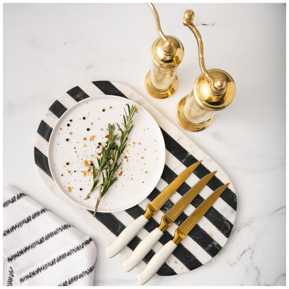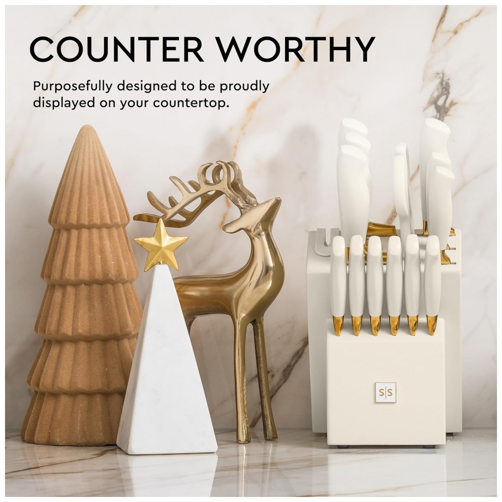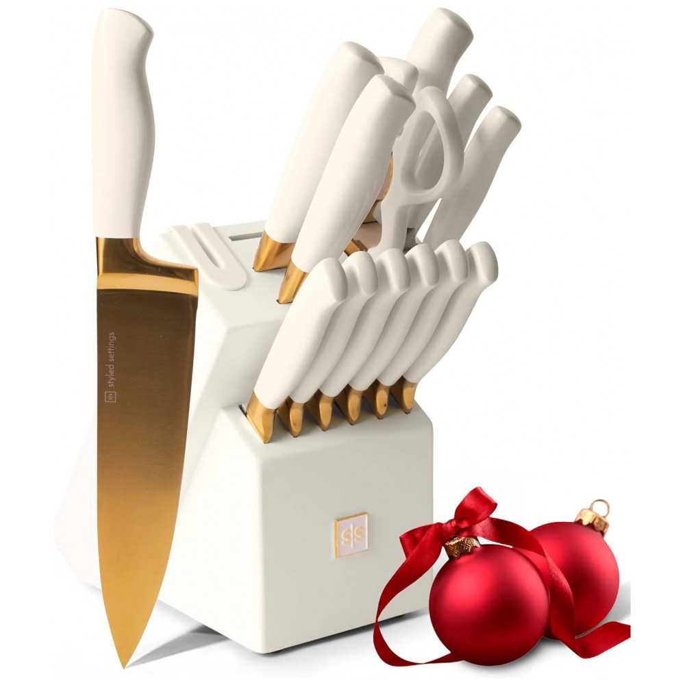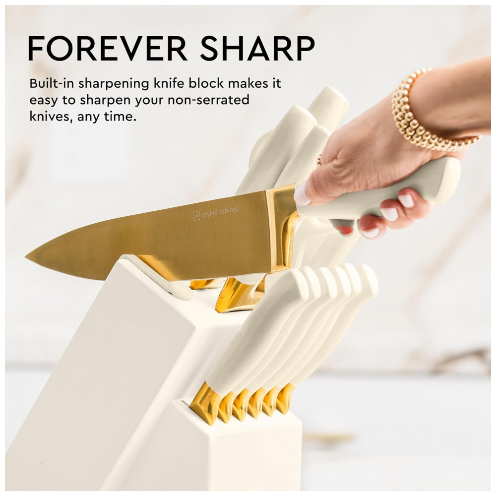 Conjunto de Facas Revestidas de Titânio com Bloco de Bancada e Afiador Embutido 14 Peças STYLED SETTINGS Branco e Dourado