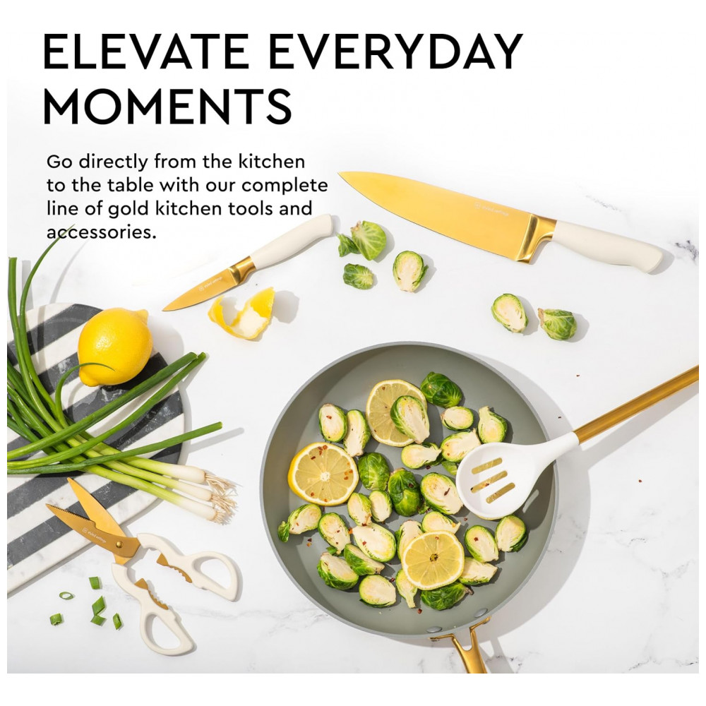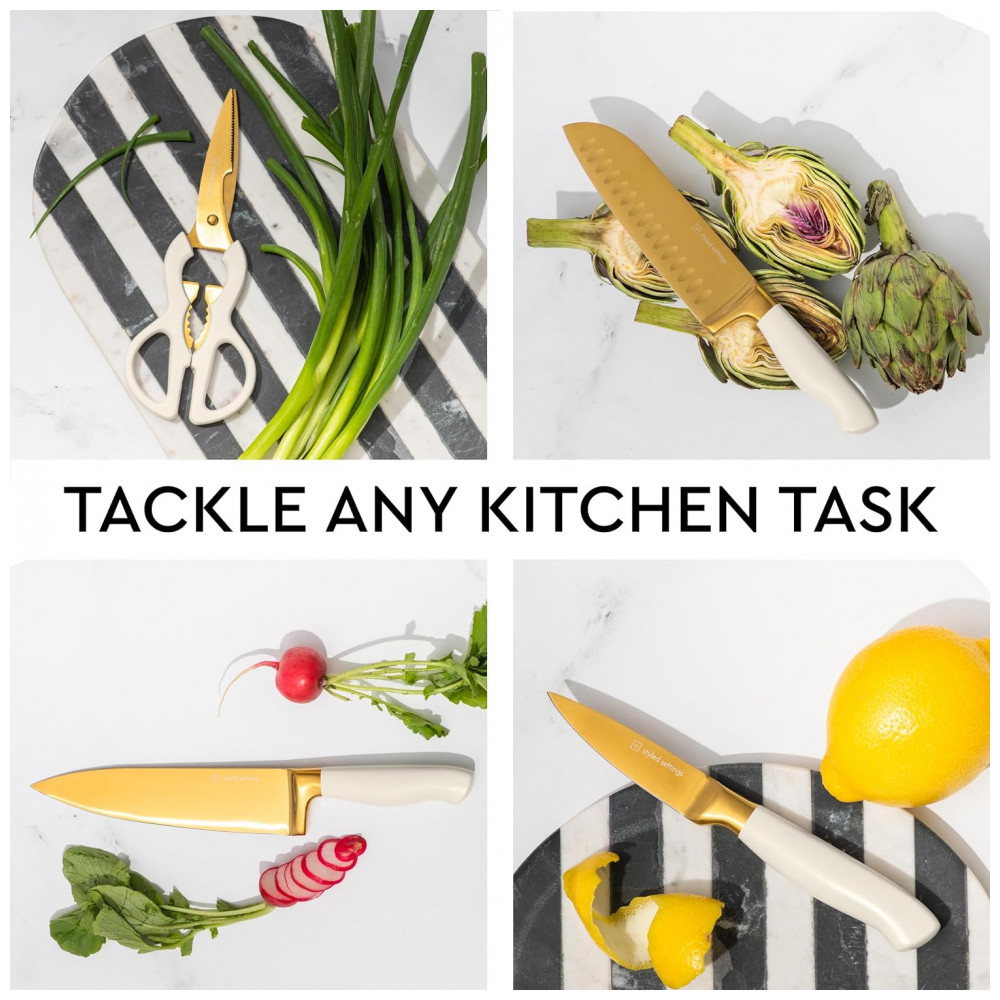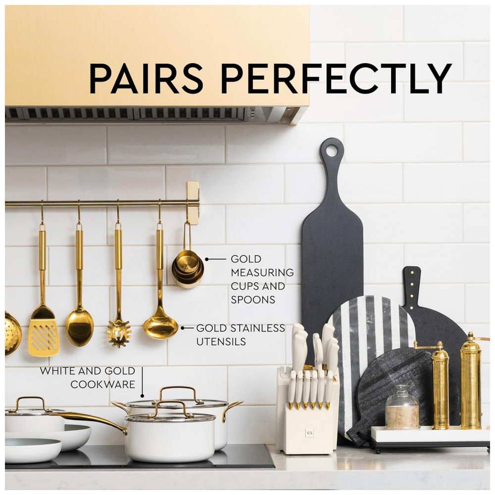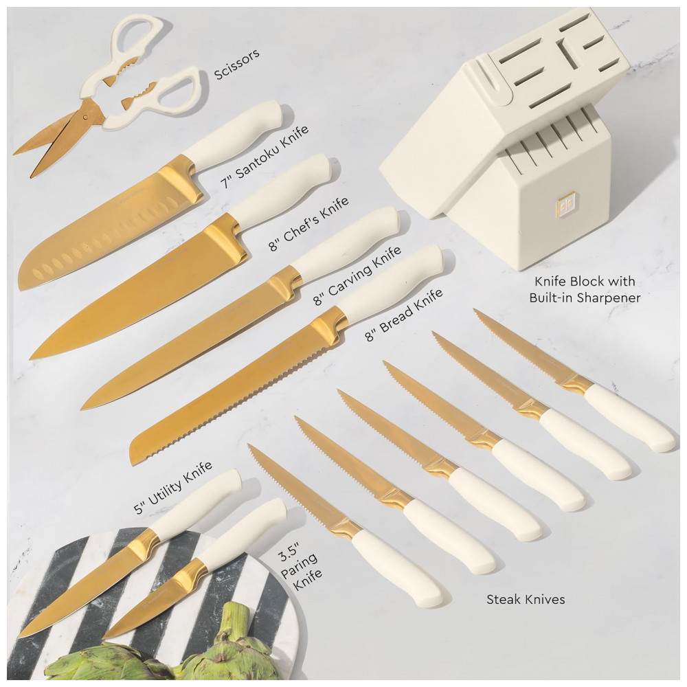 Eleve sua cozinha com este conjunto de facas douradas e brancas com bloco complemente a decoração e os acessórios dourados da cozinha com este deslumbrante conjunto de facas modernas de 14 peças com afiador O conjunto inclui: faca de chef, faca de trinchar, faca de pão, faca utilitária, faca de descascar, faca santoku, um conjunto de facas de bife brancas e douradas de 6 peças e tesouras de cozinha resistentes de aço inoxidável, tudo alojado em um conjunto de bloco de faca branco com apontador embutido