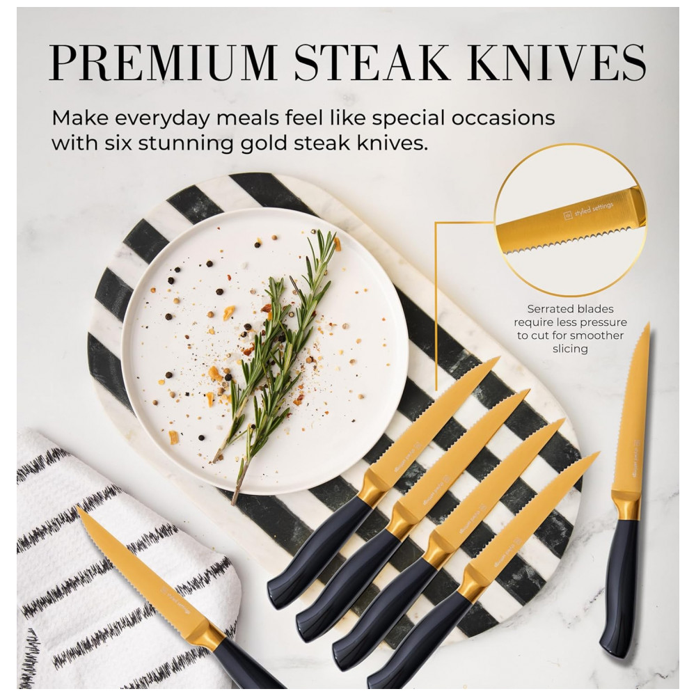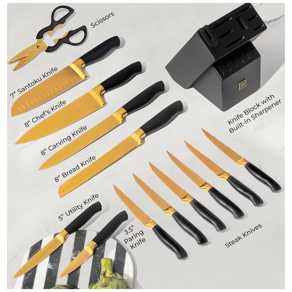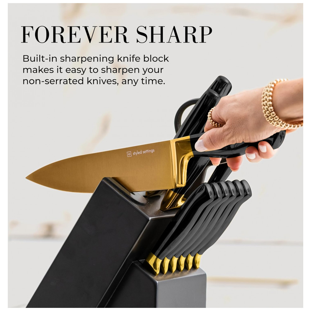 Conjunto de Facas Revestidas de Titânio com Bloco de Bancada e Afiador Embutido 14 Peças STYLED SETTINGS Preto e Dourado