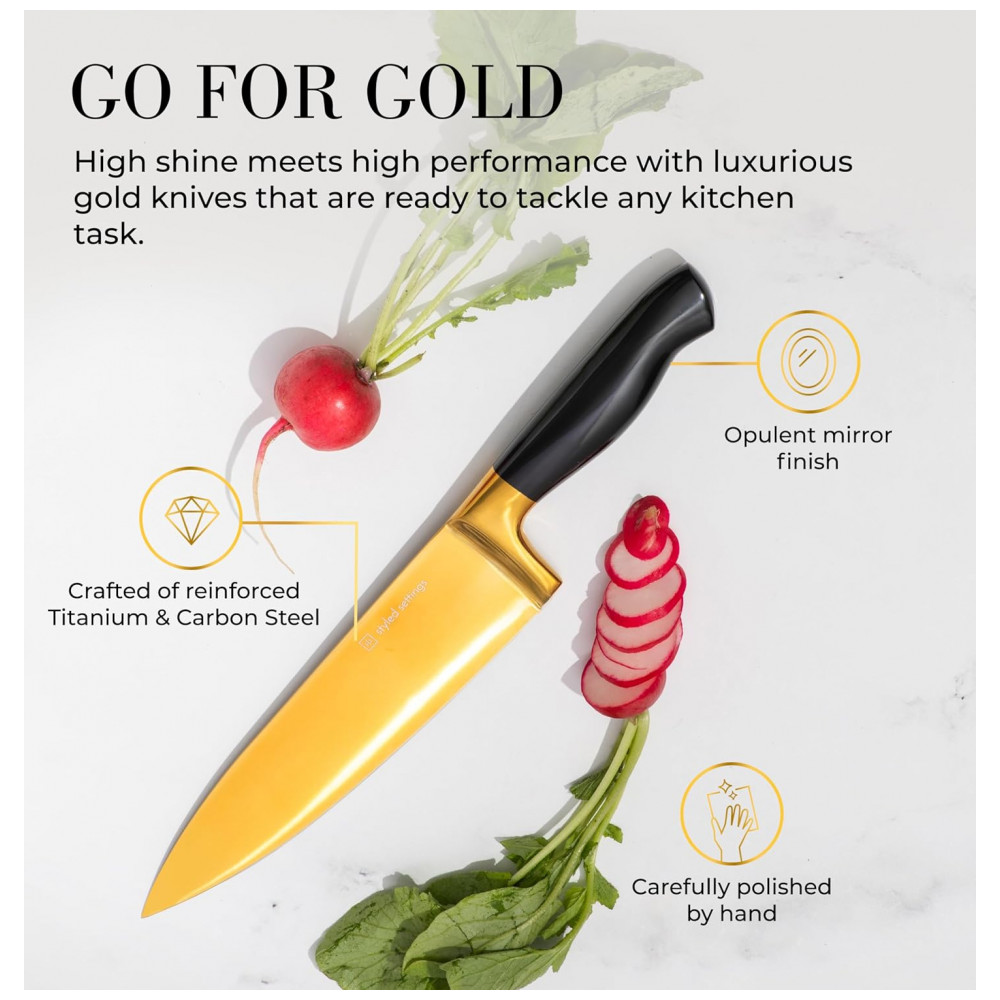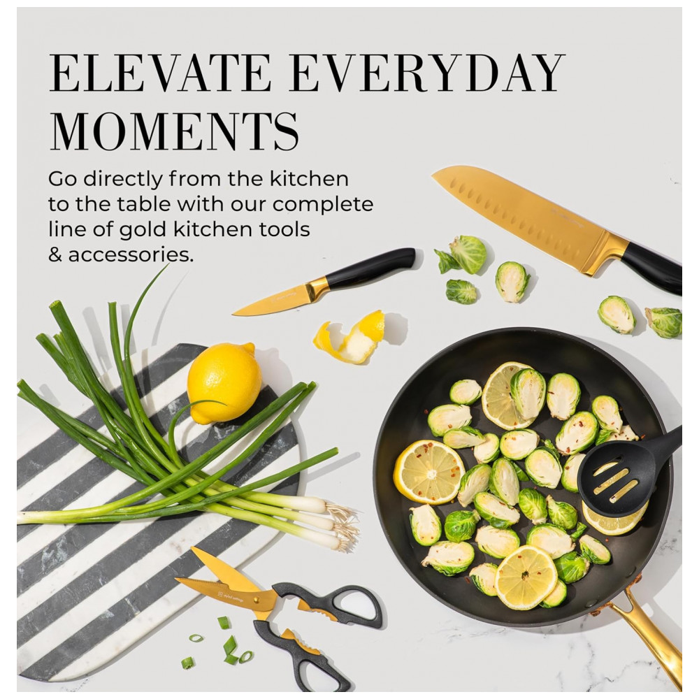 Eleve sua cozinha com este conjunto de facas douradas e brancas com bloco complemente a decoração e os acessórios dourados da cozinha com este deslumbrante conjunto de facas modernas de 14 peças com afiador O conjunto inclui: faca de chef, faca de trinchar, faca de pão, faca utilitária, faca de descascar, faca santoku, um conjunto de facas de bife brancas e douradas de 6 peças e tesouras de cozinha resistentes de aço inoxidável, tudo alojado em um conjunto de bloco de faca branco com apontador embutido